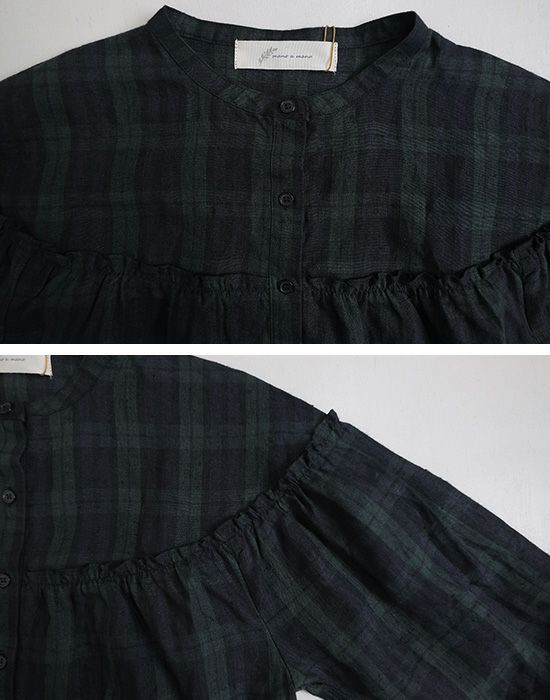 適度なハリのあるリネン素材。肩のラインで切替ギャザーを施し、アクセントを加えた1枚。1枚で着こなしても存在感あり。