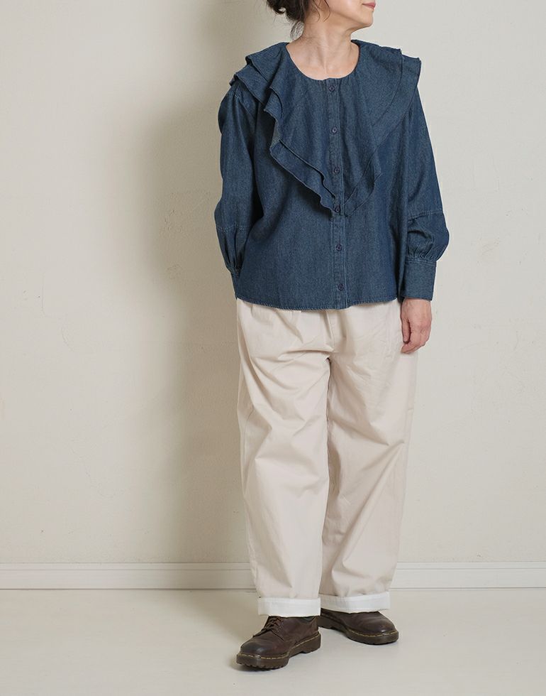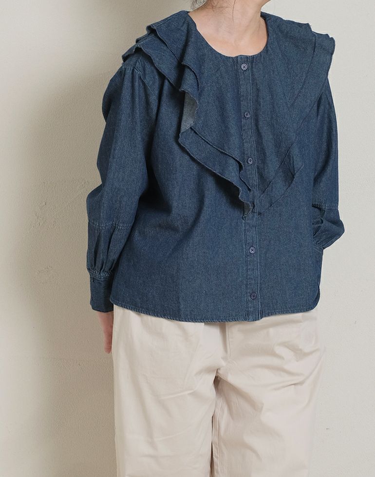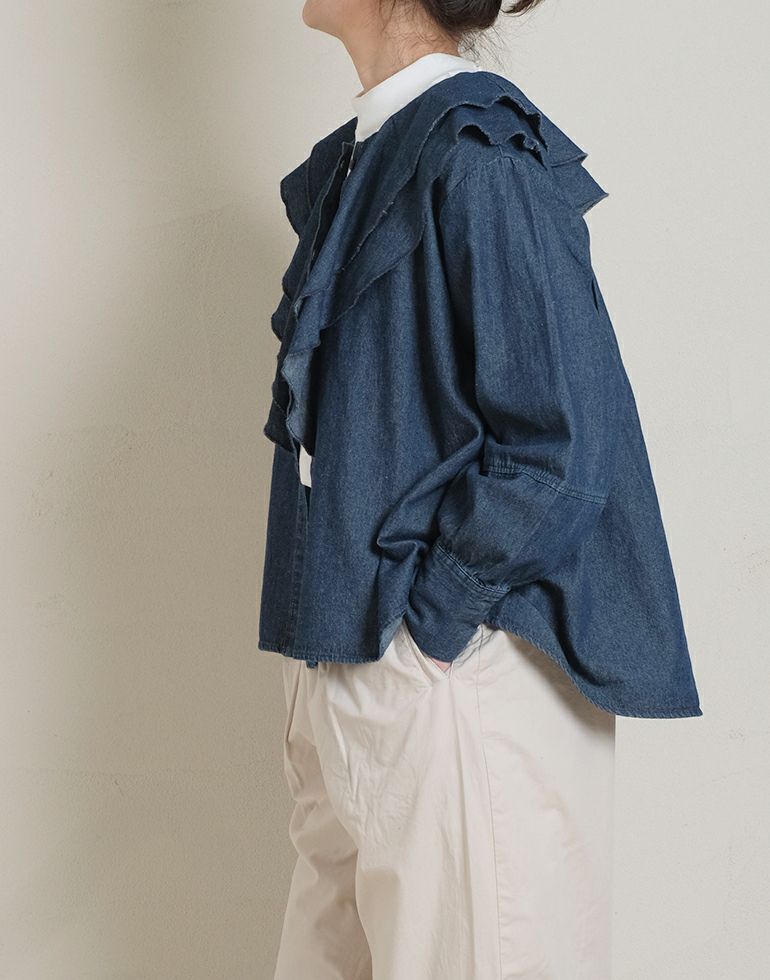 適度な厚みのあるデニム素材。デコルテ周りのラッフルカラーがが上品でいて女性らしさをアピールしてくれます。袖は切替を施し、ふっくらと広がりつつ袖口のカフスでキュッと引き締め丸みのあるシルエットで可愛らしさを。前ボタンを開き羽織としても着こなせます。
