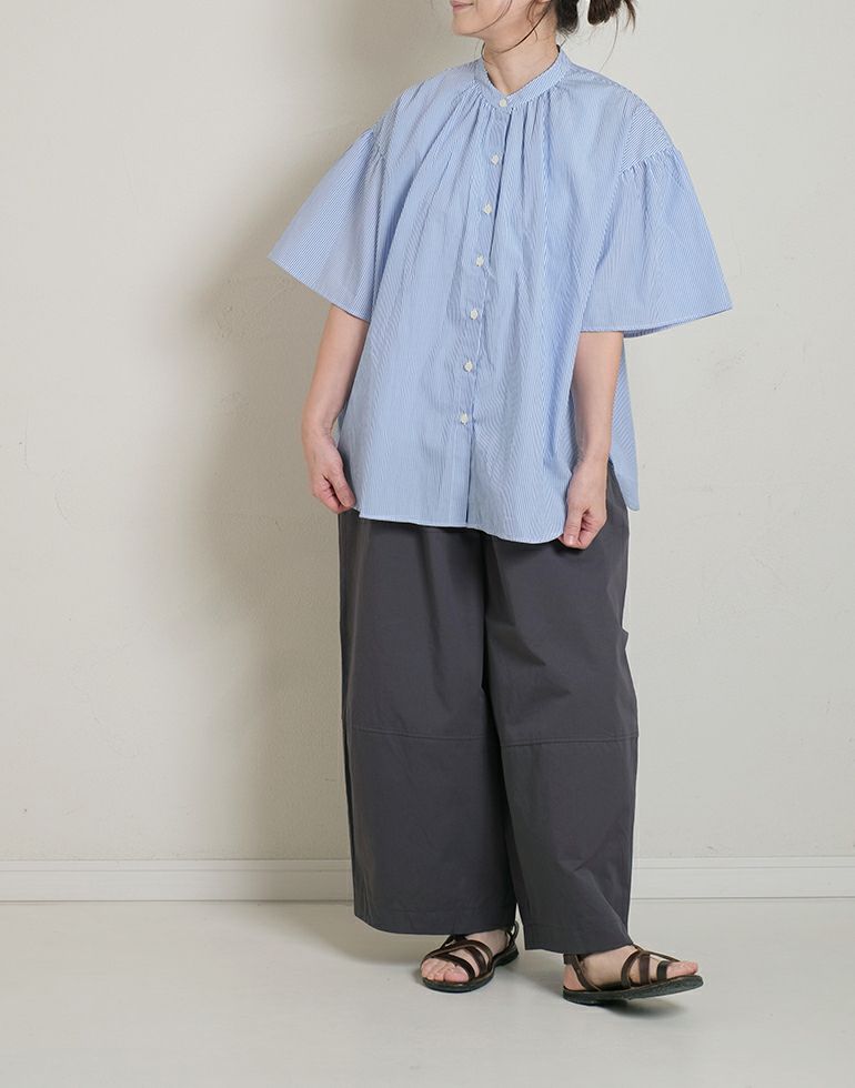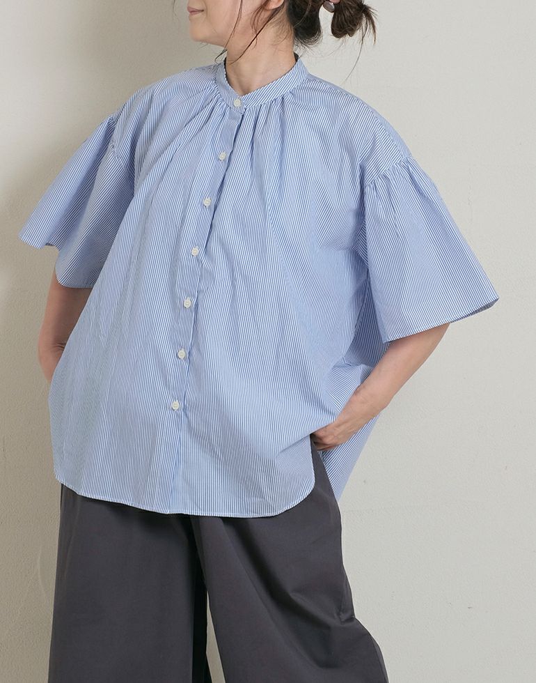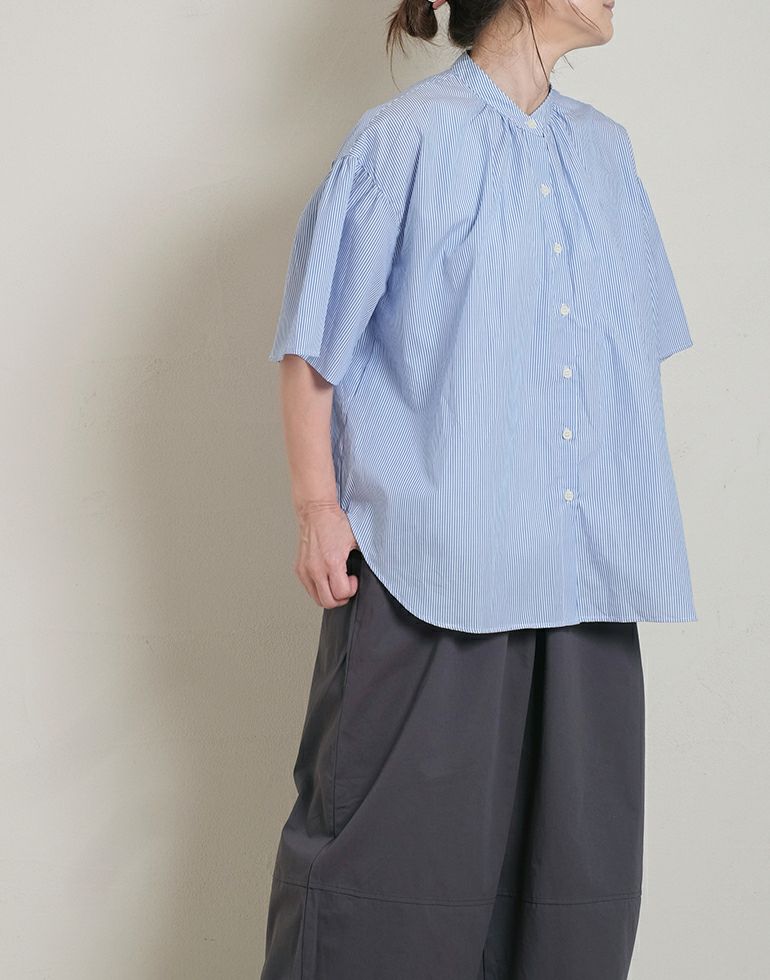 さらっとした肌触りに軽い着心地のコットン素材。肌に触れない程よいゆったりサイズが暑い時期も快適な着心地に。袖はフレアーシルエットで動くたびにふわりと揺れる動きのあるデザインが可愛いです。背中は切替を施し細かくギャザーを寄せ女性らしい印象に。