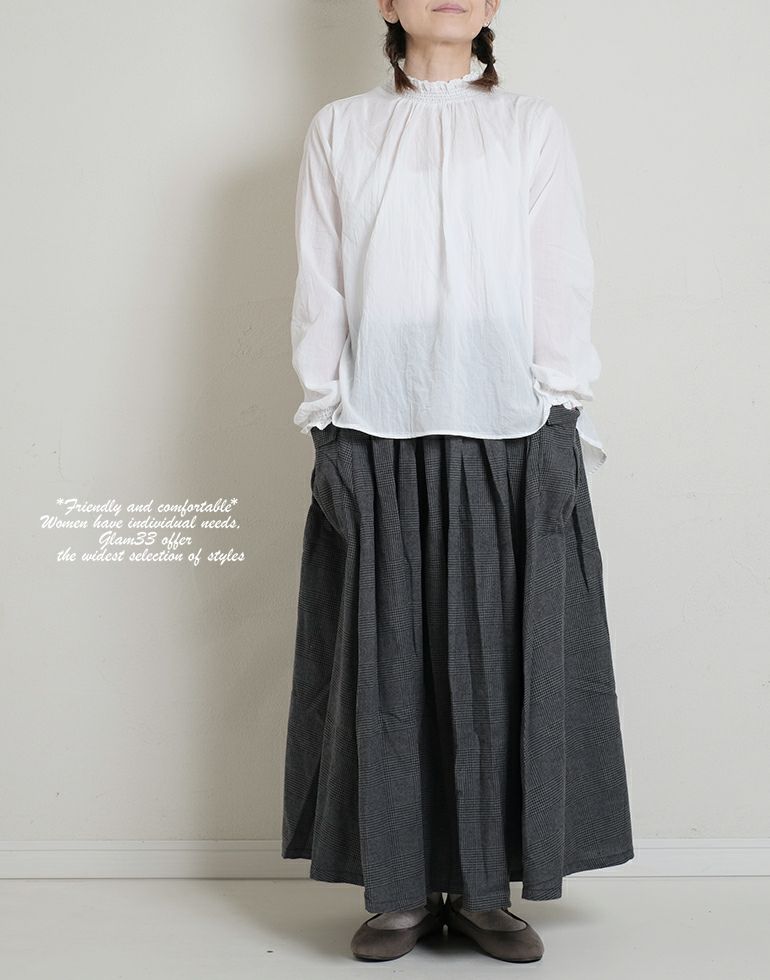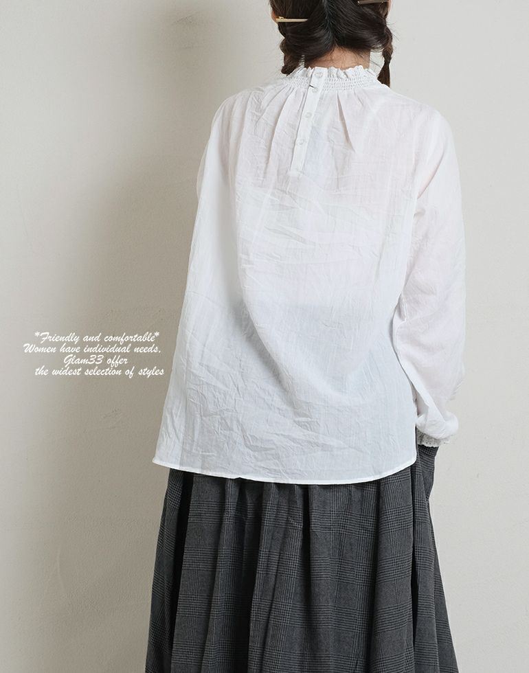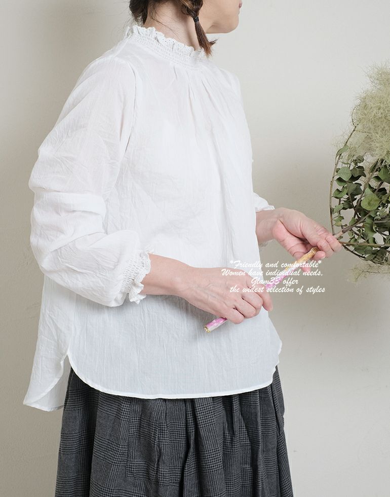 ナチュラルな風合い感に自然なシワがいい味を出してくれています。さらりとした薄手の綿素材。ネックと袖口はシャーリングゴムにレースをあしらって上品で甘い印象に。前後差のある丈はコーディネートのバランスが取れやすく、丸みのある裾やさしい雰囲気に仕上げてくれます。
