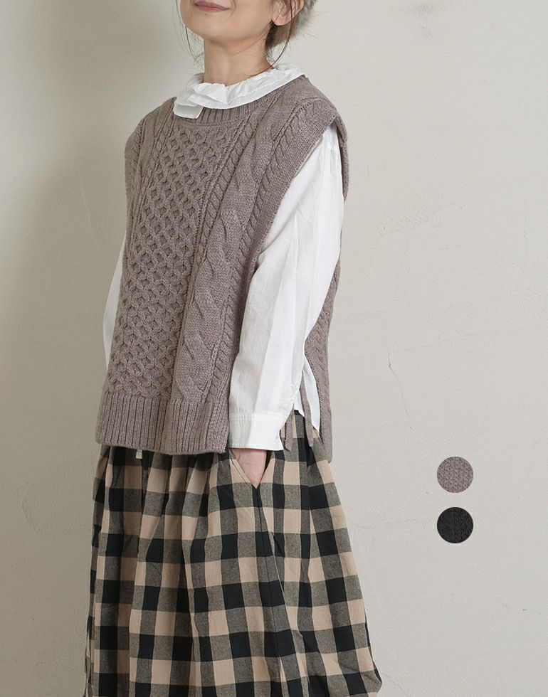 ウール混のふっくら・暖かニット。立体感に拘ったアラン柄がワンポイントとなります。贅沢に全面編地が施されてあります。ナチュラル感のあるほっこりした印象のベスト。サイドオープンなのでインナーを選ばず幅広く着用できます。