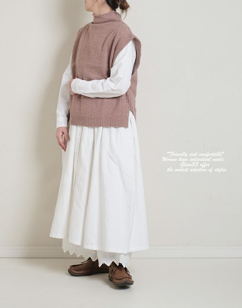 ふんわりもっちりした暖かい肌触りのウール混素材。ちょこっとハイネックがワンポイント!裾スリット入りで動きを。肩に少しかかるドロップショルダーにタテラインの編地が可愛いです。
