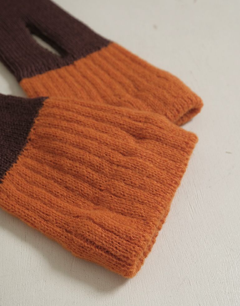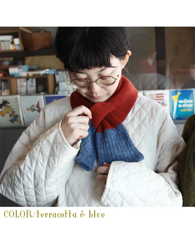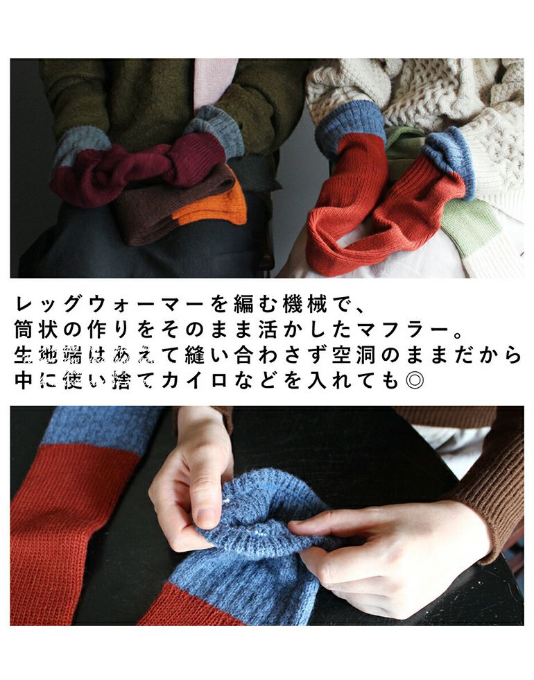 【アンゴラ混バイカラーアームウォーマー】と同じ糸を使って編んだ肌あたりのやさしいマフラーです。ふっくら暖かく肌触りが心地良く、チクチク感も少ないウールを使用。嵩張りにくく、薄手で軽くあたたかいショート丈マフラー。首元にくるっと巻き、通し穴付きで装着もラクラク、ずれたりほどけたりせずコンパクトな着け心地です。シンプルな筒状の編み立てており、生地端は縫い合わせてふさいでいない作りなので、内側にカイロを入れて首元を温めることもできます。バイカラーが可愛いデザインのマフラーは冬場の暗めの色になりがちなお洋服のコーディネートの差し色にぴったりです。 洗濯機で洗えて、お家でお手入れできて便利!