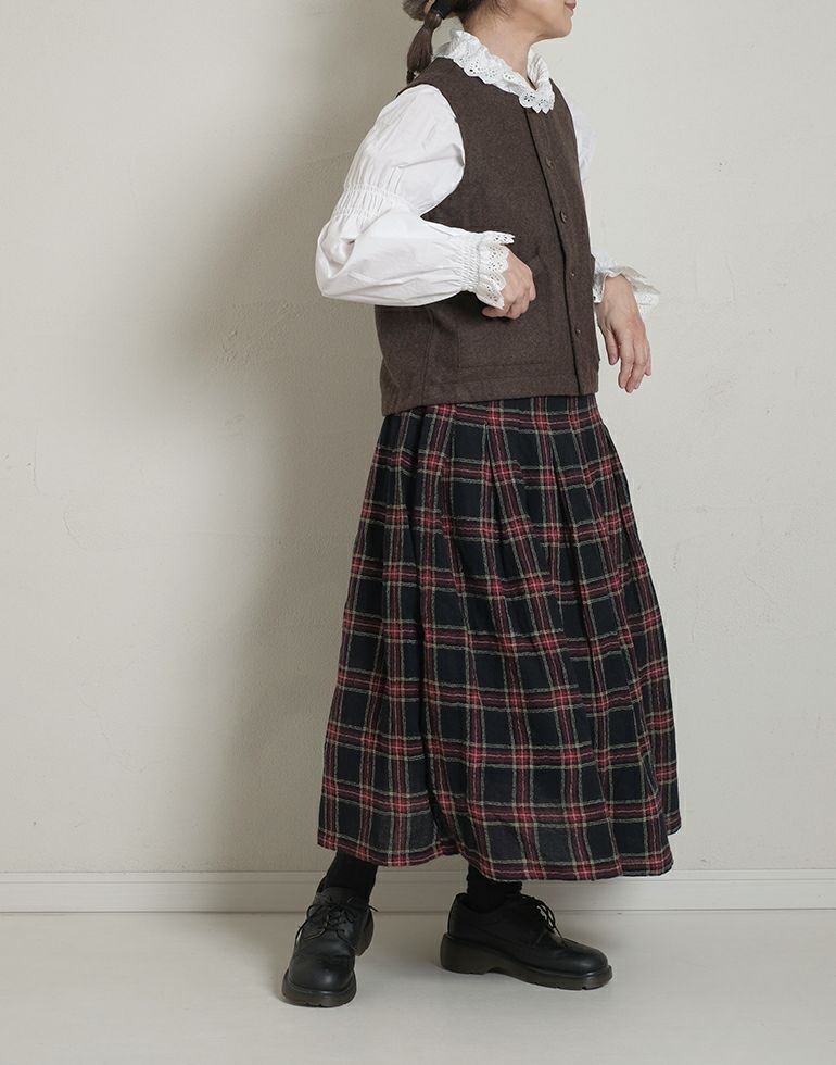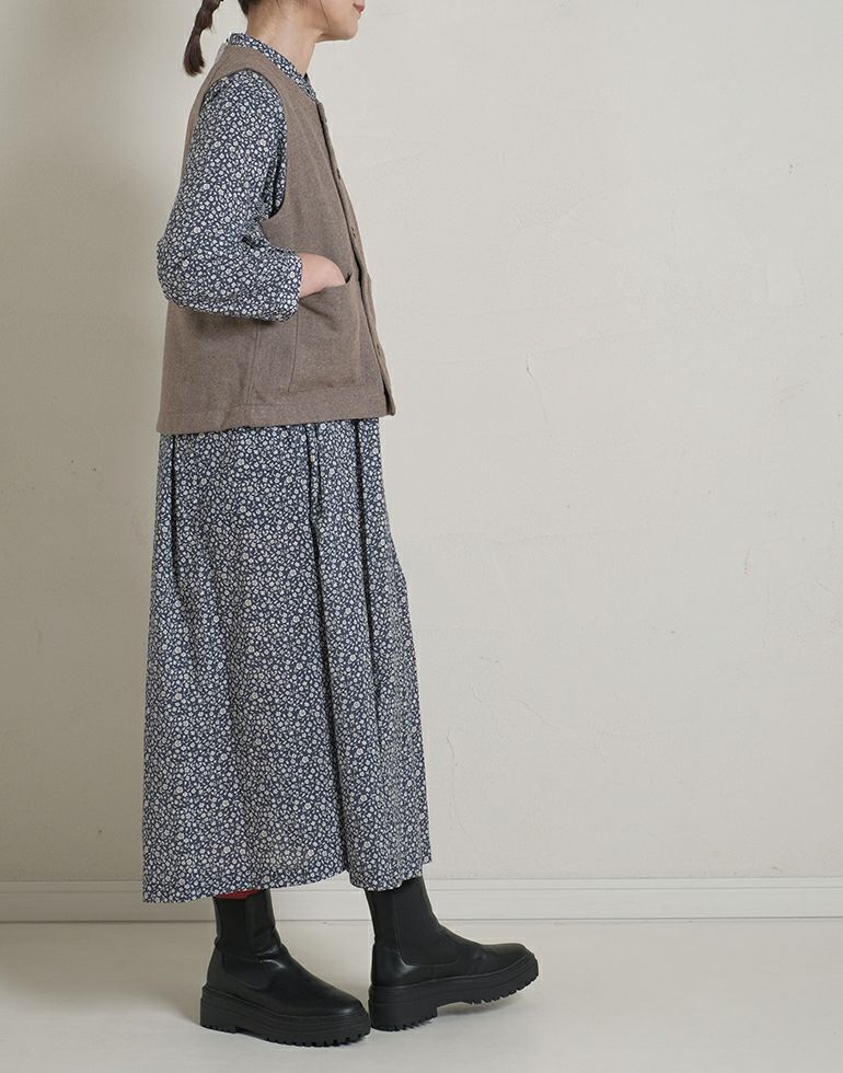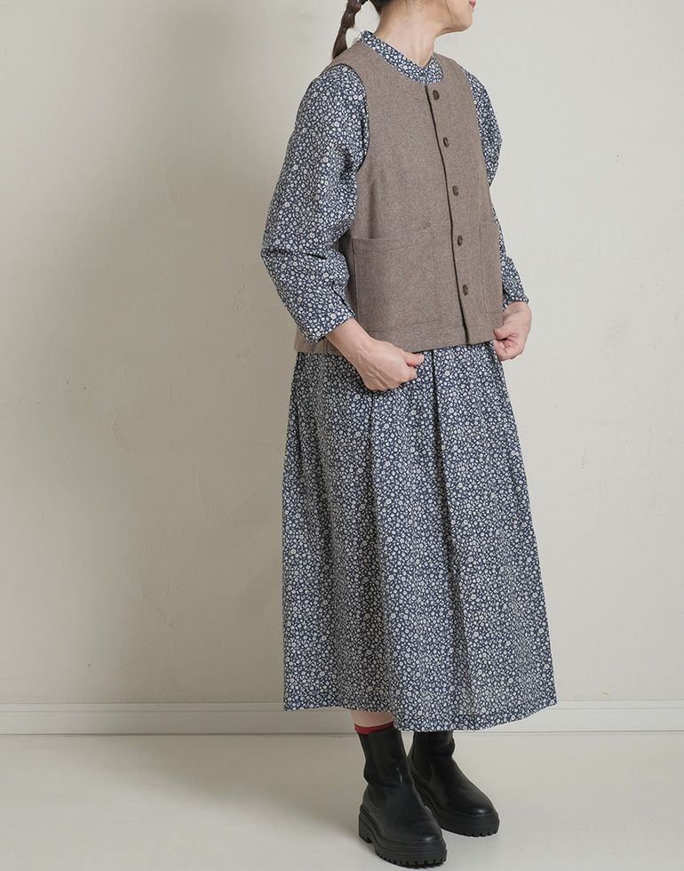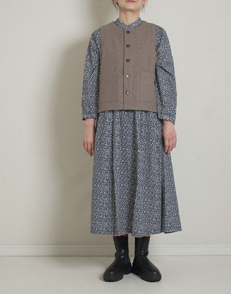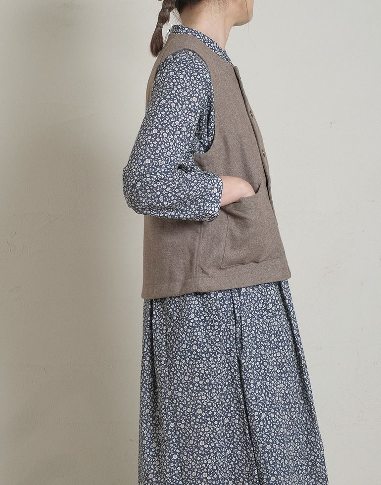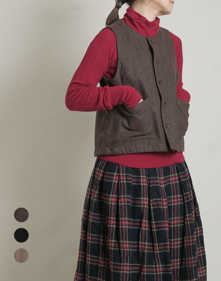 ほんのり温かみのあるウール混素材。フロントボタン仕様でベーシックなデザインでどんなアイテムとも高相性です。フロントについたポケットもワンポイントとなります。重ねるだけでこなれた雰囲気に。