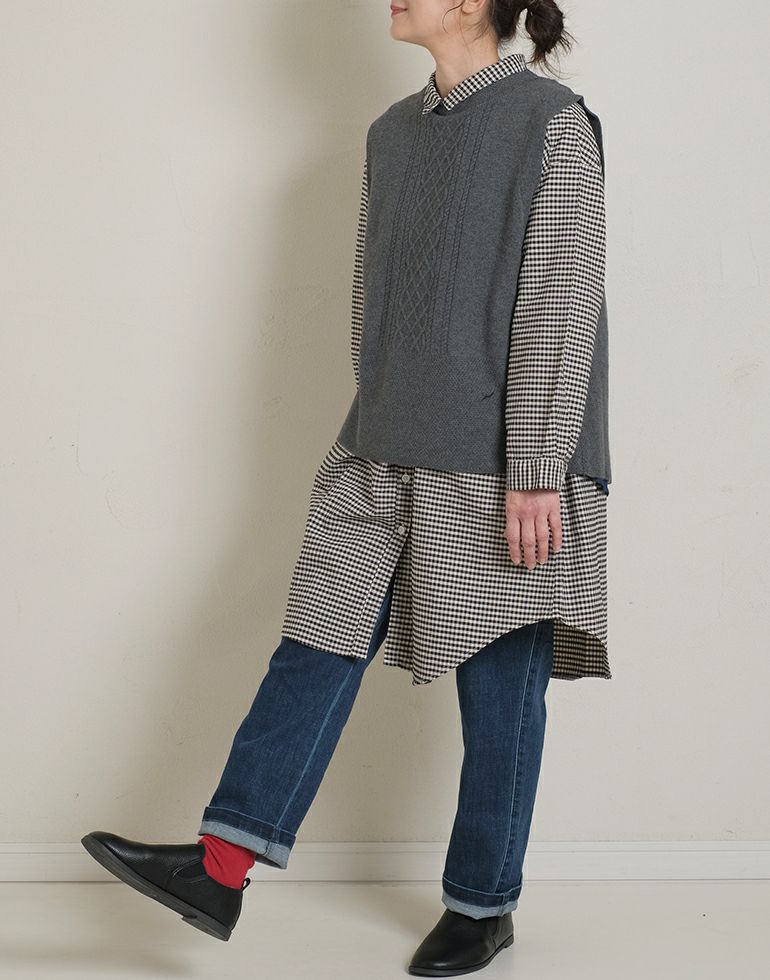 ふんわりもっちりポリエステル混素材。 前身頃のケーブル編みがナチュラルな印象に。襟ぐりと身頃裾はカノコ編みで表情豊かになっています。後身頃はシャンブレーの薄く軽い素材を裏地にしています。洗濯機でお洗濯可能。