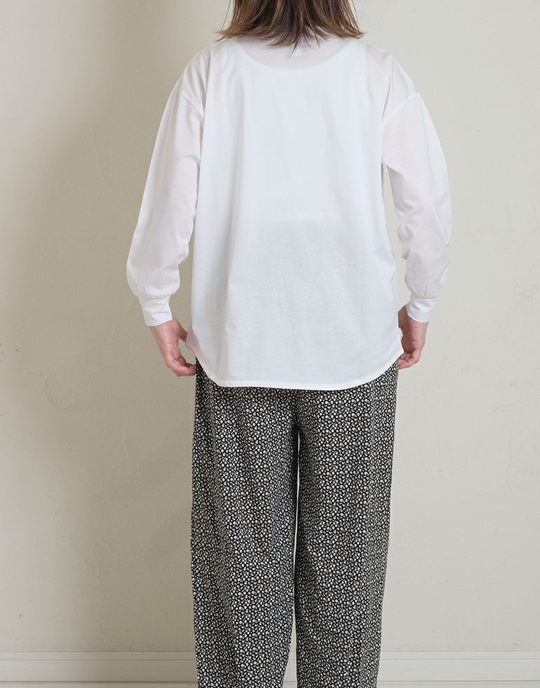 軽くてつるっとした表面にやや光沢のある柔らかい風合いのハイゲージカットソー。カジュアルになりがちなカットソーと違いきちんと見栄えのする上品なプルオーバーです。前身頃にあしらった立体感のあるフリルデザインも落ち着いた雰囲気でアクセントとなってくれます。前後差丈でメリハリを出しラウンド裾でヌケ感を。デニムパンツ合わせでもスカート合わせでも大人の品のある雰囲気を醸し出してくれる主役級のアイテムです。