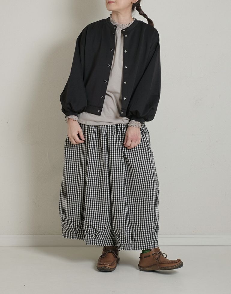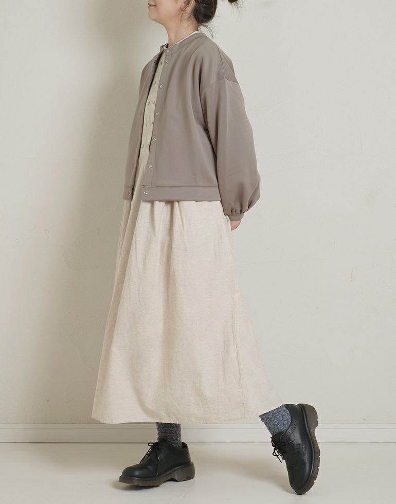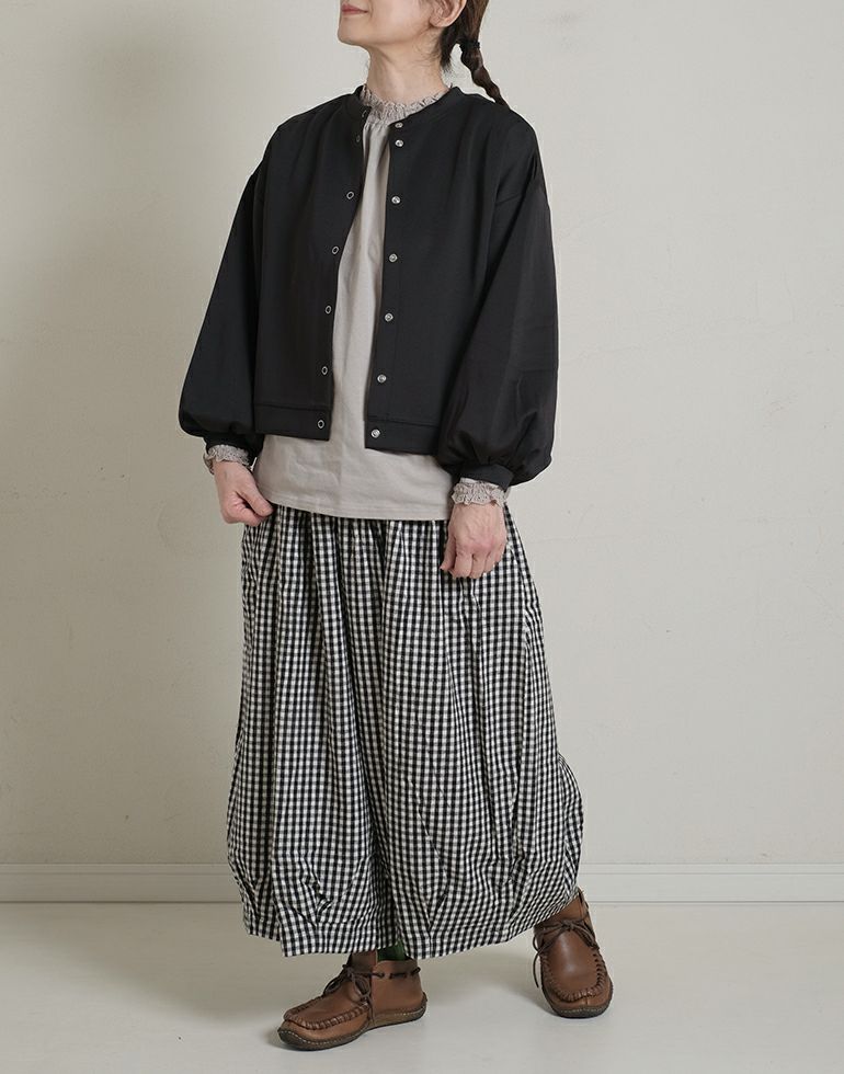 なめらかで光沢感のある軽いポリエステル混素材。カーデ以上のジャケット未満のデザインで女性らしいデザインとなっています。ぽわんとした袖のシルエットが大人可愛い雰囲気に仕上げてくれます。 【モデル身長 / 着用サイズ】160cm / M~Lサイズ