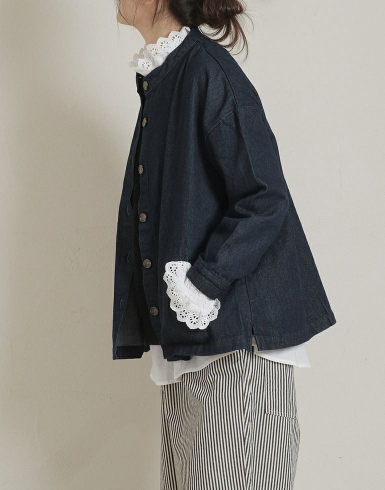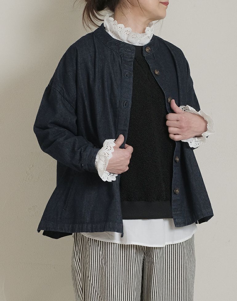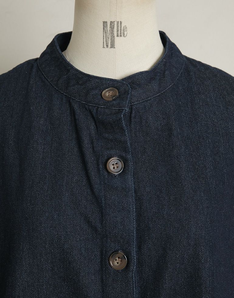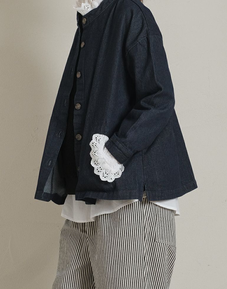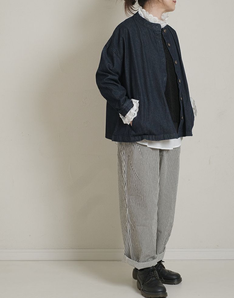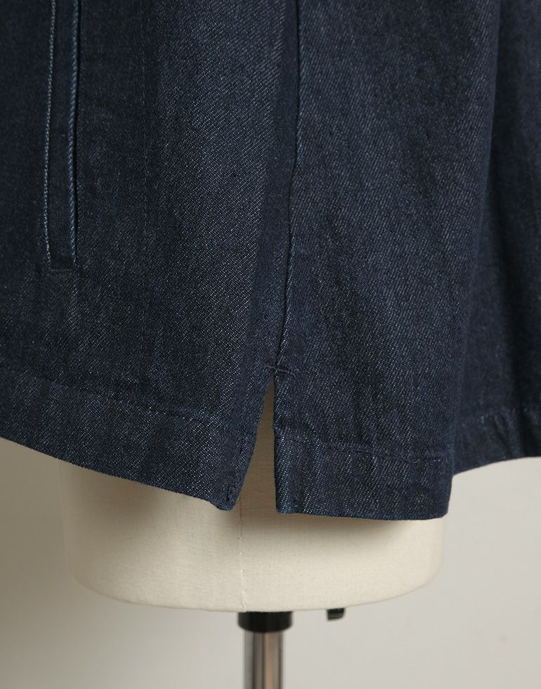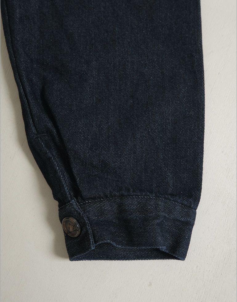 適度な厚みの11ozデニム素材。ゆったりした身幅にドロップショルダーでこなれた雰囲気に。 ポケットのステッチワークなどカジュアルなデザインも加えつつ、全体的に上品にまとまってくれる優秀な1枚。 袖口はタック入りでやわらかい印象をプラスしてくれます。程よいゆるさがヌケ感とこなれ感を演出してくれます。長い期間楽しめて重宝する1枚です。幅広いスタイリングで楽しめるのも魅力です。