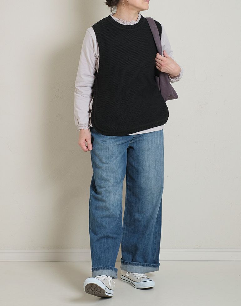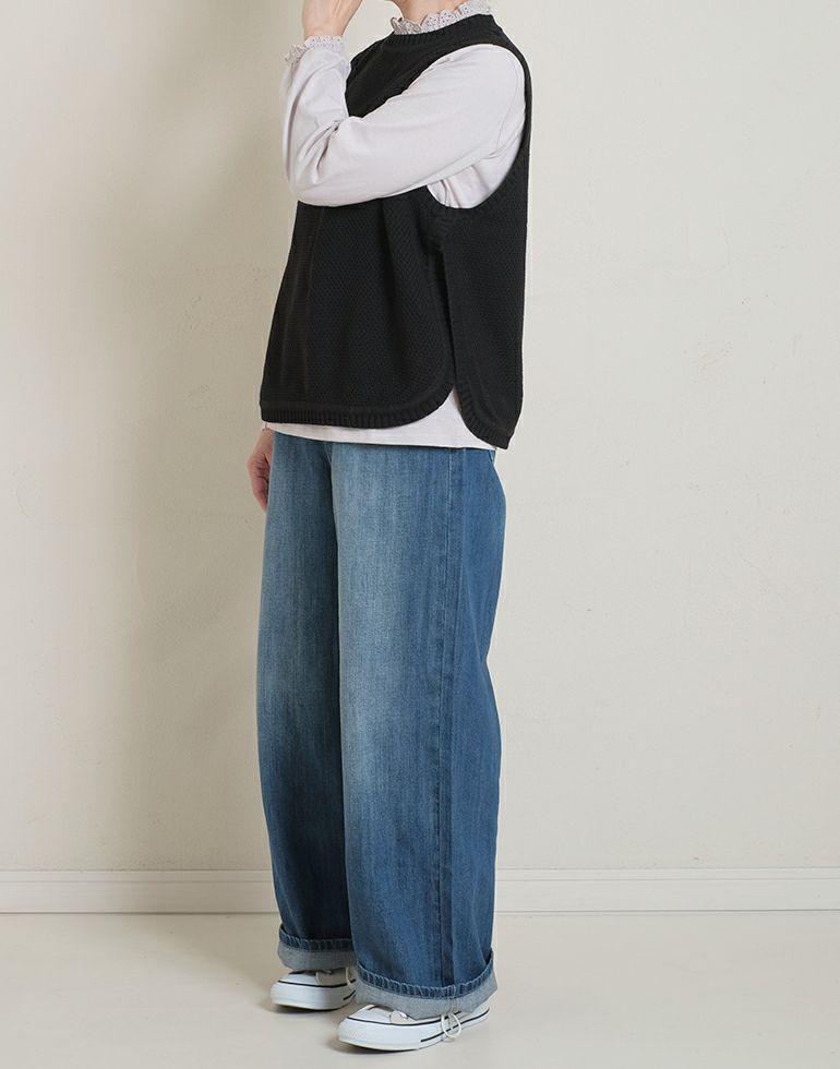 程よい厚みの軽さのあるデニム素材。ウエスト総ゴムにフロントの紐でサイズ調節可能。ゆったりとしたシルエットが魅力のワイドデニム。太ももから裾にかけてたっぷりとボリュームを持たせることで、動きやすく、リラックス感のある穿き心地を実現。季節問わず使えるオールシーズン対応でどんなアイテムとも好相性!タイトなトップスと合わせればメリハリのあるスタイリングに、オーバーサイズのシャツやスウェットと合わせて今っぽいルーズスタイルも楽しめます。定番だからこそ、一本は持っておきたいアイテムです。