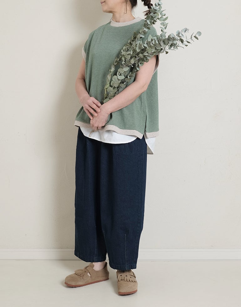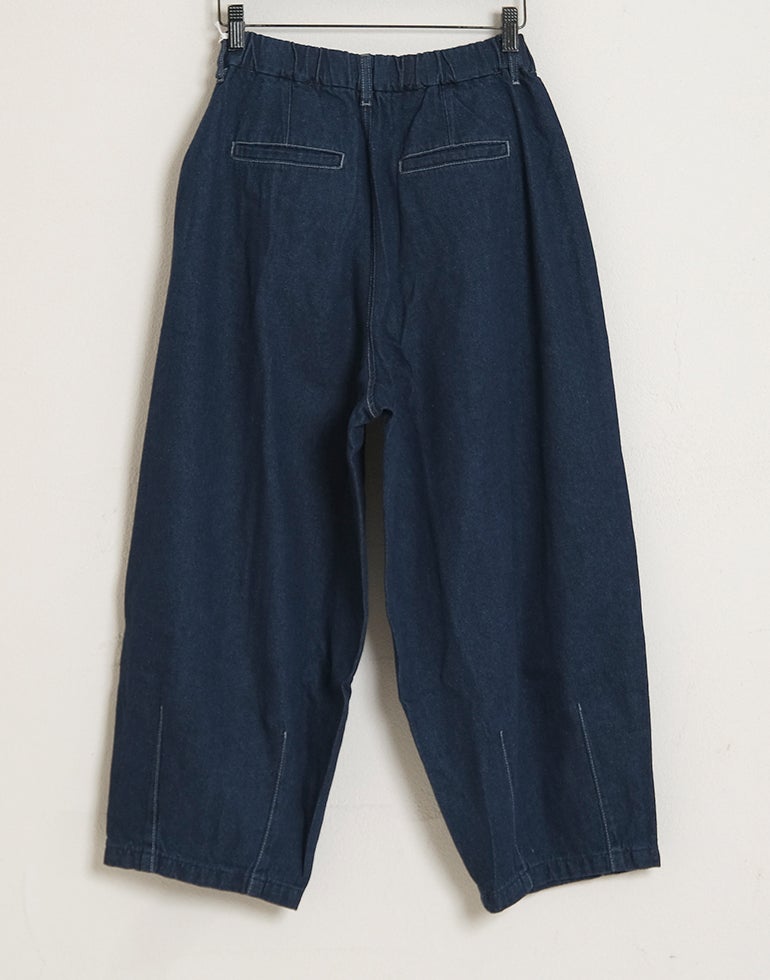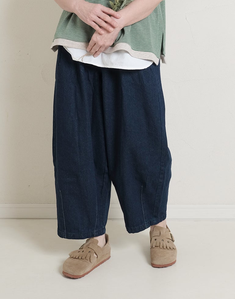 やわらかくこなれたコットンデニム素材。ウエストは総ゴムにフックとファスナー開きとなっています。ヒップや太もも周りのラインを隠すたっぷりのボリュームがありながら、裾が絞られているため足元がすっきり見えます。ウエスト下にタックをとり立体的に。裾にはダーツを加え、裾に向かってシェイプしていきメリハリを表現。リラックス感とオシャレ感を叶えてくれる1枚です。