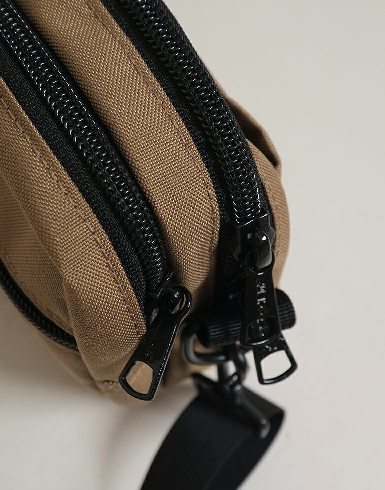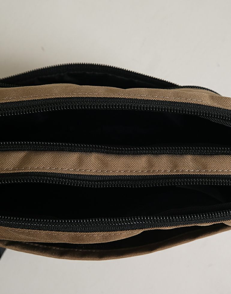 コーデュラナイロンは引き裂き強度・耐摩耗性に優れており、ポリエステルに比べ柔らかい触り心地が特徴です。ナイロンそのものの撥水性に加え、裏側にポリウレタンコーティングを施してあるので、完全にとは言えませんが水の侵入を防いでくれます。生地の裏が見えないようにポリエステルの裏地が付いて、肌触りがいいだけではなく、万が一ポリウレタンコーティングが劣化しても使えるようになっています。本体は合計3つのファスナー付きポケット、小分けにとても便利なつくりも魅力です。内側には小物類を見つけやすく、管理できるポケットを配置、背面にはマジックテープで止めるスリーブが付いています。ショルダーベルトは簡単に取り外せてポーチやバッグインバッグとしても活躍してくれます