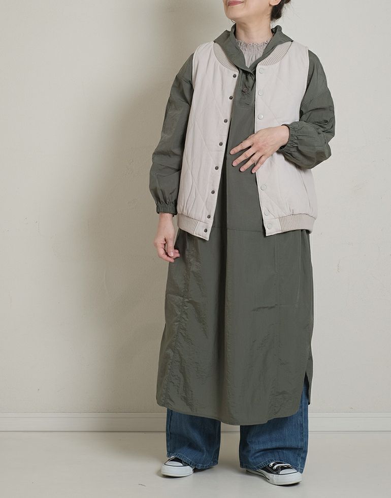 軽やかでサラッとしていて肌離れのいいナイロン素材。シャカシャカっとした空気を含んだようなやわらか風合いが着心地いいです。両裾はスリット入りでラウンドしたデザインになっており足元軽快なスタイリングに。パンツとの重ね着でカジュアル感のある着こなしがおすすめです。インナーを変えることで長いシーズン着こなせます。フロントに付いた大きなポケットがワンポイントとなっています。デイリーにもアウトドアファッションにも最適です。