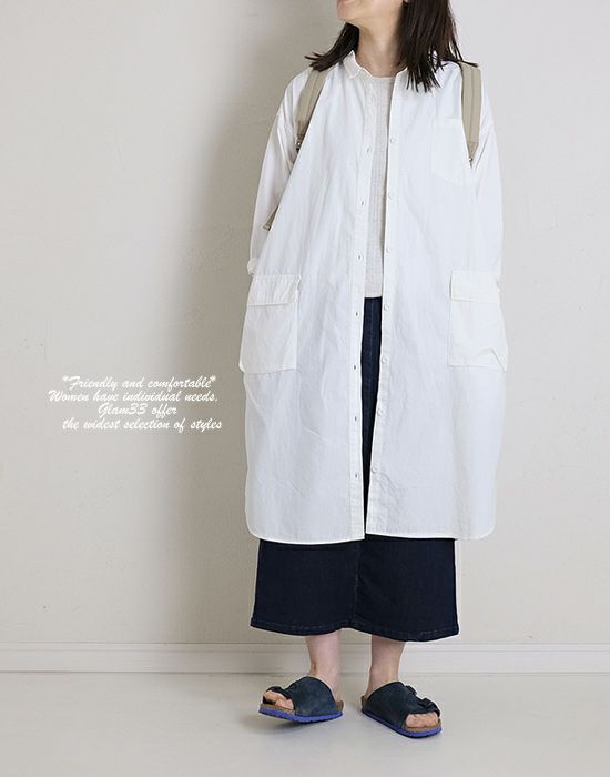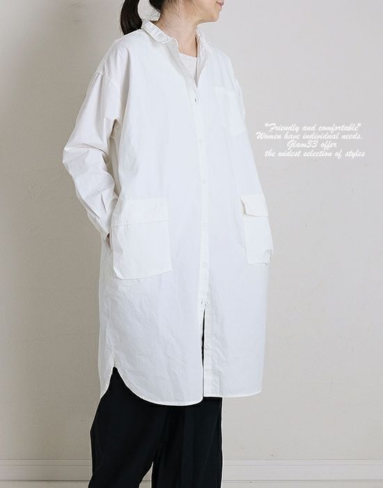 コットンのさらっとした柔らかな肌触り素材。シンプルな中に、立体ポケットや袖にタックをを加えたりと、動きやすさとアクセントのあるデザインに。バッグのタックデザインもこなれた印象に。長すぎず短すぎずの着丈感が、着こなしやすくチュニックとして軽い羽織としてコーデの幅が広がる1枚です。