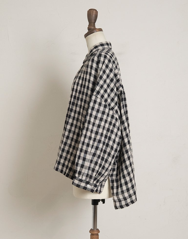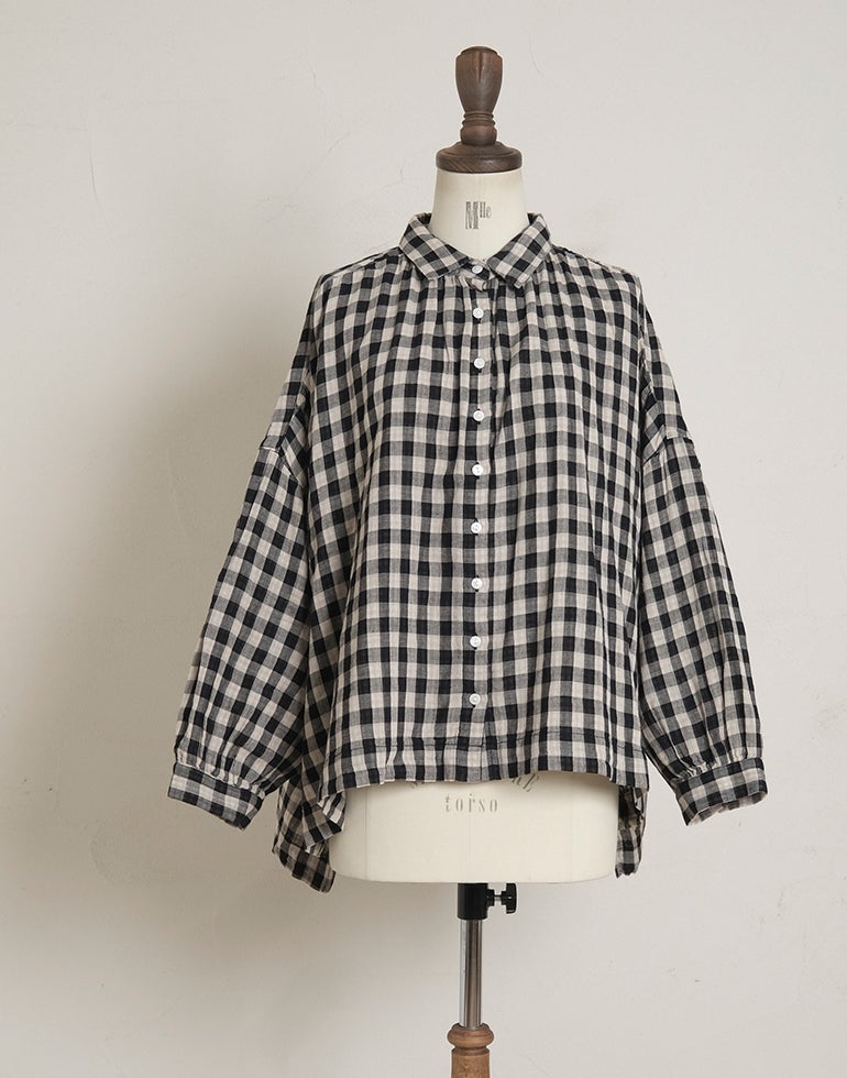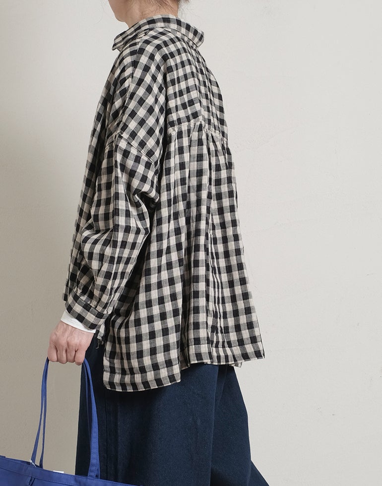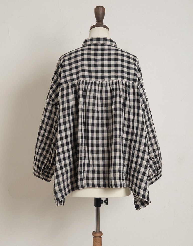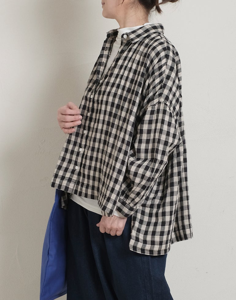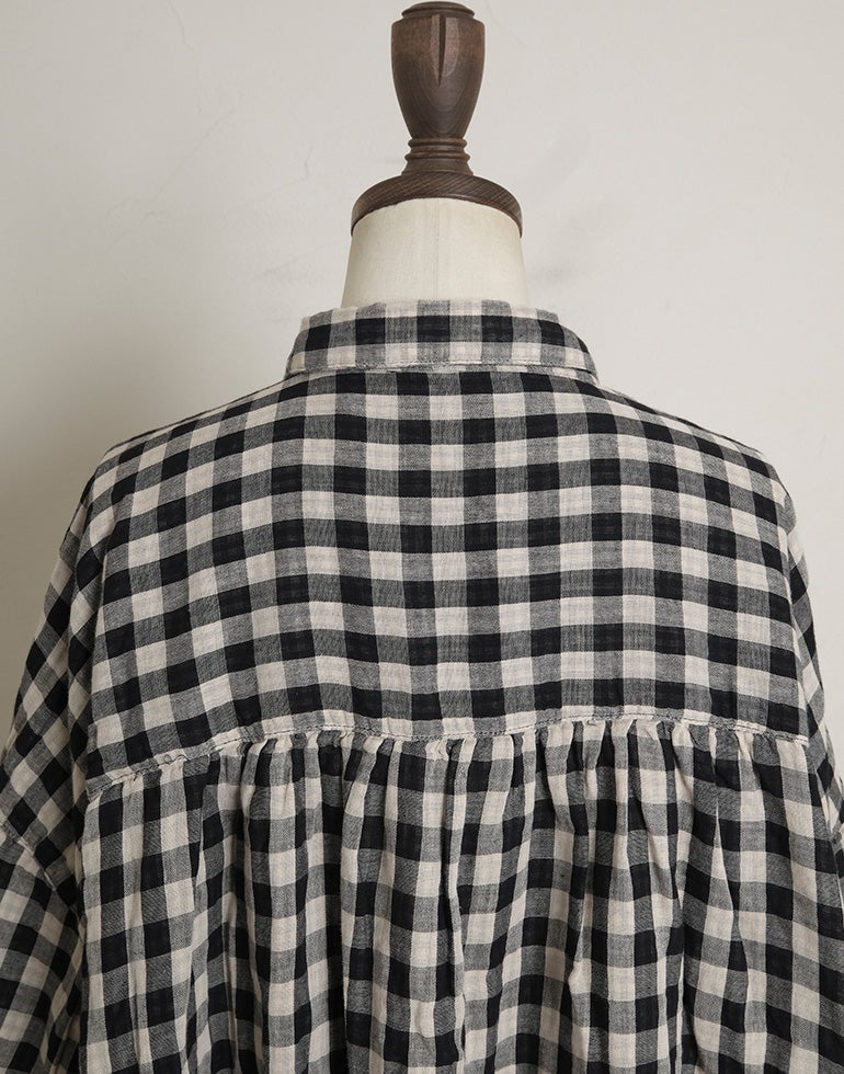 やわらかく空気を含んだふっくら風合いのWガーゼのコットン素材。ワイドな身幅にバックにギャザーを施し、切替下からやさしく広がるシルエットで、体のラインを拾いにくく、自然なドレープ感を演出。羽織りとしても使える汎用性の高さが魅力です。どんなアイテムとも好相性の、ナチュラル×ブラックカラーの配色チェックです。
