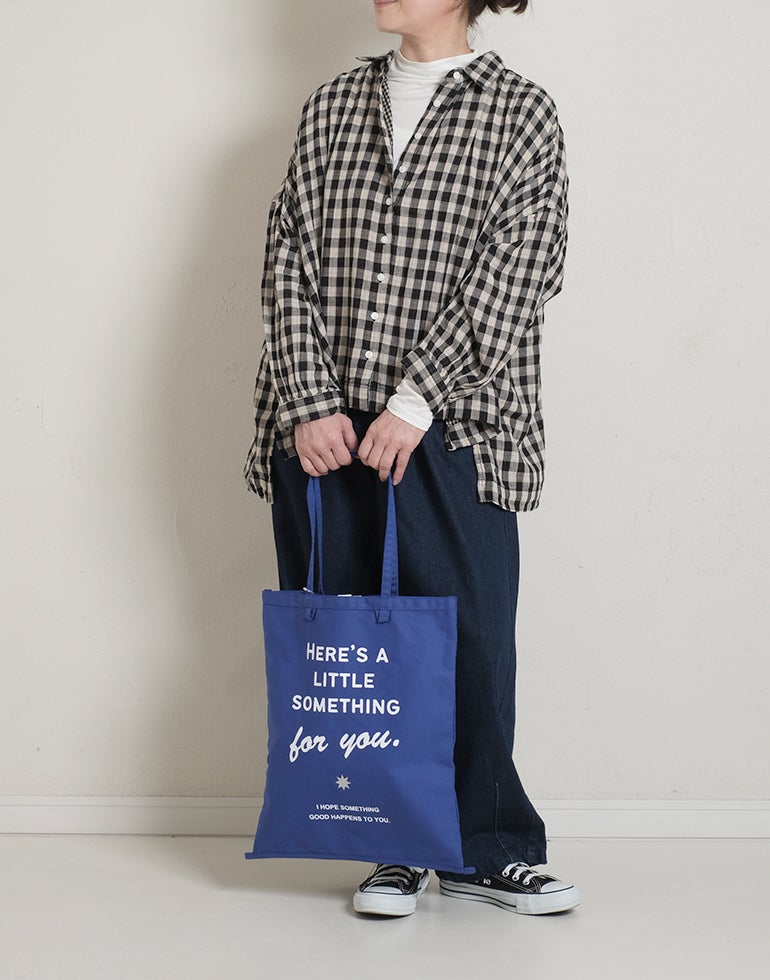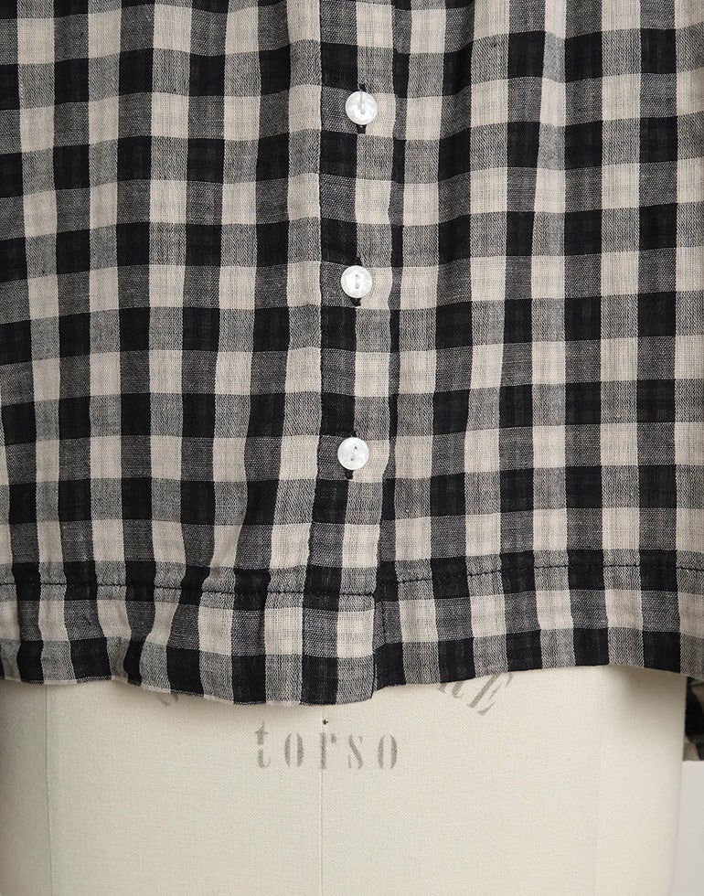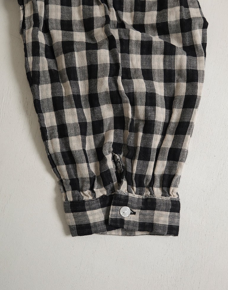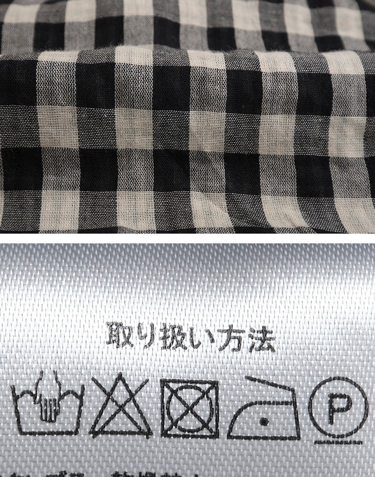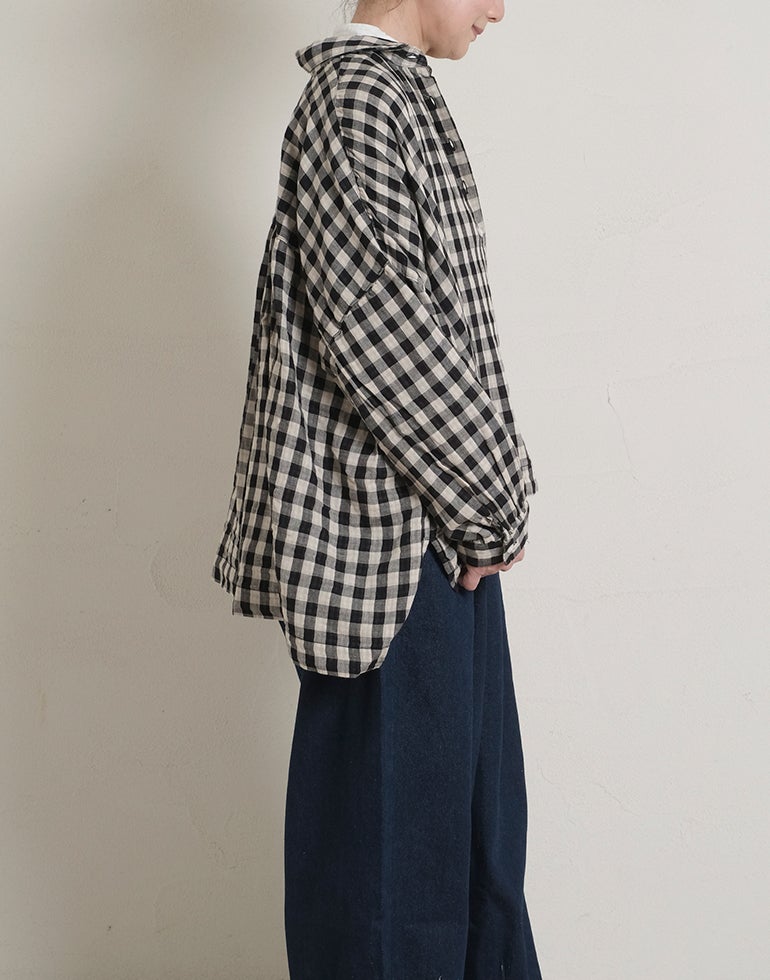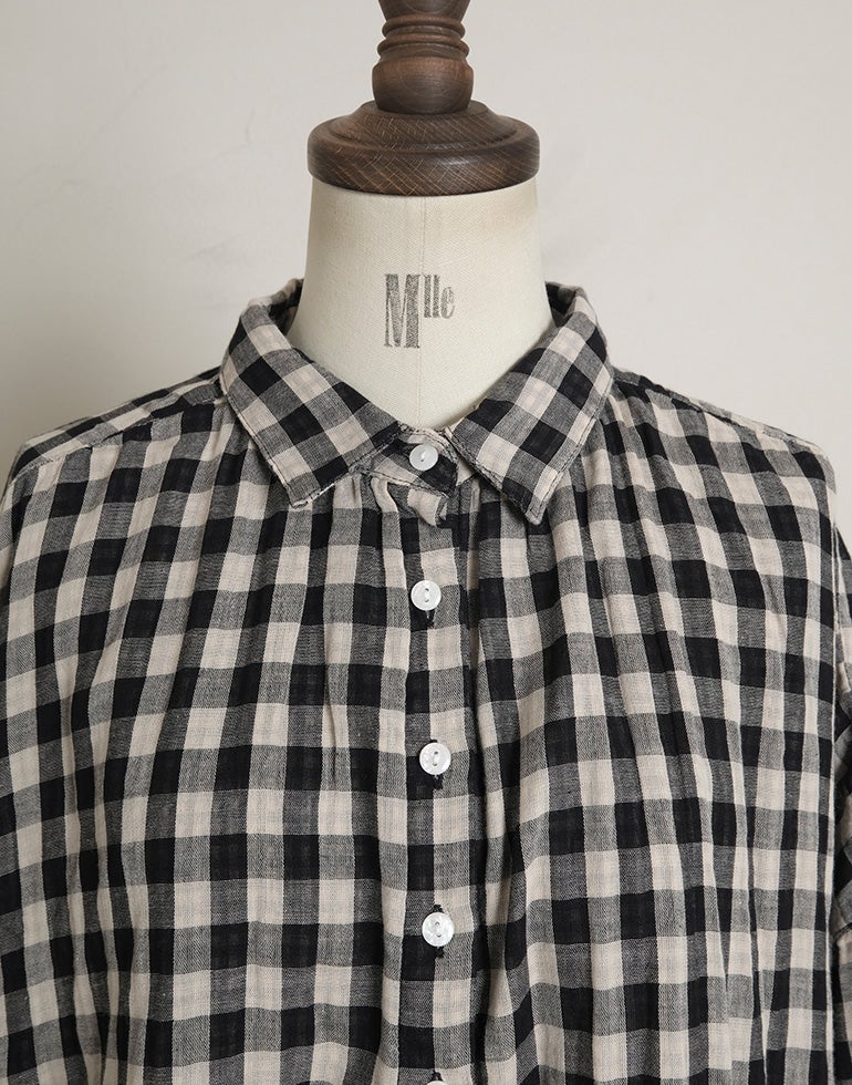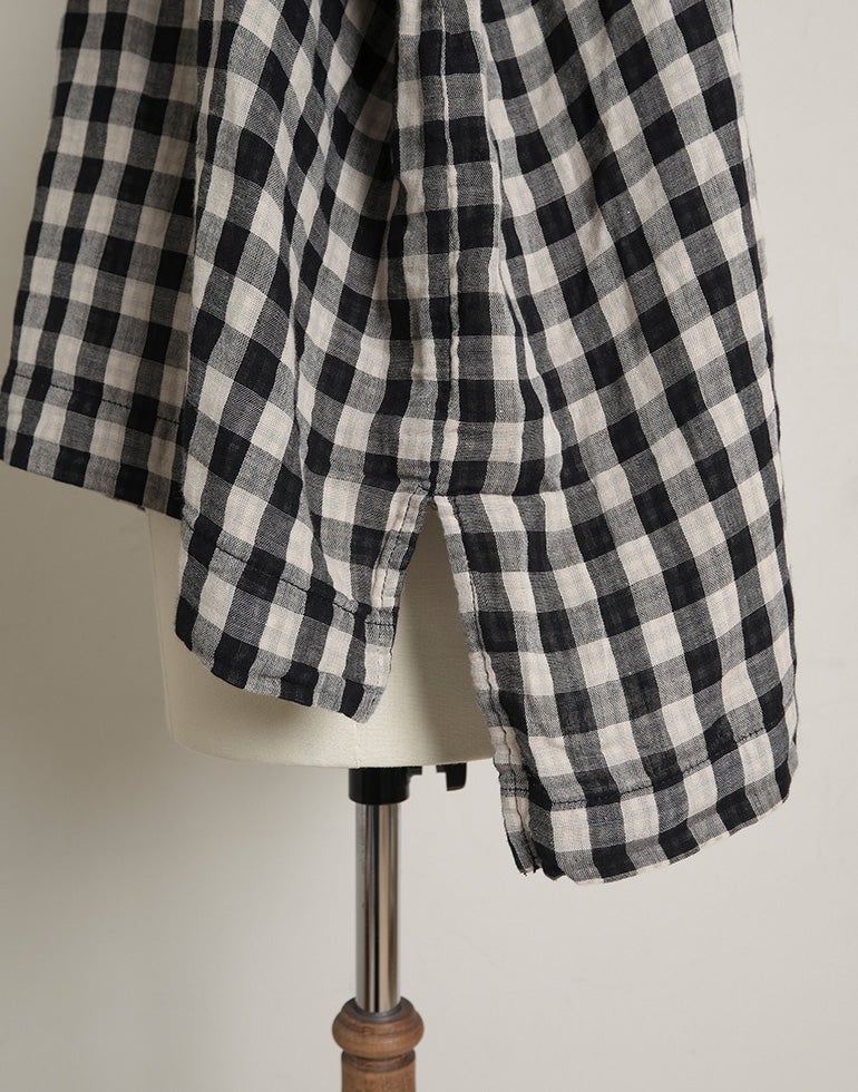 やわらかく空気を含んだふっくら風合いのWガーゼのコットン素材。ワイドな身幅にバックにギャザーを施し、切替下からやさしく広がるシルエットで、体のラインを拾いにくく、自然なドレープ感を演出。羽織りとしても使える汎用性の高さが魅力です。どんなアイテムとも好相性の、ナチュラル×ブラックカラーの配色チェックです。
