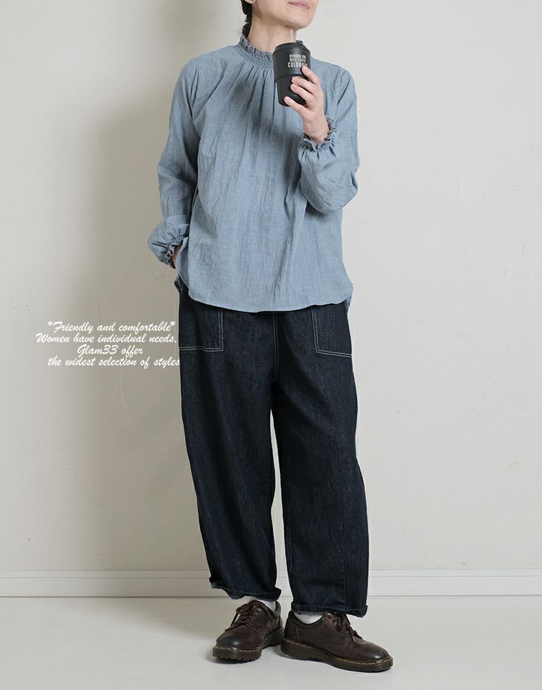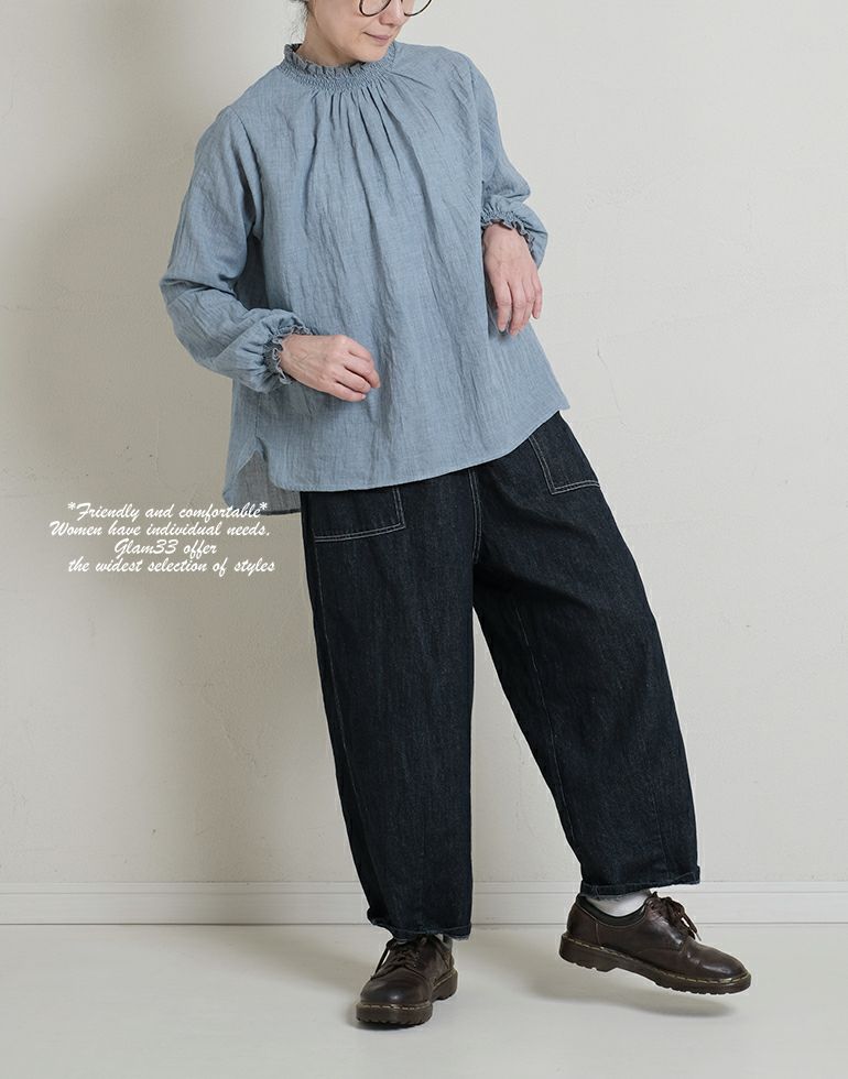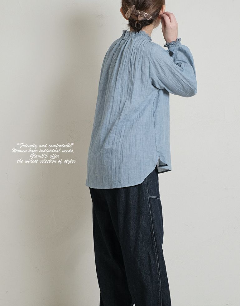 ナチュラルな風合い感に自然なシワがいい味を出してくれています。さらりとした薄手の綿素材。ネックと袖口はシャーリングゴムにレースをあしらって上品で甘い印象に。前後差のある丈はコーディネートのバランスが取れやすく、丸みのある裾やさしい雰囲気に仕上げてくれます。
