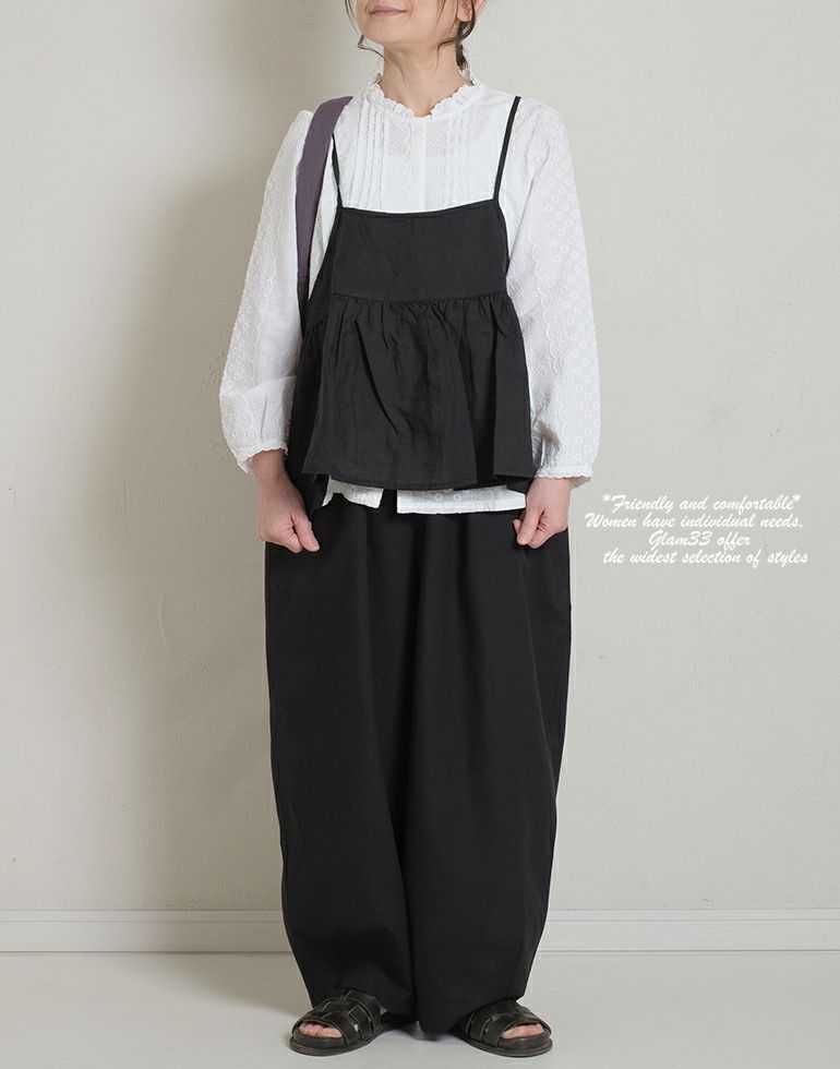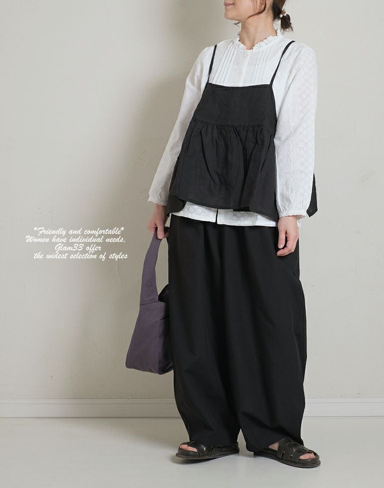 さらっとした落ち感のある涼し気レーヨン麻混素材。コクーンシルエットでドライで快適な履き心地パンツ。ウエストはゴムでサイズ調節可能のひも付きです。ウエスト下にタックをとり、裾にはダーツを加え、丸みのあるシルエットに。落ち感があるので野暮ったくなくシュッとした印象に。ワンピースやチュニックの重ねにも役立ちます。