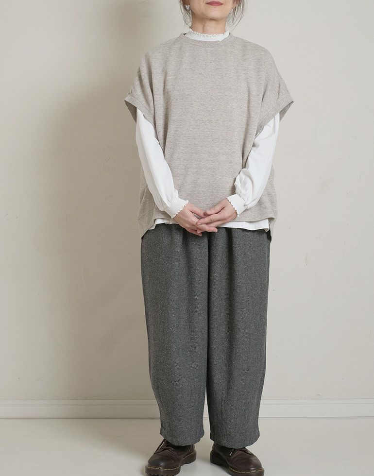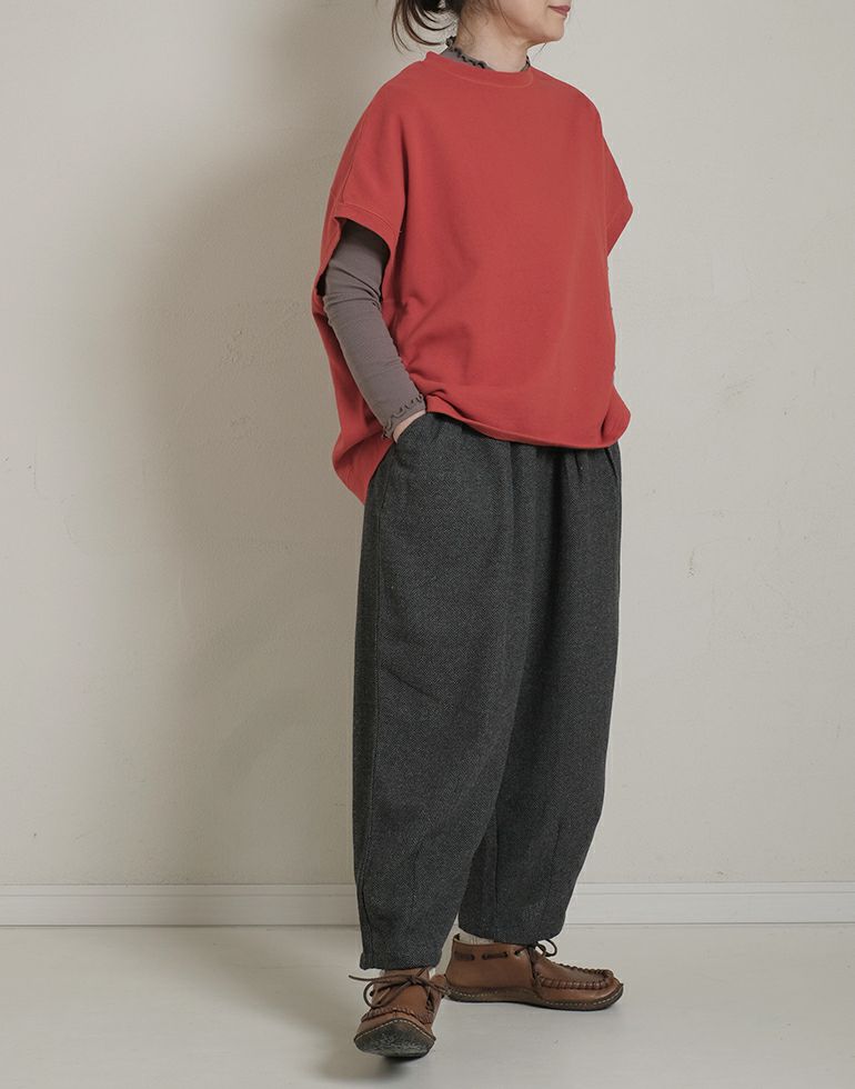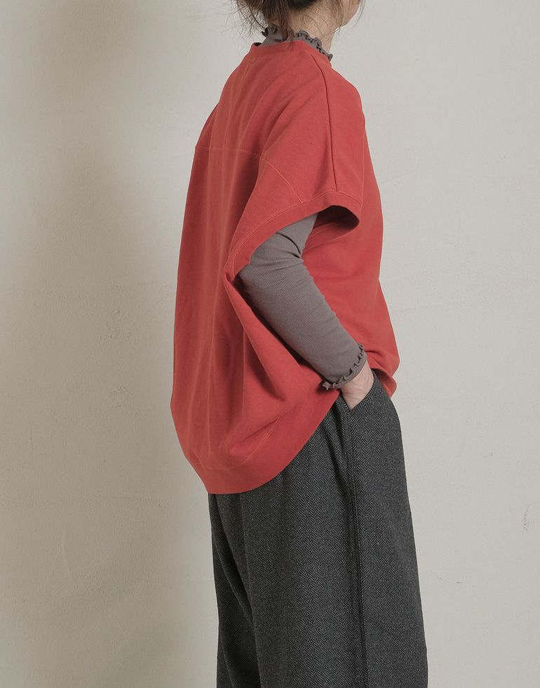 紡績工程で出る落ち綿を再利用した、環境にやさしいリバイバル素材。温かみのある裏毛素材でほっこり。アームホール、身幅ゆったりサイズでレイヤードしやすいデザインになっています。肩落ちシルエットでこなれた印象に。前後差丈で動きのあるシルエットに。