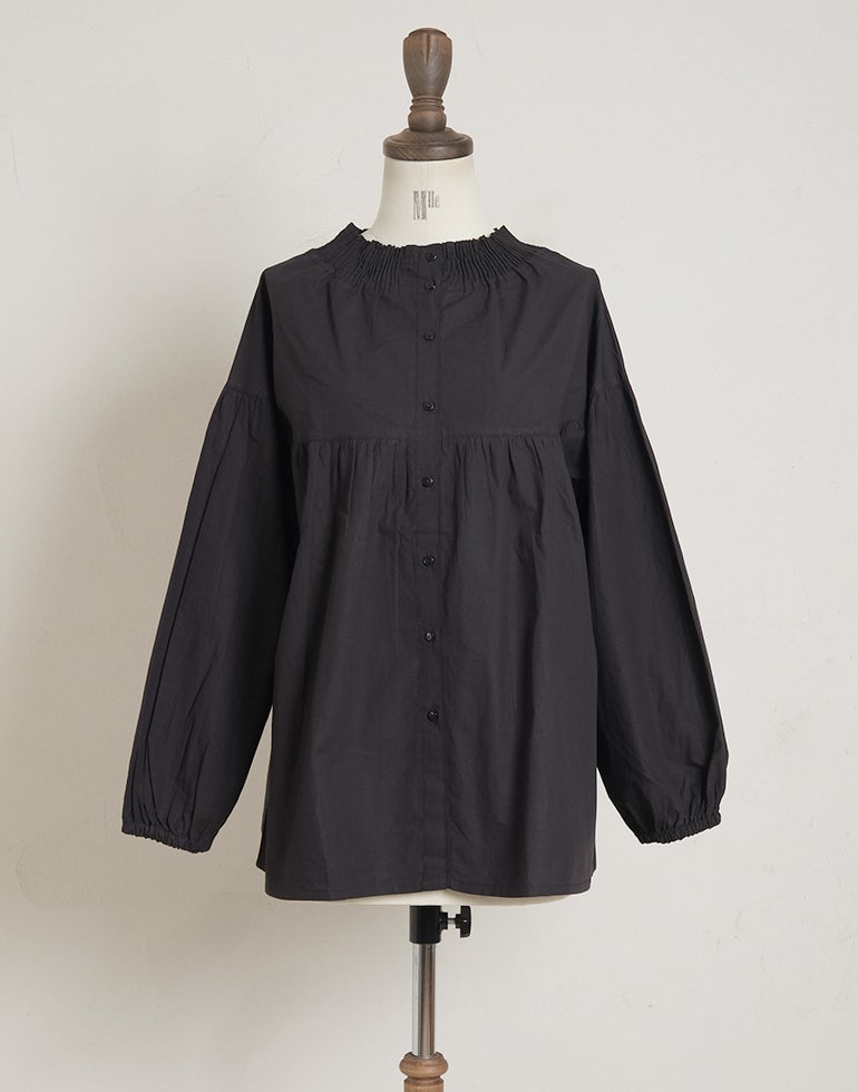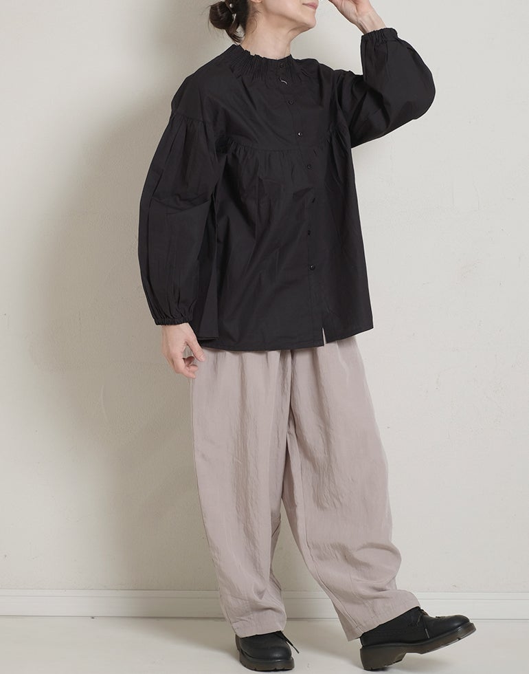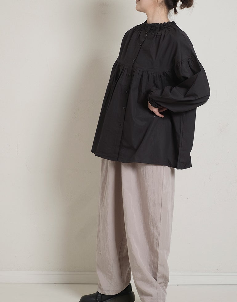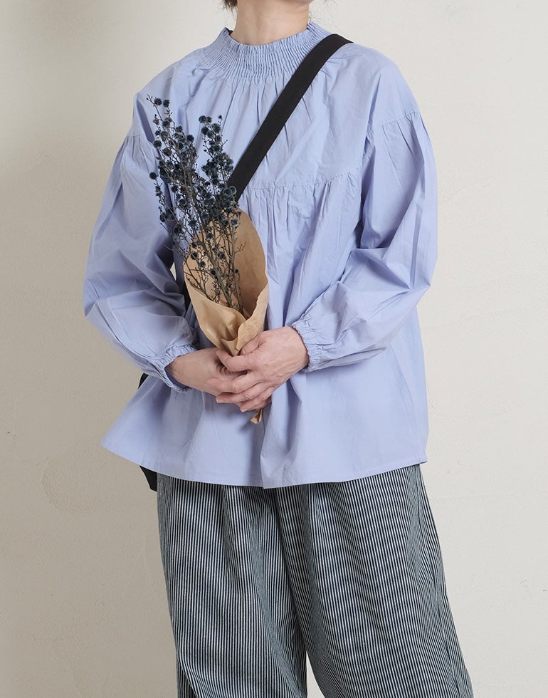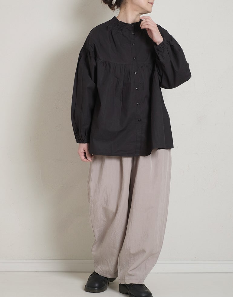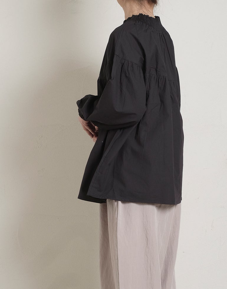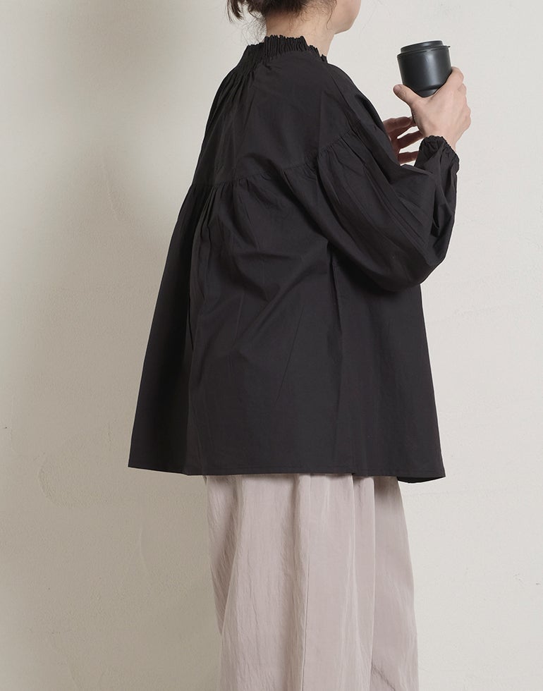 柔らかくしなやかで上品な光沢感のあるポプリンコットン素材。襟ぐりはゴムシャーリングになっており着脱も楽です。ゆとりのある身幅にヨーク切替ギャザーでふんわりとしたボリューム感のある大人可愛い印象に。袖口ゴムなので袖の長さ調節も気軽にでき、ふんわりとしたパフスリーブ風シルエットにもなってくれます。前後着用可能、前開きにして羽織としてもOK!