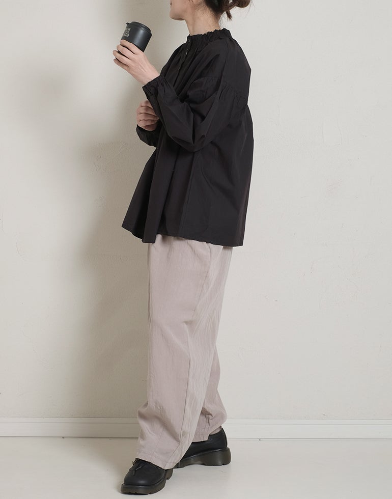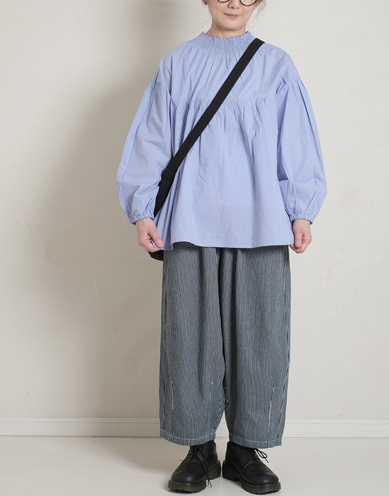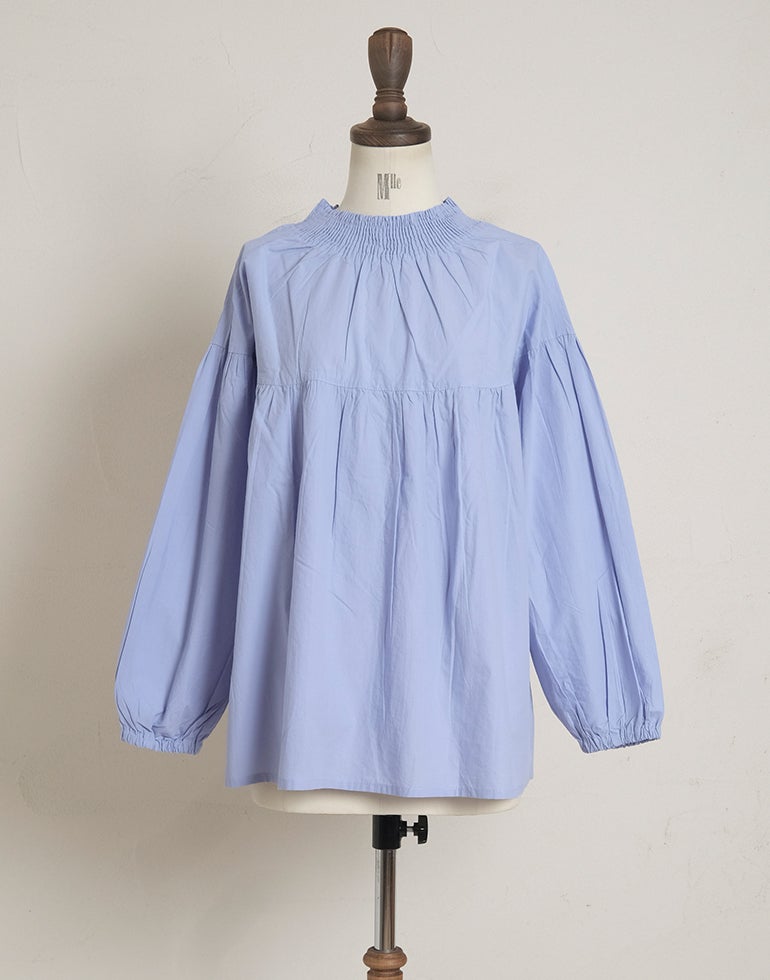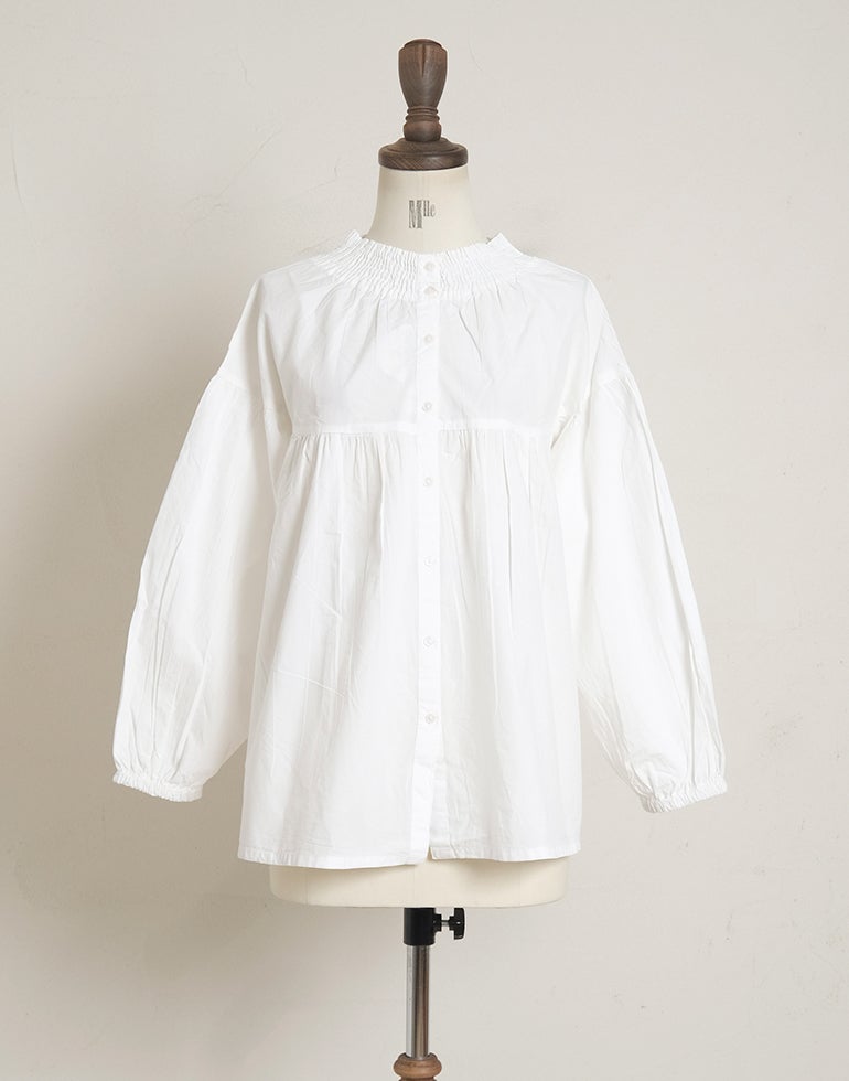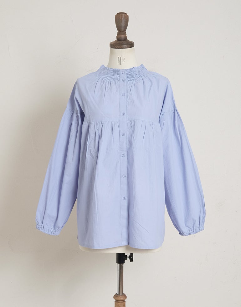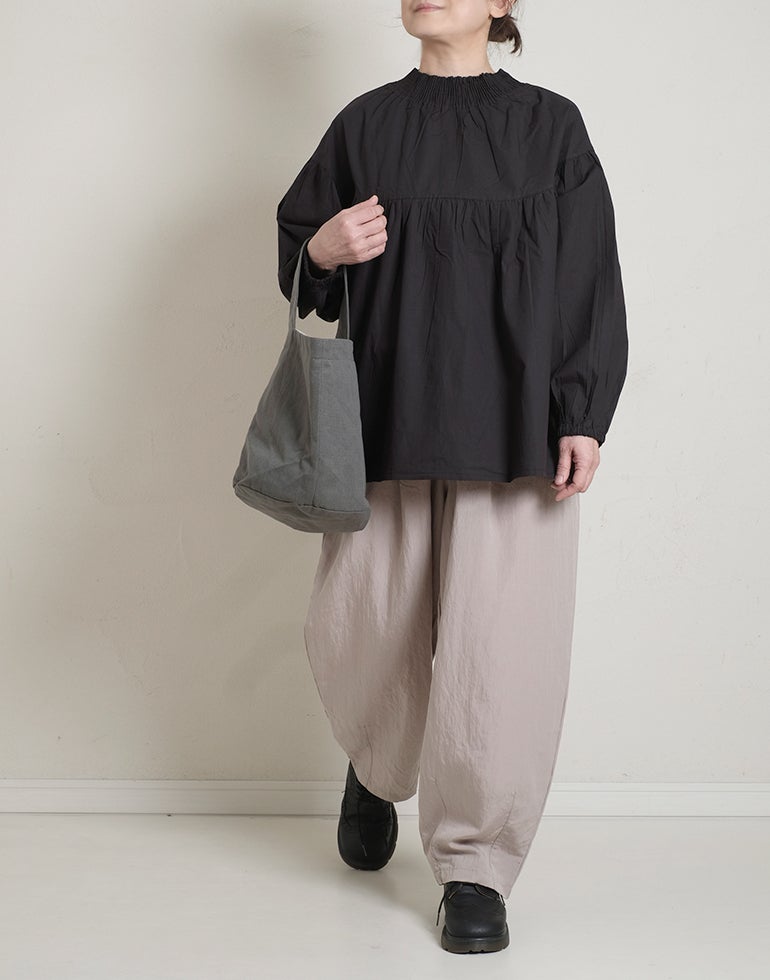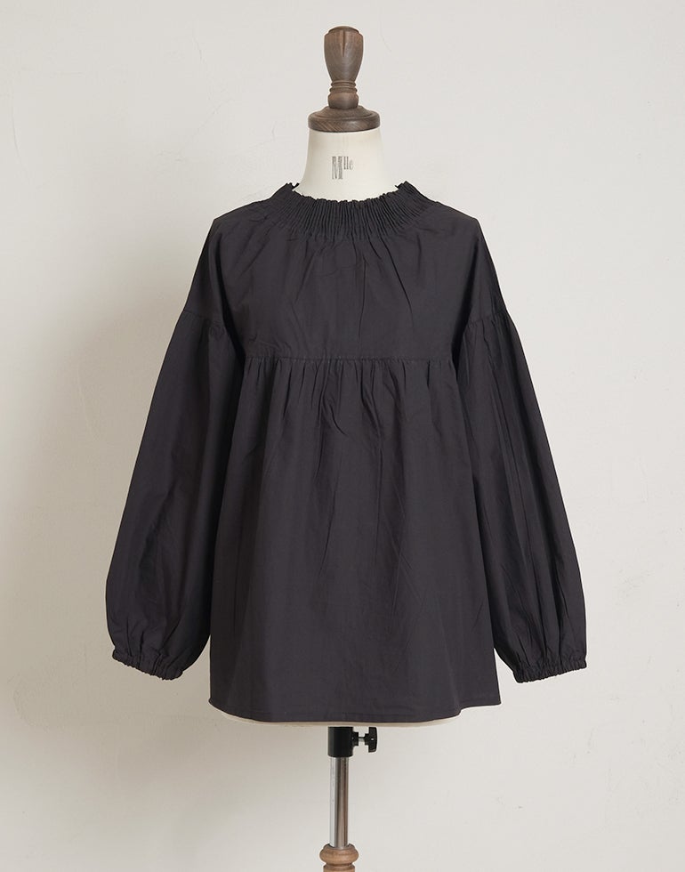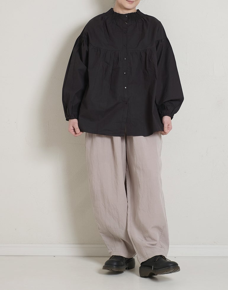 柔らかくしなやかで上品な光沢感のあるポプリンコットン素材。襟ぐりはゴムシャーリングになっており着脱も楽です。ゆとりのある身幅にヨーク切替ギャザーでふんわりとしたボリューム感のある大人可愛い印象に。袖口ゴムなので袖の長さ調節も気軽にでき、ふんわりとしたパフスリーブ風シルエットにもなってくれます。前後着用可能、前開きにして羽織としてもOK!