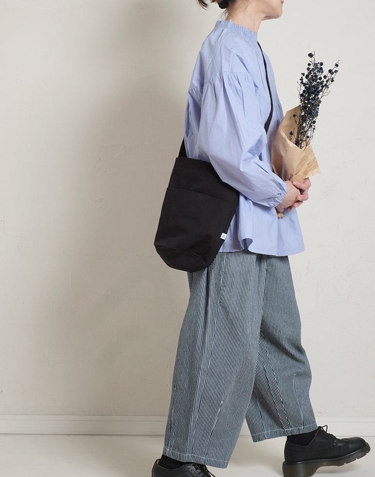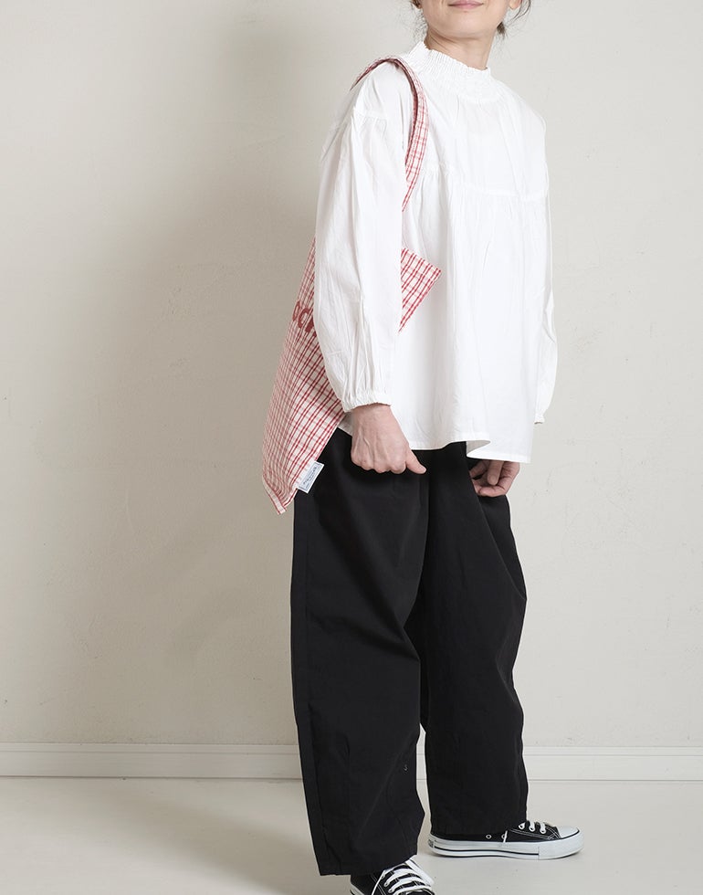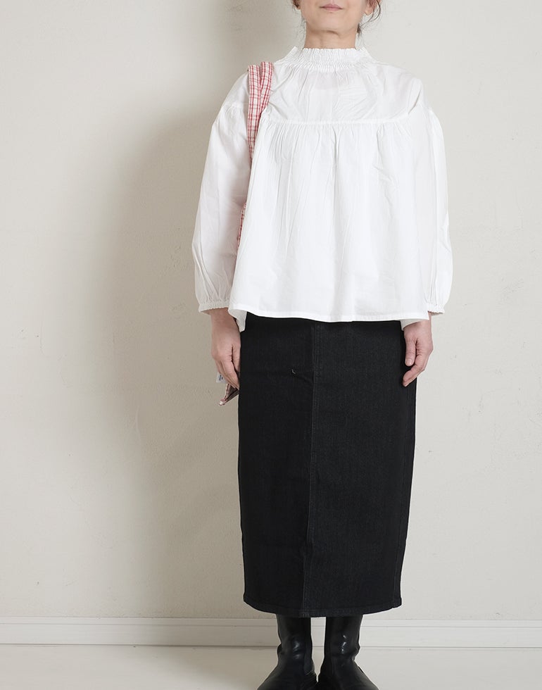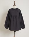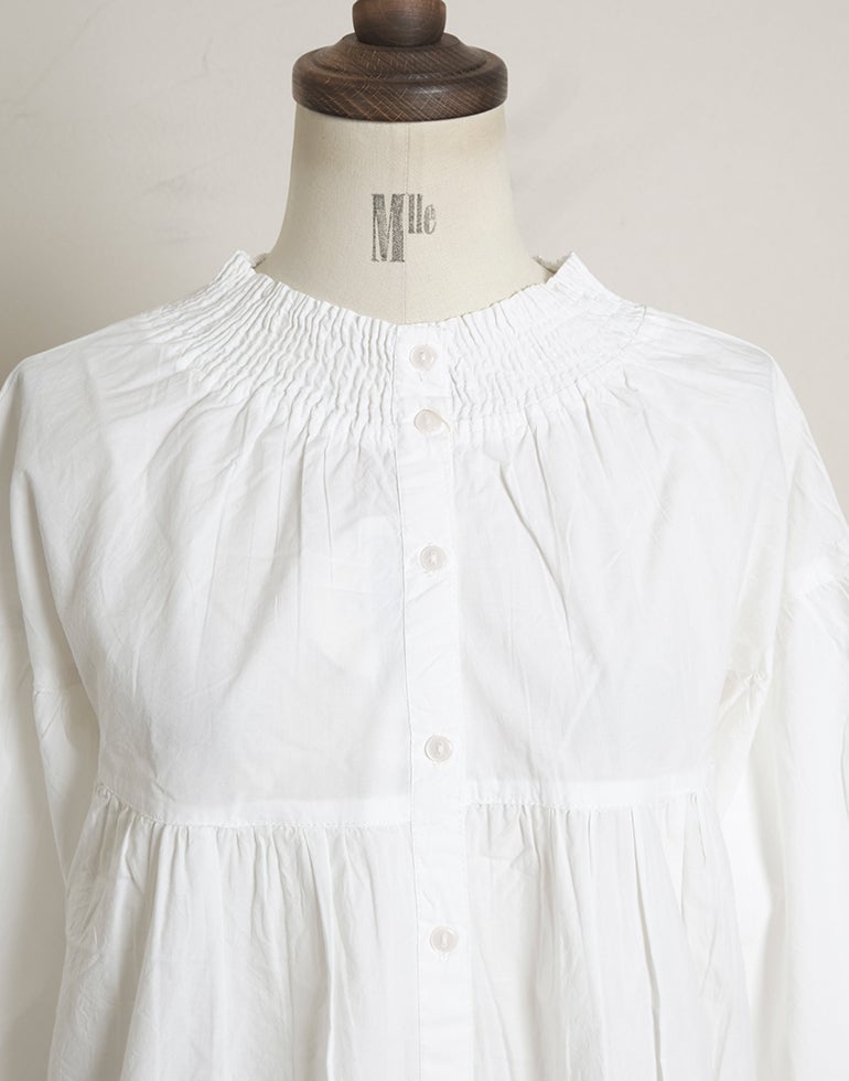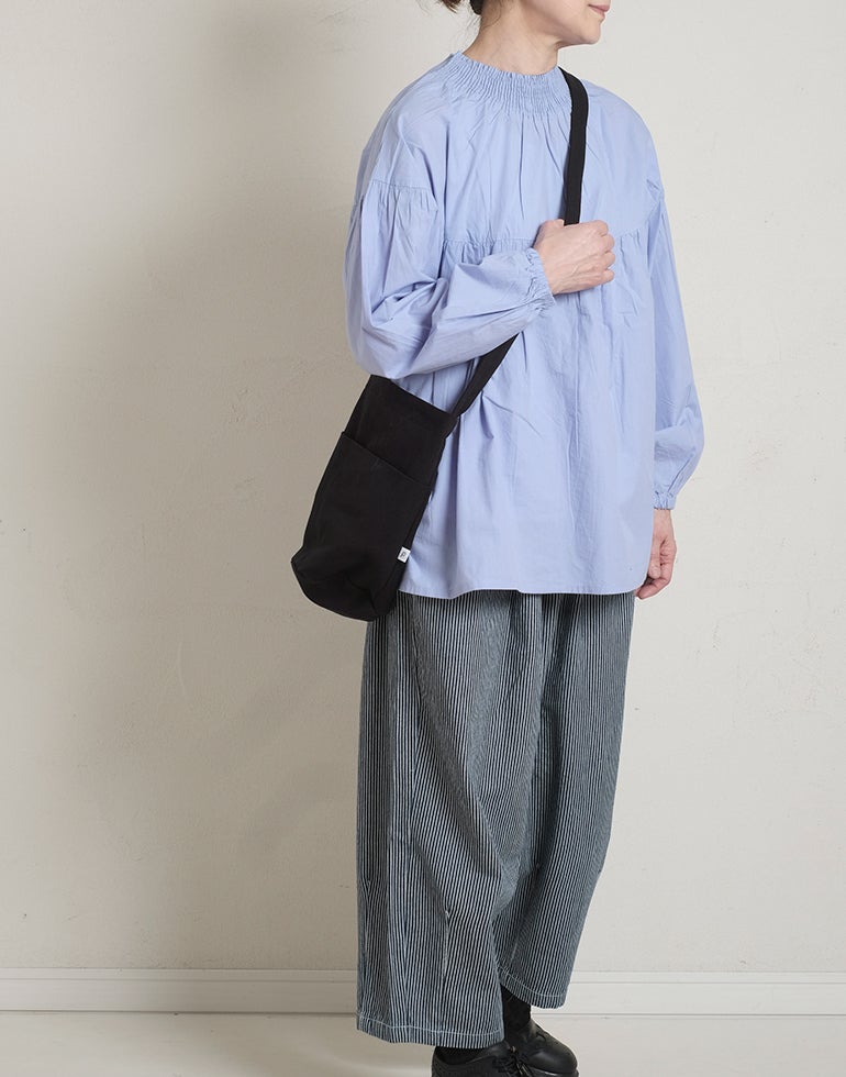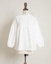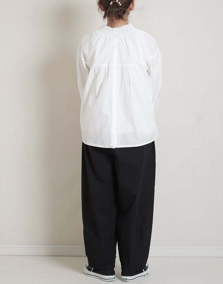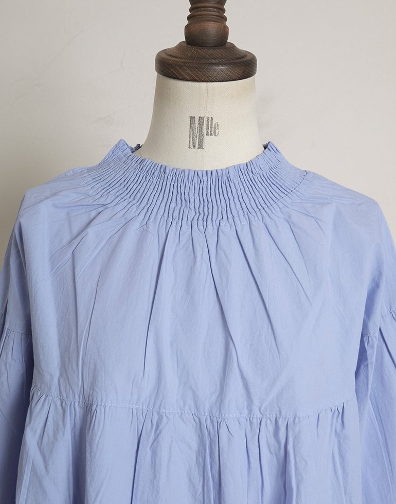 柔らかくしなやかで上品な光沢感のあるポプリンコットン素材。襟ぐりはゴムシャーリングになっており着脱も楽です。ゆとりのある身幅にヨーク切替ギャザーでふんわりとしたボリューム感のある大人可愛い印象に。袖口ゴムなので袖の長さ調節も気軽にでき、ふんわりとしたパフスリーブ風シルエットにもなってくれます。前後着用可能、前開きにして羽織としてもOK!
