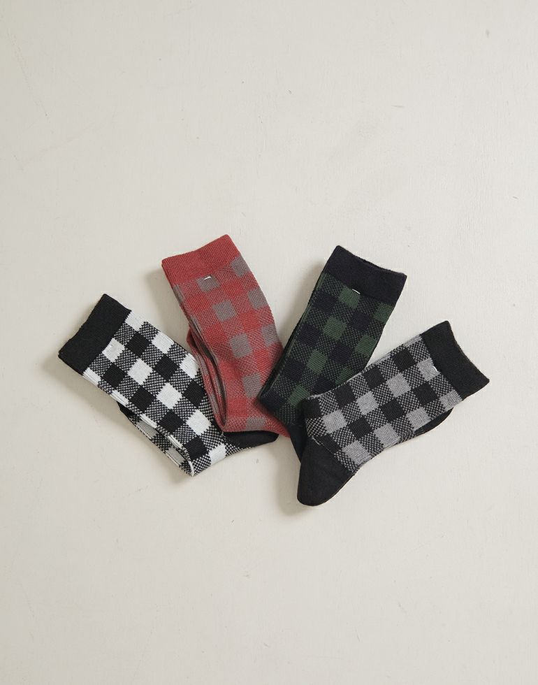 保温性に優れたアクリルウールコットン糸にコットン糸を引き揃えて編み立て蒸れにくく、快適な履き心地を実現。厚すぎず薄すぎず、初秋から履いていただける一足に仕上げました。チェックが足元のワンポイントとなってくれます。