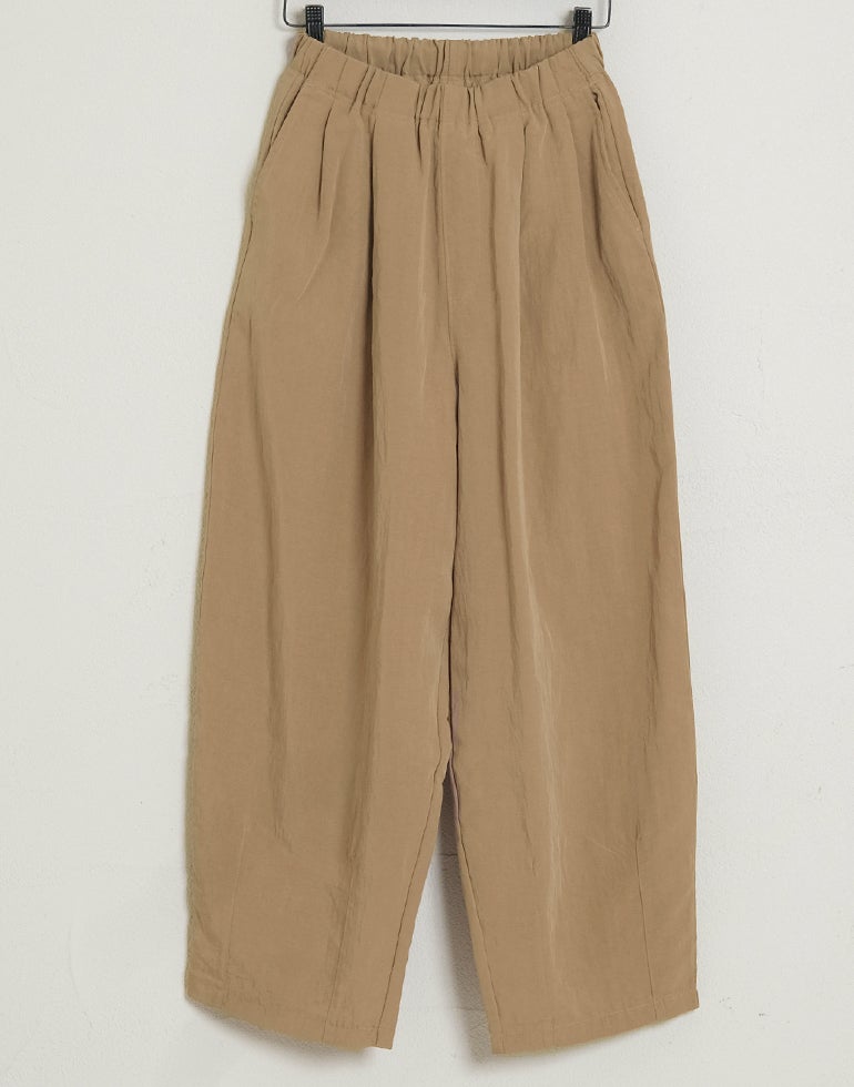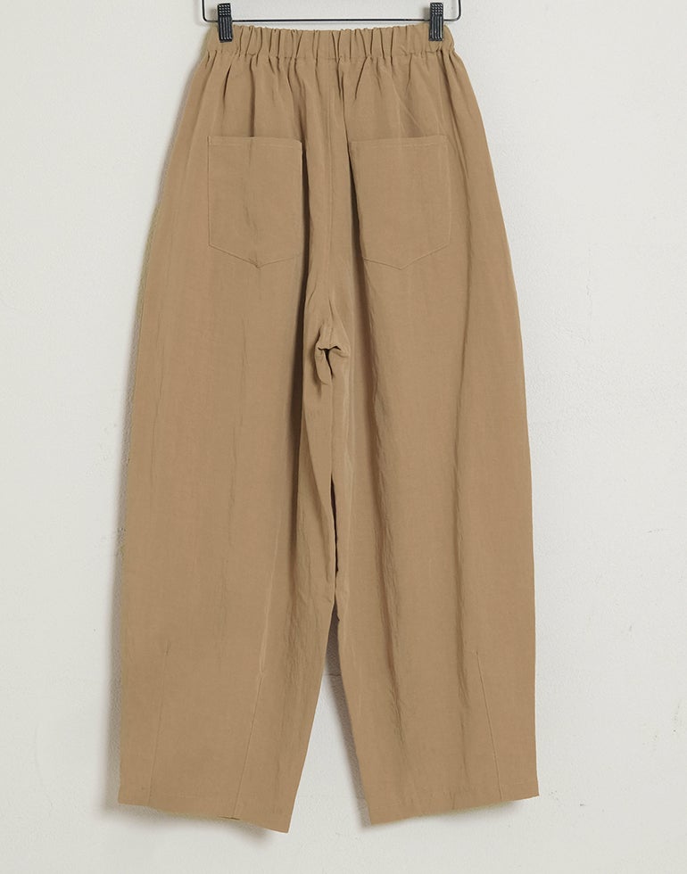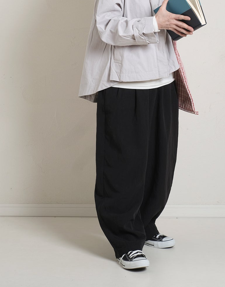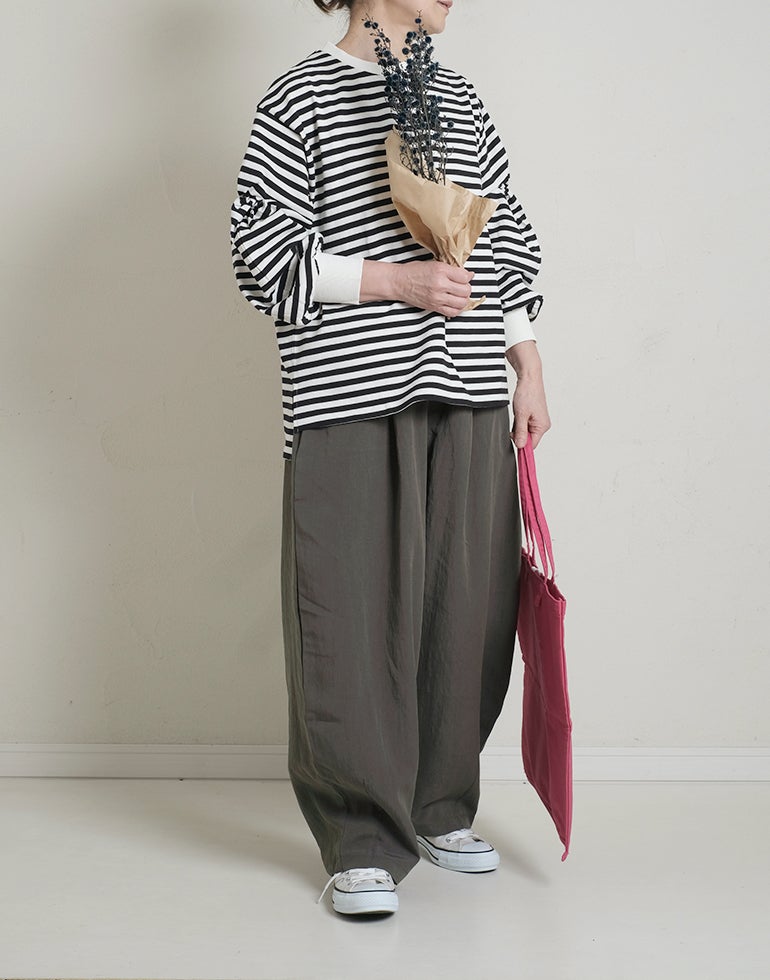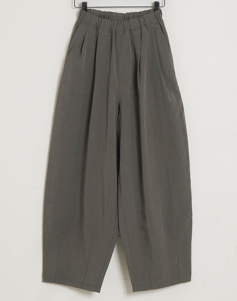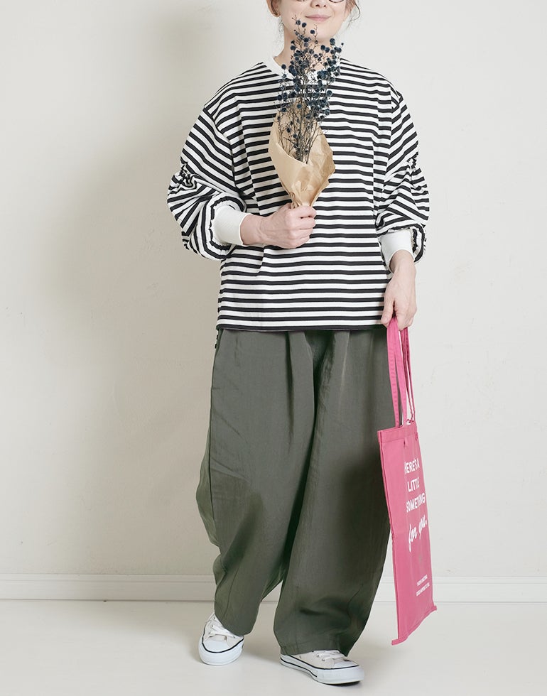 凹凸のシボのあるレーヨンナイロン麻混のさらっとした肌触りが心地いい素材。ウエストは総ゴムに内側ひも付きでサイズ調節可能。フロントのウエスト周りにはタックを施し、特有のドレープ感ができ、トップスをインするだけで、大人っぽいこなれ感のあるスタイルに。バックはギャザーを寄せ、ヒップラインを優しく包み込み体のラインをカバーしてくれます。ゆとりのあるヒップや太ももラインは素材の持ち味を生かしボリュームを抑えつつ、脚のラインを拾いにくく、落ち感が出て、スマートなフォルムに。オフィスや普段着にと色違いで欲しくなるほど快適履き心地。