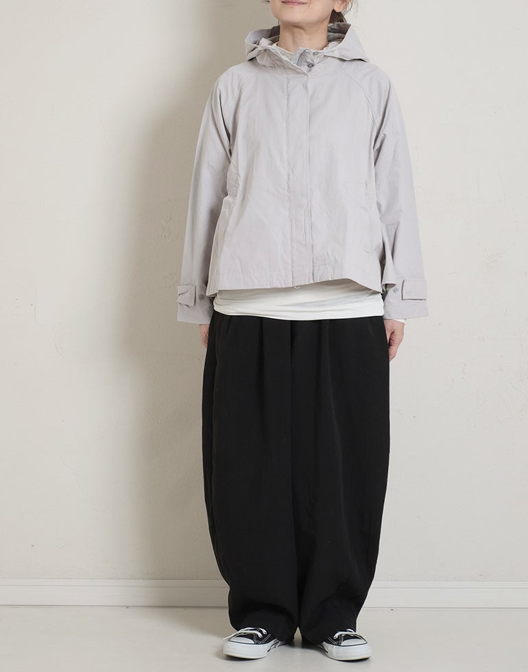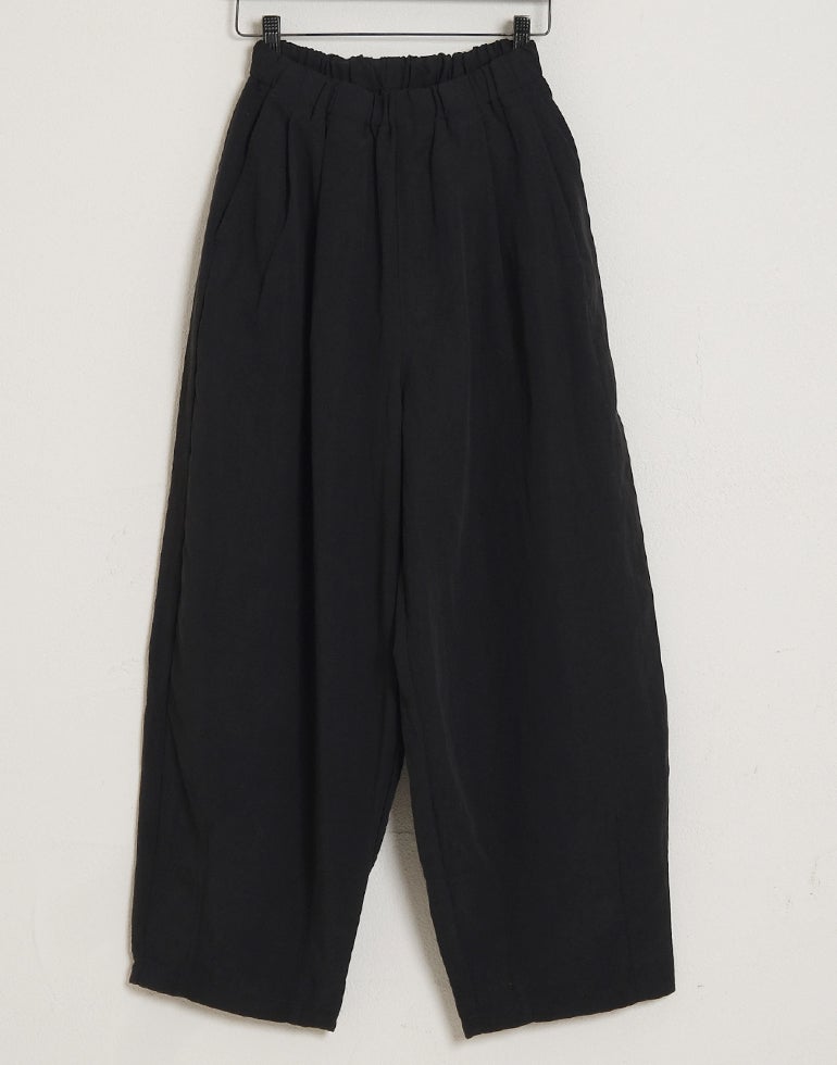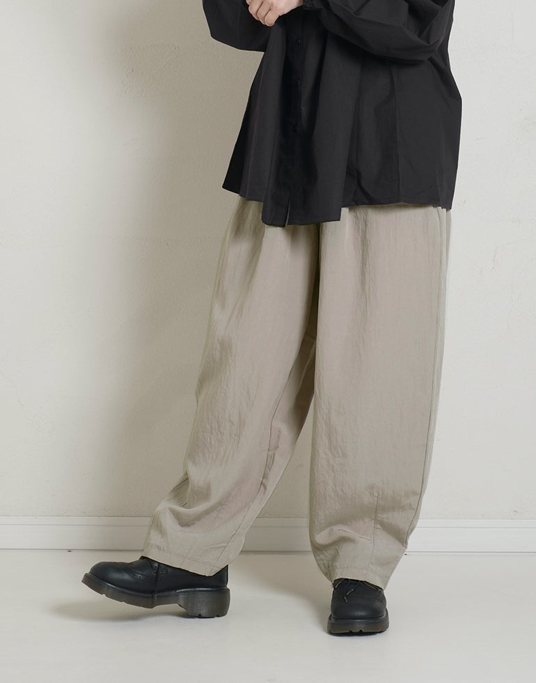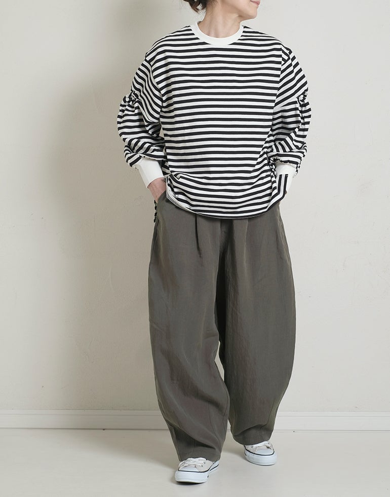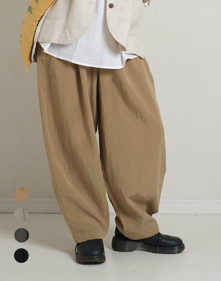 凹凸のシボのあるレーヨンナイロン麻混のさらっとした肌触りが心地いい素材。ウエストは総ゴムに内側ひも付きでサイズ調節可能。フロントのウエスト周りにはタックを施し、特有のドレープ感ができ、トップスをインするだけで、大人っぽいこなれ感のあるスタイルに。バックはギャザーを寄せ、ヒップラインを優しく包み込み体のラインをカバーしてくれます。ゆとりのあるヒップや太ももラインは素材の持ち味を生かしボリュームを抑えつつ、脚のラインを拾いにくく、落ち感が出て、スマートなフォルムに。オフィスや普段着にと色違いで欲しくなるほど快適履き心地。