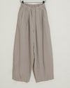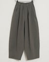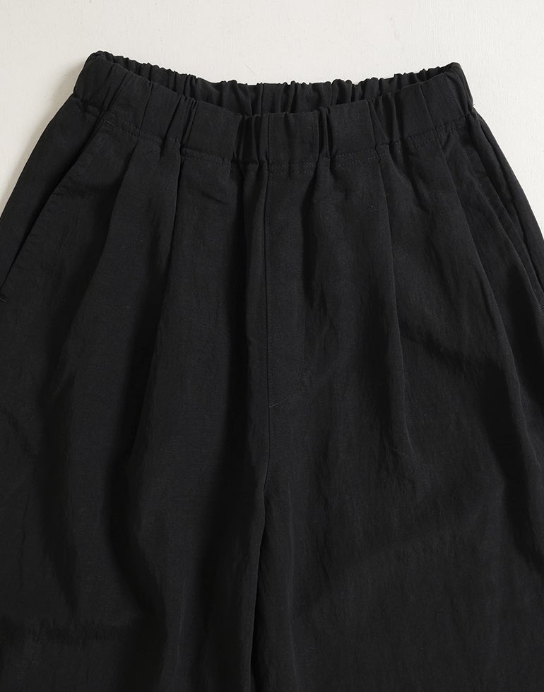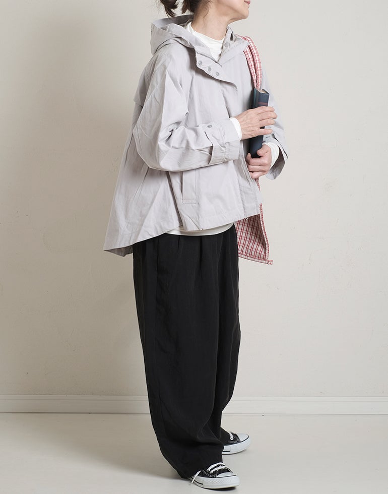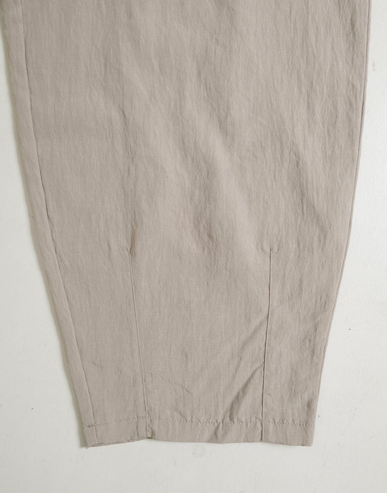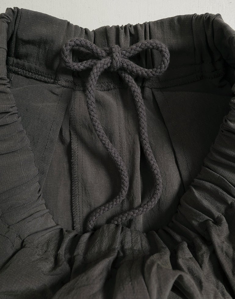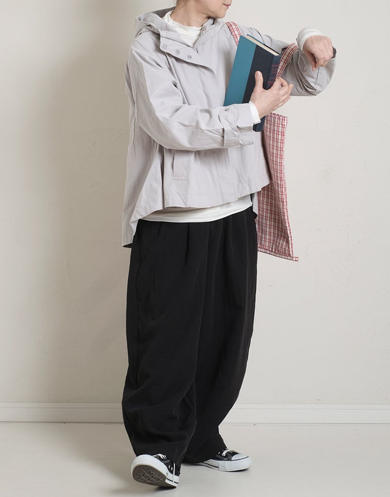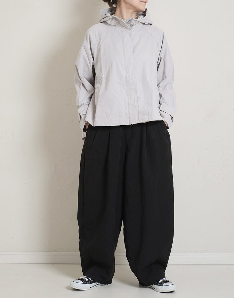 凹凸のシボのあるレーヨンナイロン麻混のさらっとした肌触りが心地いい素材。ウエストは総ゴムに内側ひも付きでサイズ調節可能。フロントのウエスト周りにはタックを施し、特有のドレープ感ができ、トップスをインするだけで、大人っぽいこなれ感のあるスタイルに。バックはギャザーを寄せ、ヒップラインを優しく包み込み体のラインをカバーしてくれます。ゆとりのあるヒップや太ももラインは素材の持ち味を生かしボリュームを抑えつつ、脚のラインを拾いにくく、落ち感が出て、スマートなフォルムに。オフィスや普段着にと色違いで欲しくなるほど快適履き心地。