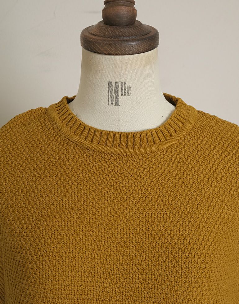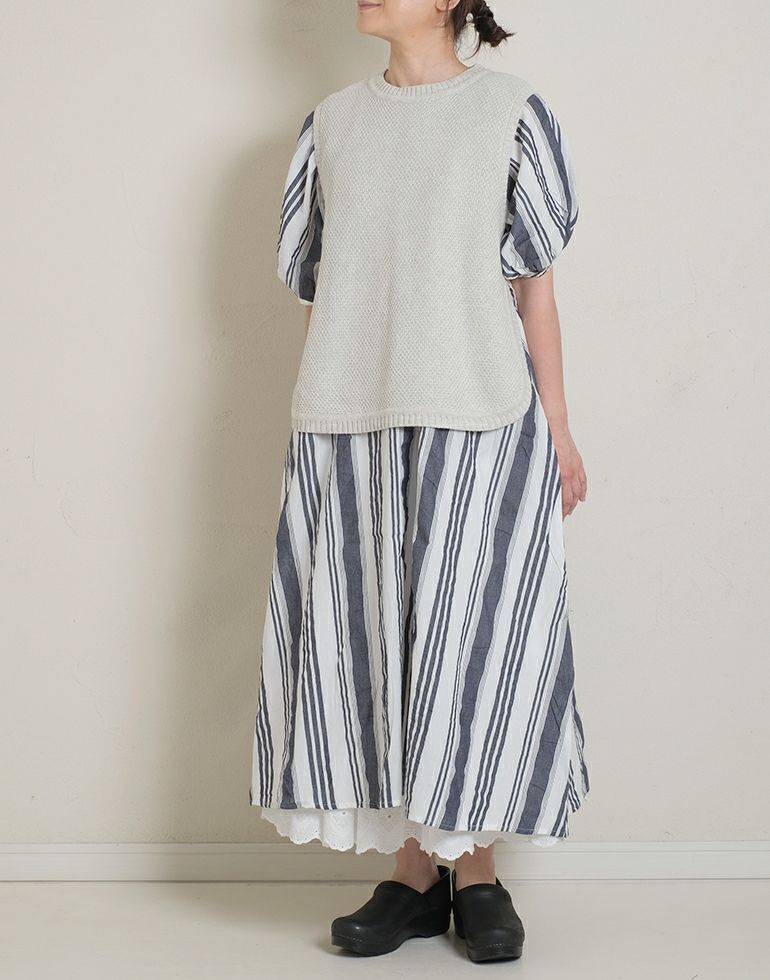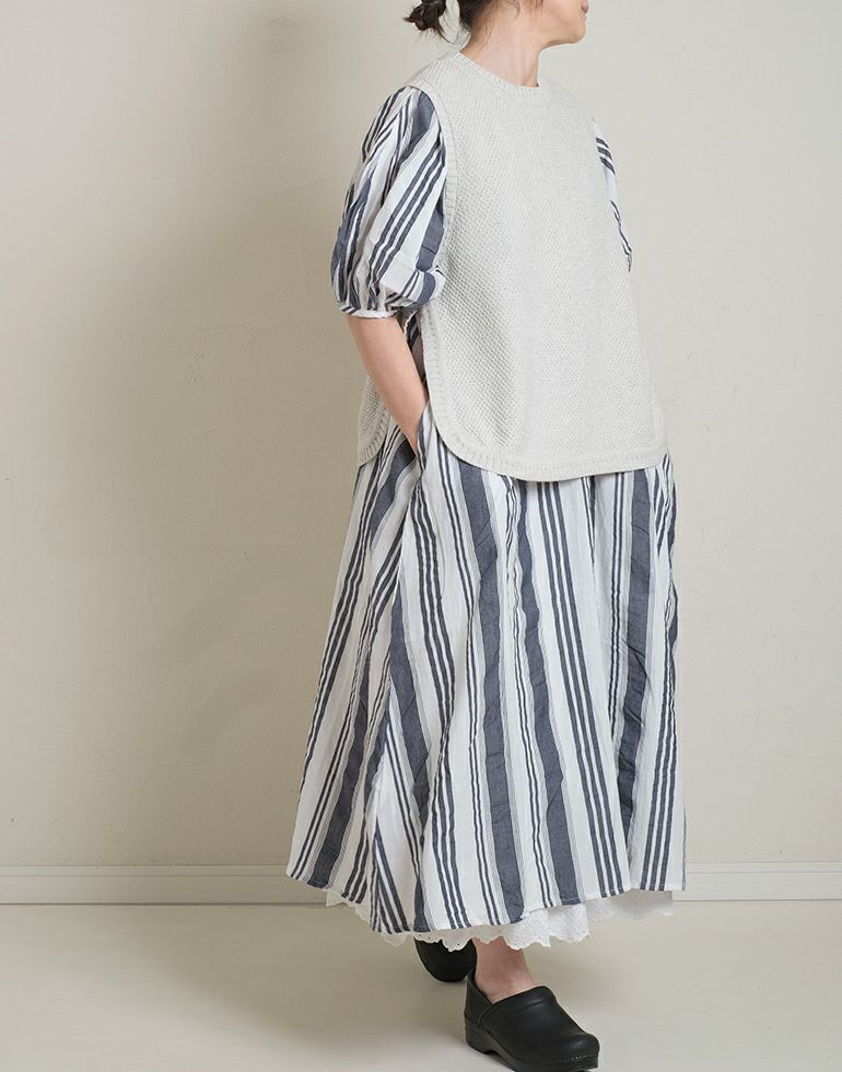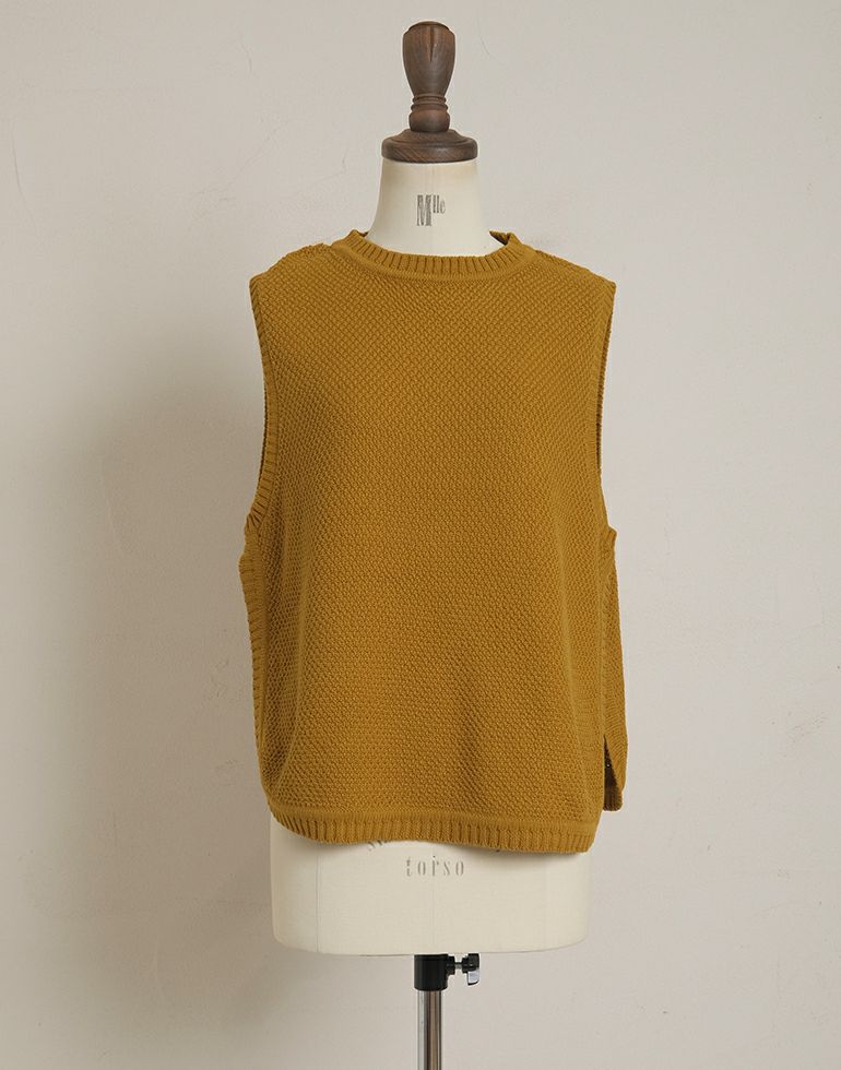 晩夏から初秋に着こなす軽めのベスト。鹿の子編みのポコポコ感が表情あって可愛いです。サイドにスリット入りで、インナーが嵩張らない点も嬉しいです。【ブランド】Bliss bunch / ブリスバンチ