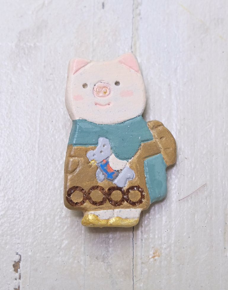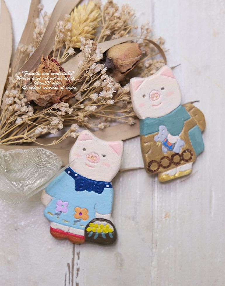 オーブン陶器粘土でひとつひとつ丁寧に作られています。少し個性のある素朴で愛らしい風合い感。ブタさんがおめかししてお出かけ。手にはミモザ入りのバスケット、猫の人形とほのぼのとした雰囲気に。優しい色合いのブローチでシンプルなお洋服やバッグに加えるだけでワンポイントになり、ブローチの世界観もお楽しみいただけます。ナチュラルなお洋服との相性は抜群です。