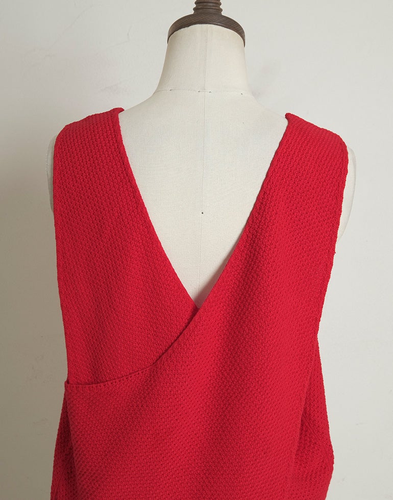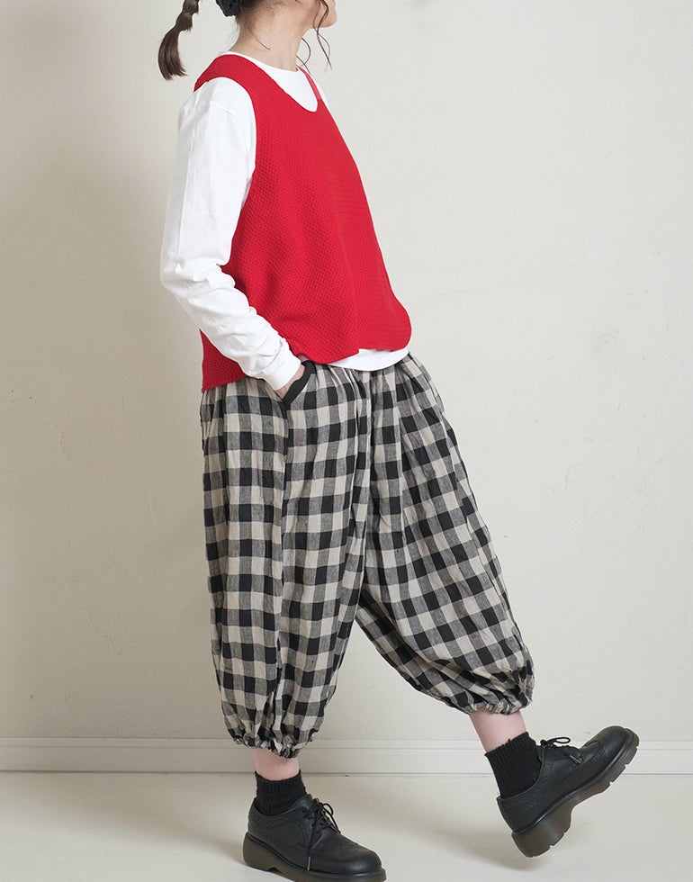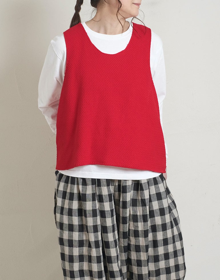晩夏から初秋に着こなす軽めのベスト。鹿の子編みのポコポコ感が表情あって可愛いです。バックのクロスデザインが斬新でお洒落感が増します。コーデのアクセントにおすすめの1枚です。お家でお洗濯可能。