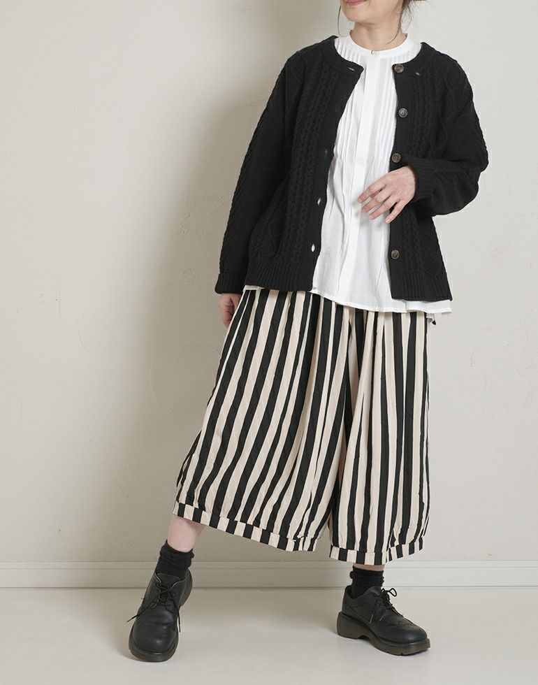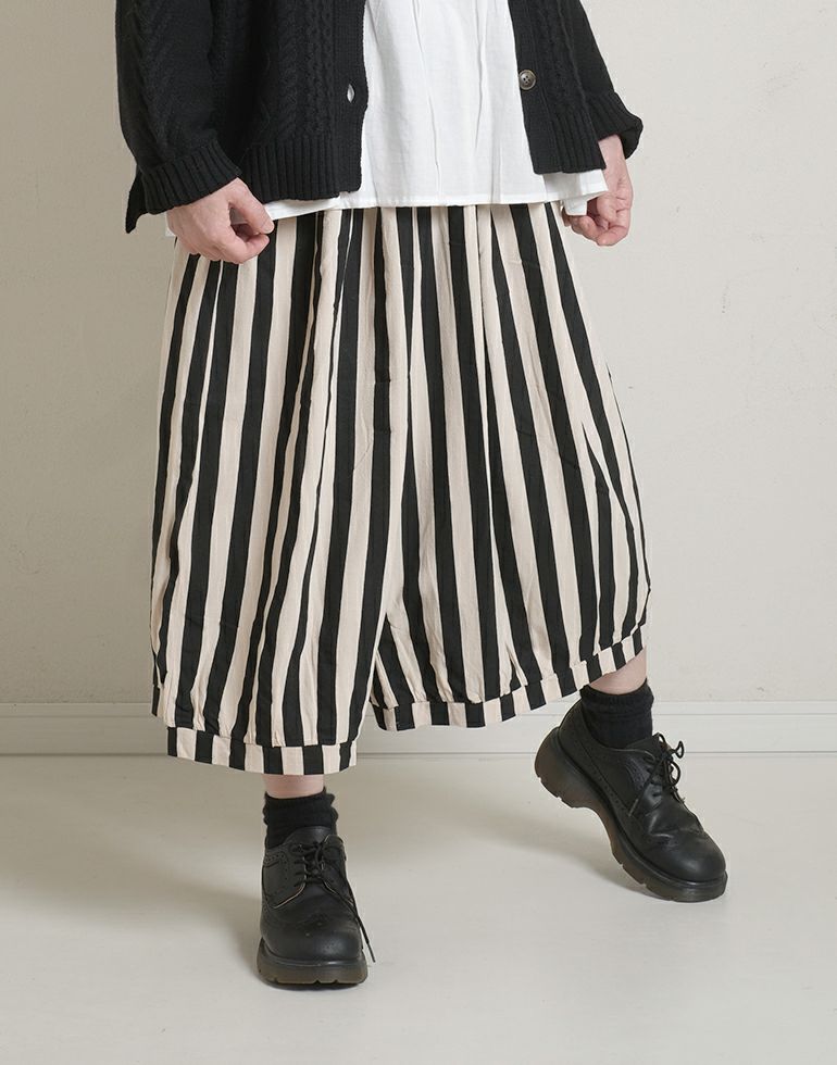 しなやかで落ち感のあるコットンリネン素材。ウエスト総ゴムで内側リボン付きでサイズ調節可能。モモ、ヒップラインはゆったりしつつ裾をパイピングしギャザーを施し、メリハリ感のあるシルエットに。太ストライプなのでスタイリングにパンチを効かせてくれます。