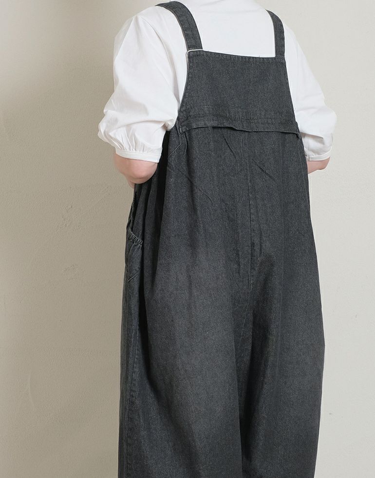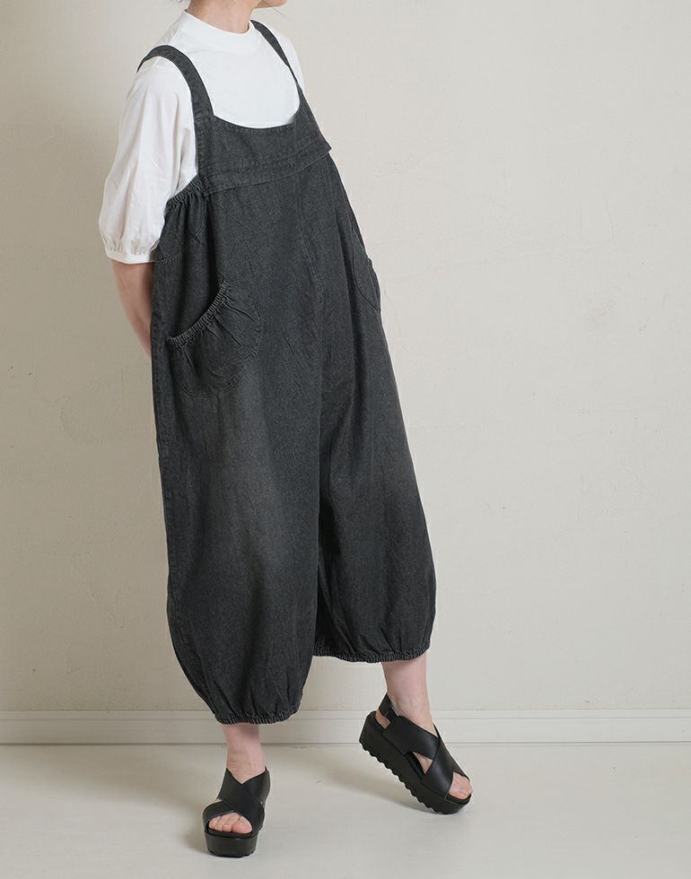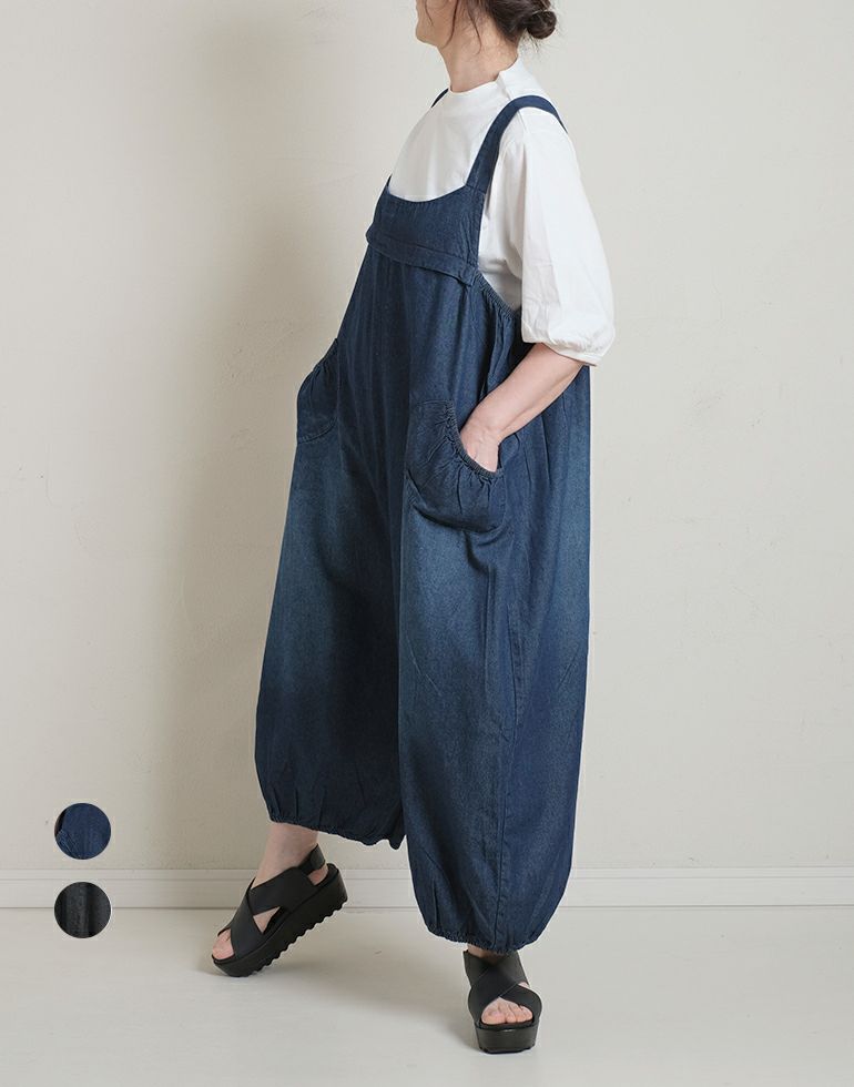 デニム素材。両脇にはゴムを配し、ほどよくゆとりあるサイズ感で快適な着心地。裾ゴムで裾にかけてしぼんでいくバルーンシルエットになっています。フロントのギャザー丸ポケットがワンポイントとなっています。夏は半袖Tシャツやシャツ、ロンTと合わせて、冬にはスウェットパーカーやニットを合わせたり様々なスタイルが楽しめます!
