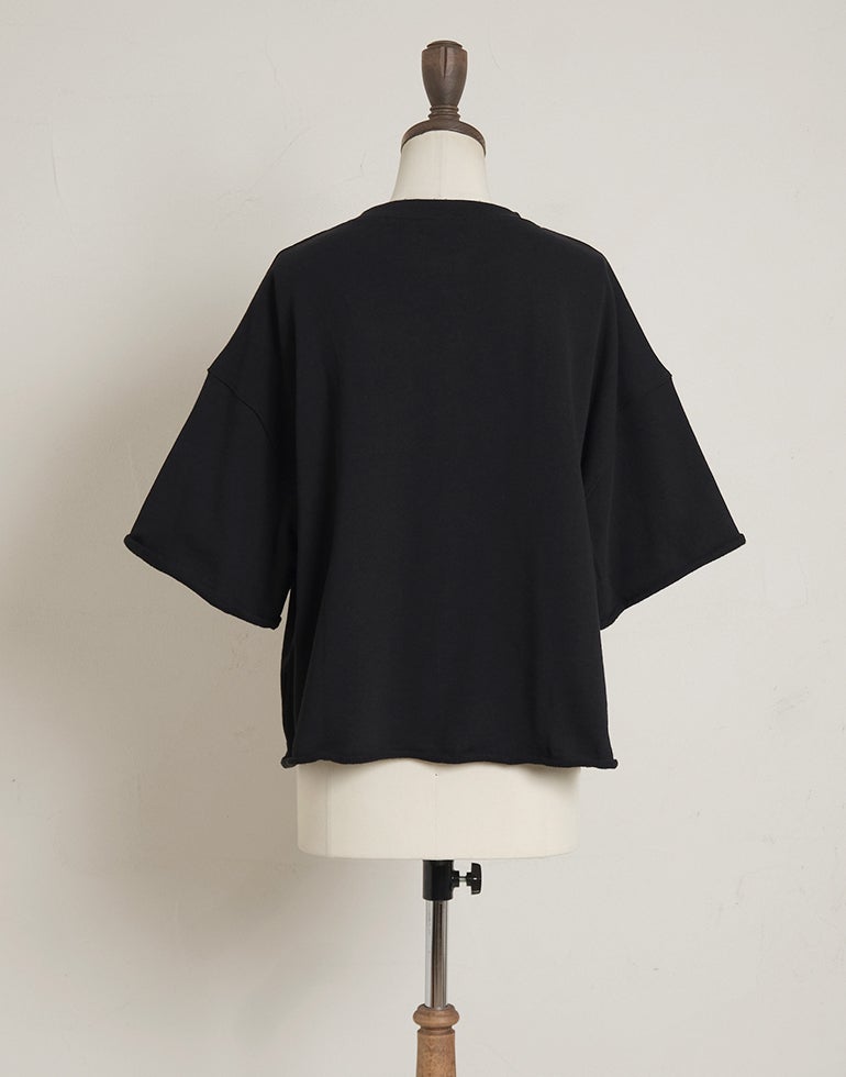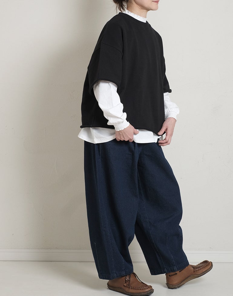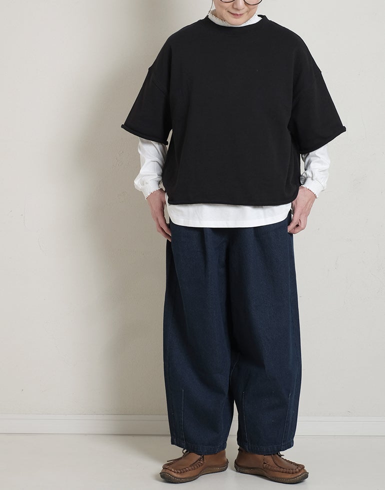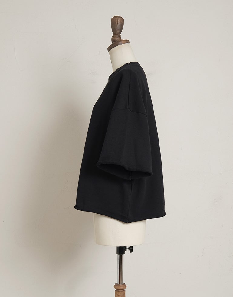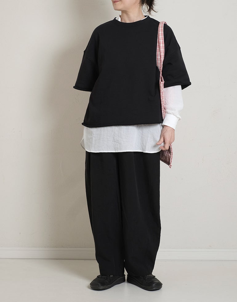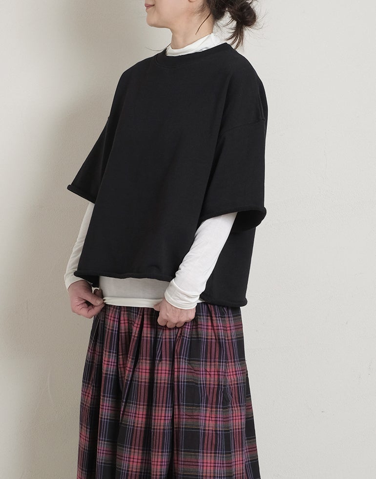 柔らかく滑らかな肌触りで裏は細かいループ状になっており、通気性、吸湿性に優れているミニ裏毛素材。Tシャツ以上・スウェット未満の肉感で春はベストとして、夏はタンクに重ねて1枚で。ワイドな身幅は重ね着しやすく、インナーをチェンジすることで長く着用可能。ドルマンスリーブシルエットが肩のラインを包み込んでくれ華奢な印象に。袖口、裾クルリンとなっている点もポイントです。