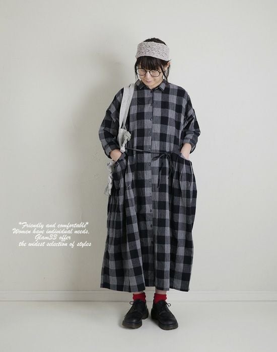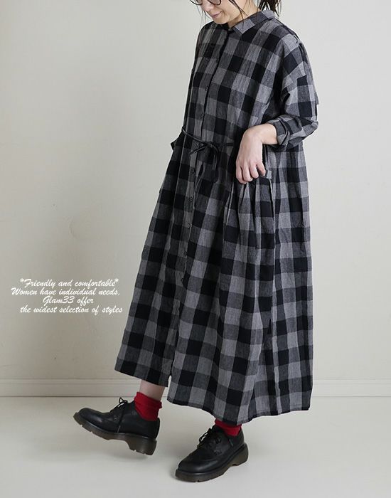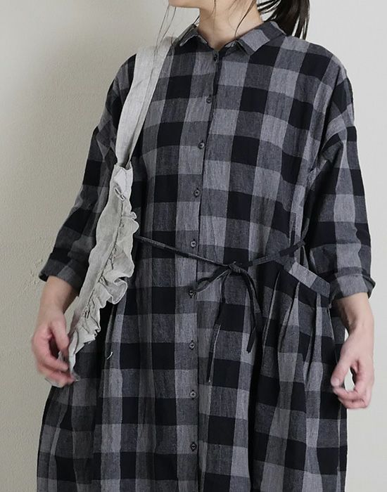 【セール】 LINTY リンティ 019523-ch コットンリネンチェックバックプリーツコートワンピース
