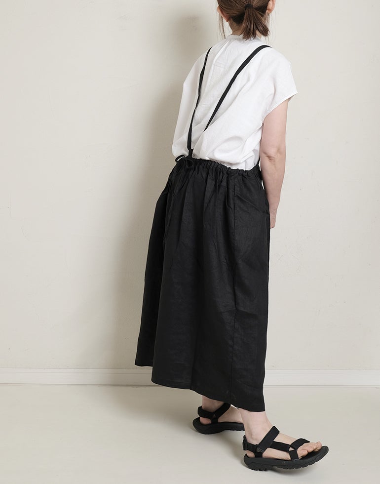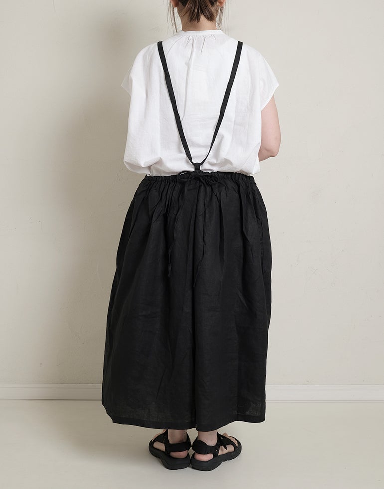 程度な厚みにシャリ感とサラリ感と併せ持つ綿麻素材。ウエストはゴムでゆるっとした雰囲気で楽しんでいただけます。エプロンシルエットなので1枚でさらりと着こなすもあり。インにスカートを重ねたり、ワンピースを重ねたりと・・・いろんなコーデが楽しんでいただけます。肩ひもは自由に調節可能。ウエスト下のタックで、程よくボリューム感を演出。ウエストのバックリボンがワンポイント☆季節問わず、オールシーズンOK!!