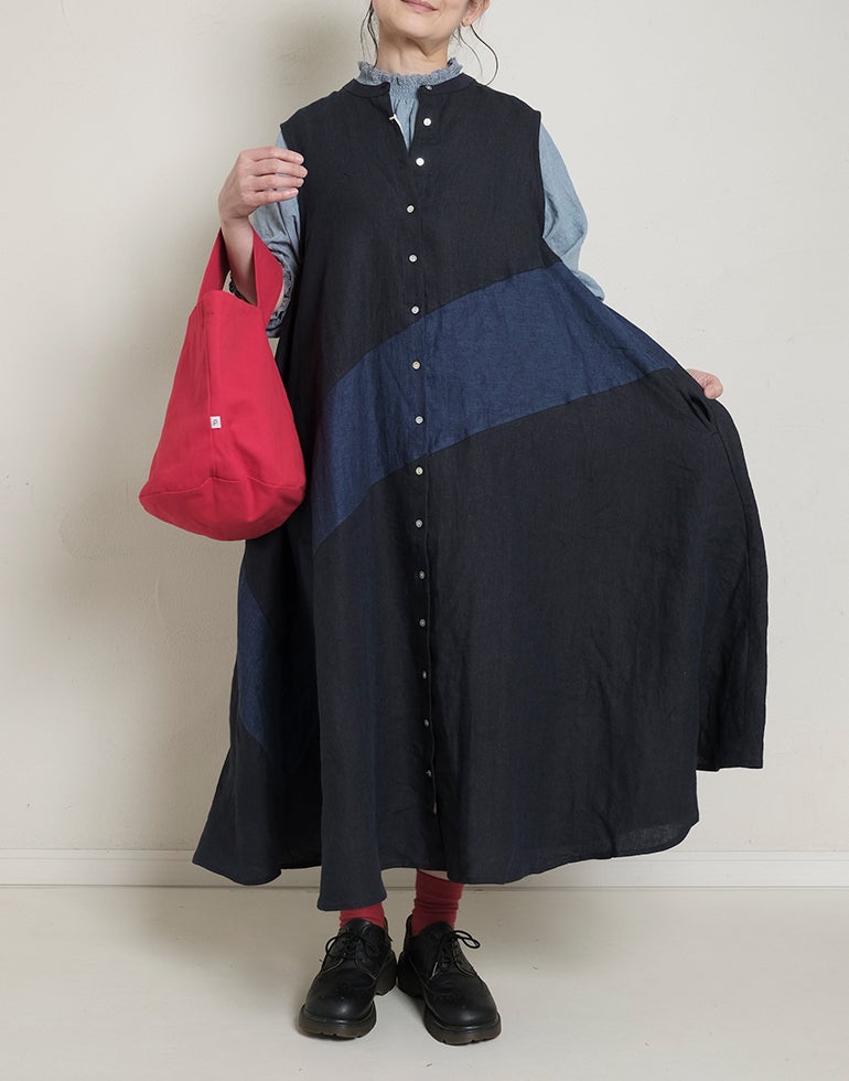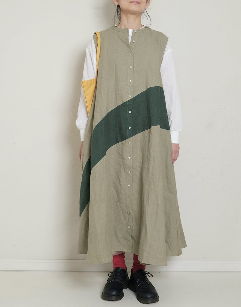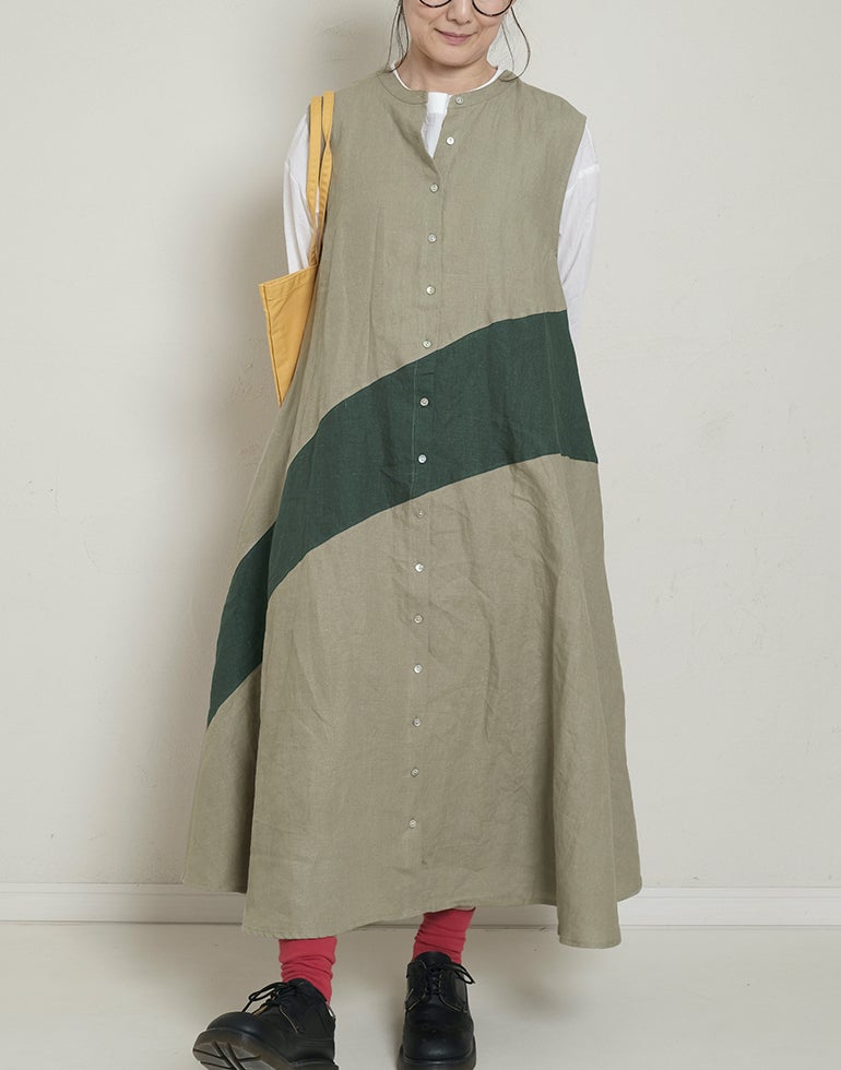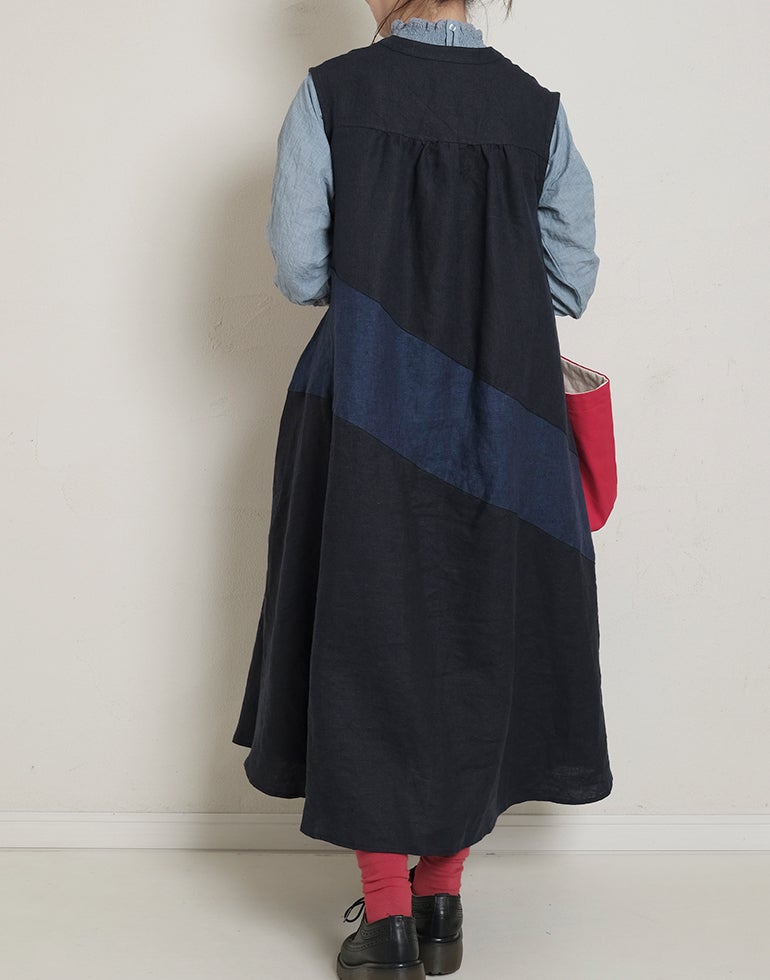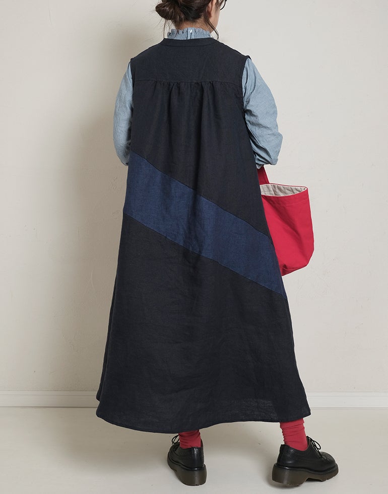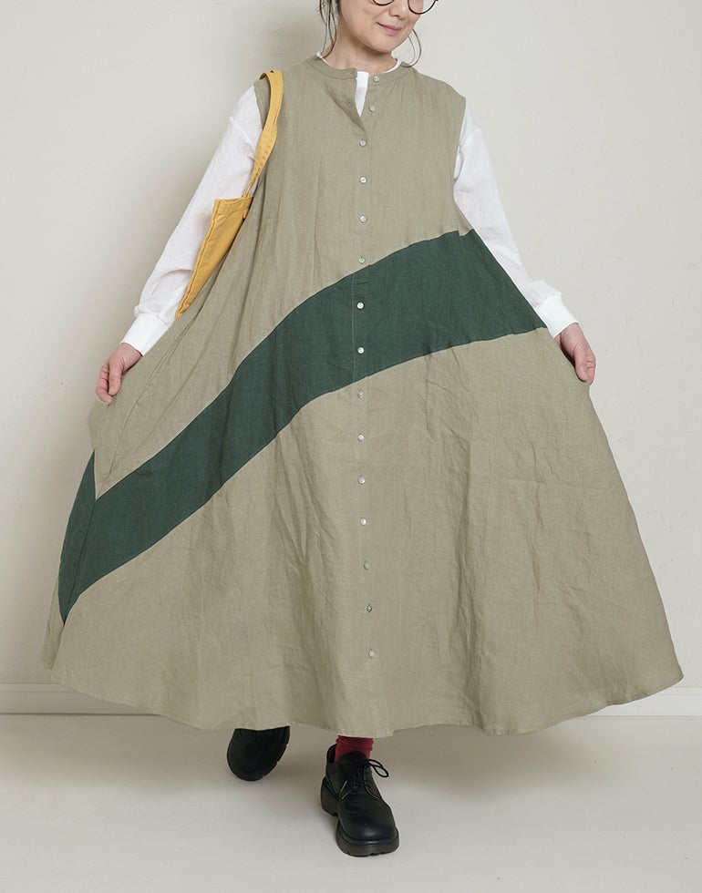 中厚の表情豊かな風合いのリネン素材。配色切替が個性的で存在感あり。背中はギャザー切替でふんわりしたシルエットでゆったりしたデザインでストレスを感じさせない着心地。Aラインのボリュームシルエットが可愛らしい印象に。