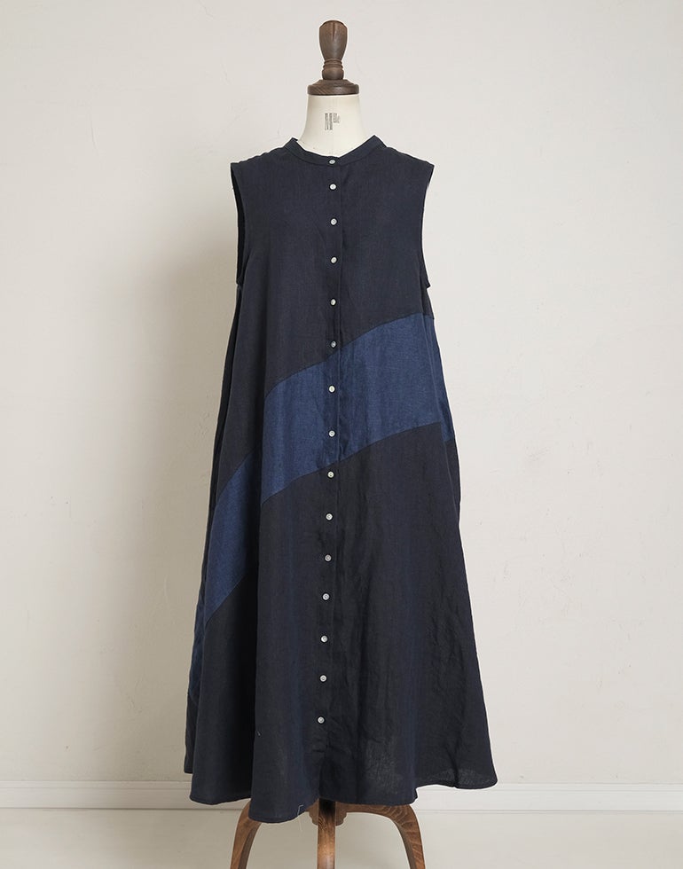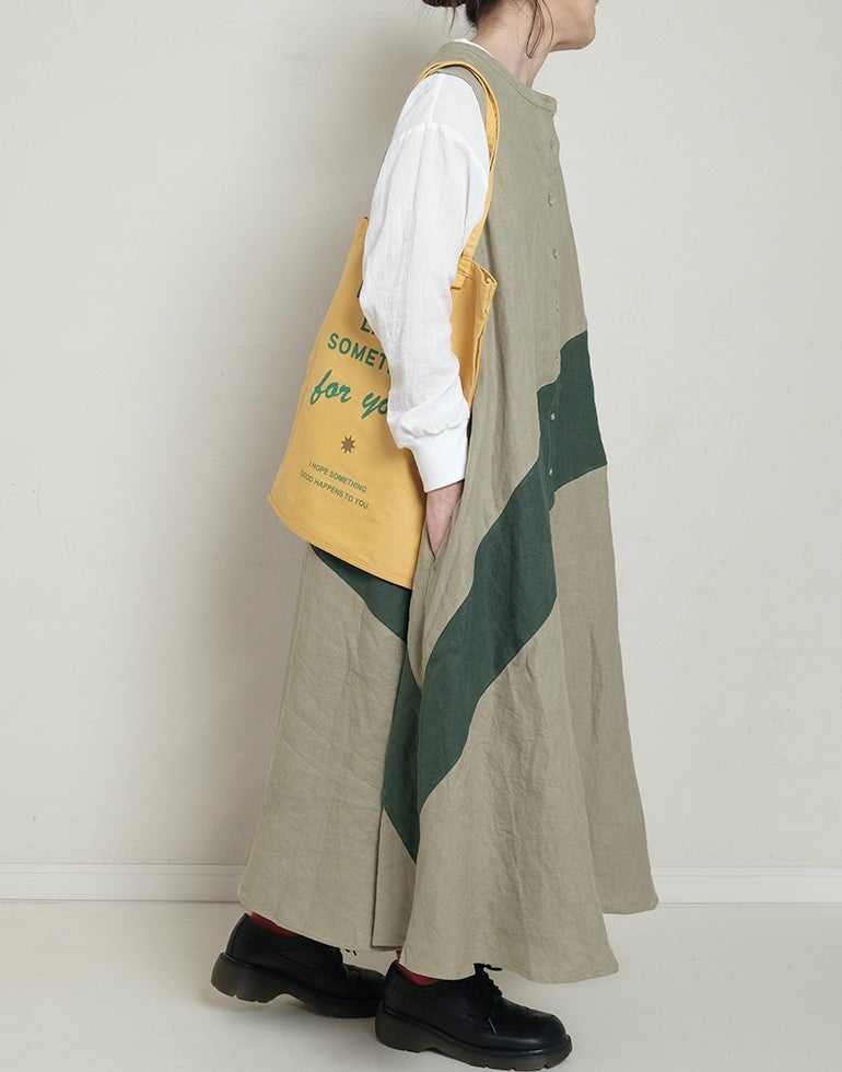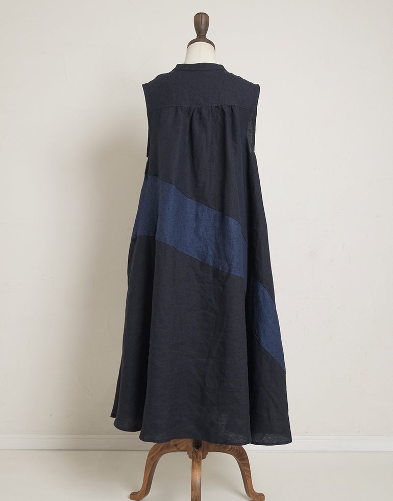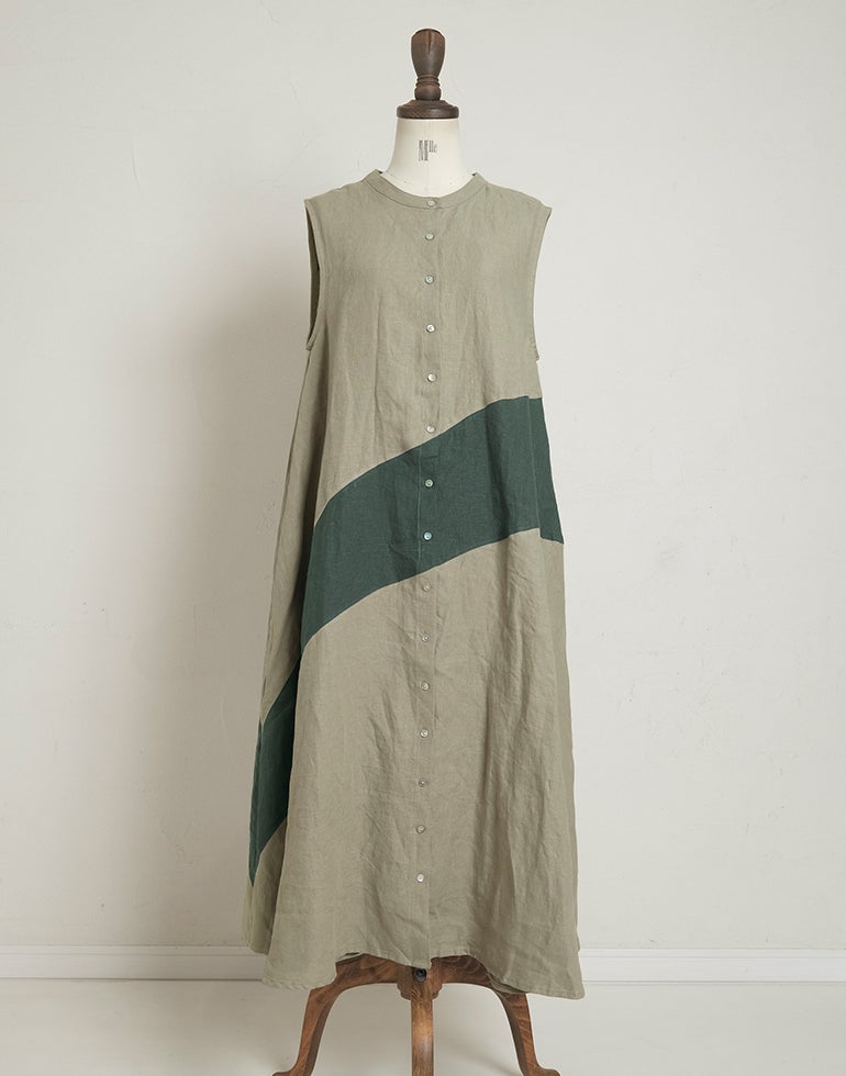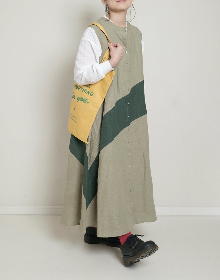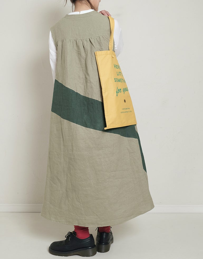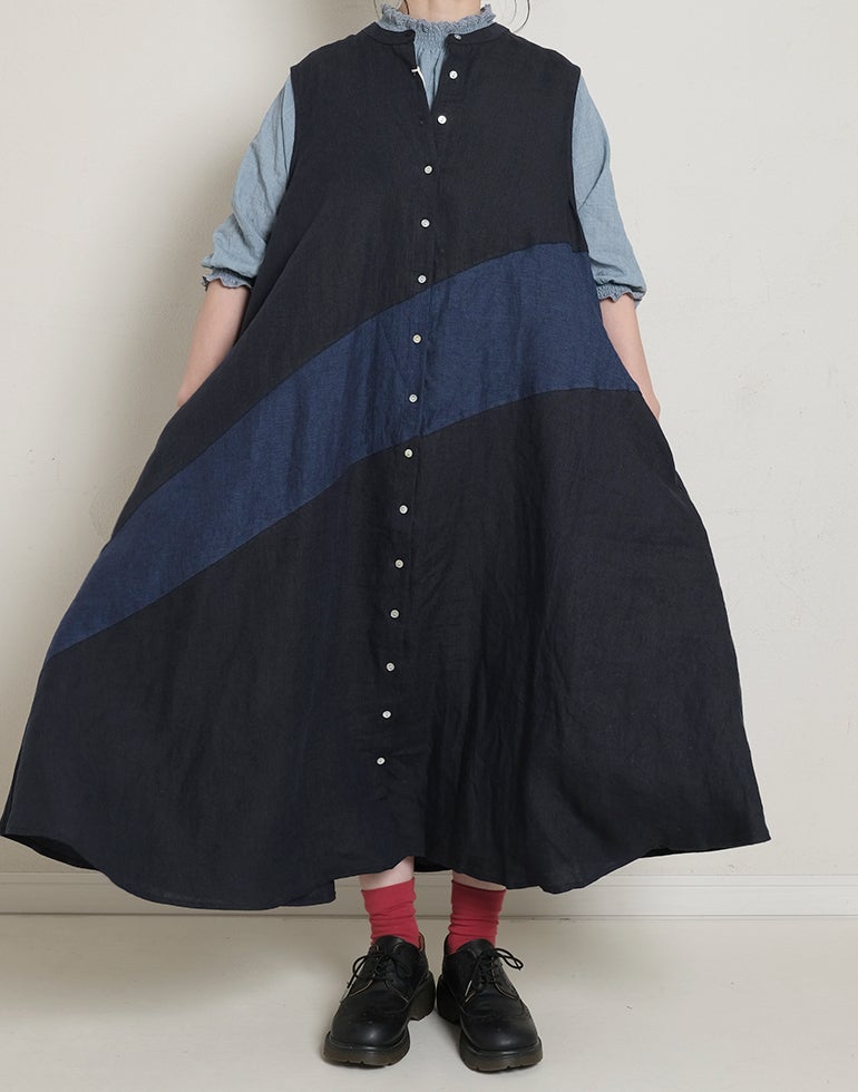 中厚の表情豊かな風合いのリネン素材。配色切替が個性的で存在感あり。背中はギャザー切替でふんわりしたシルエットでゆったりしたデザインでストレスを感じさせない着心地。Aラインのボリュームシルエットが可愛らしい印象に。