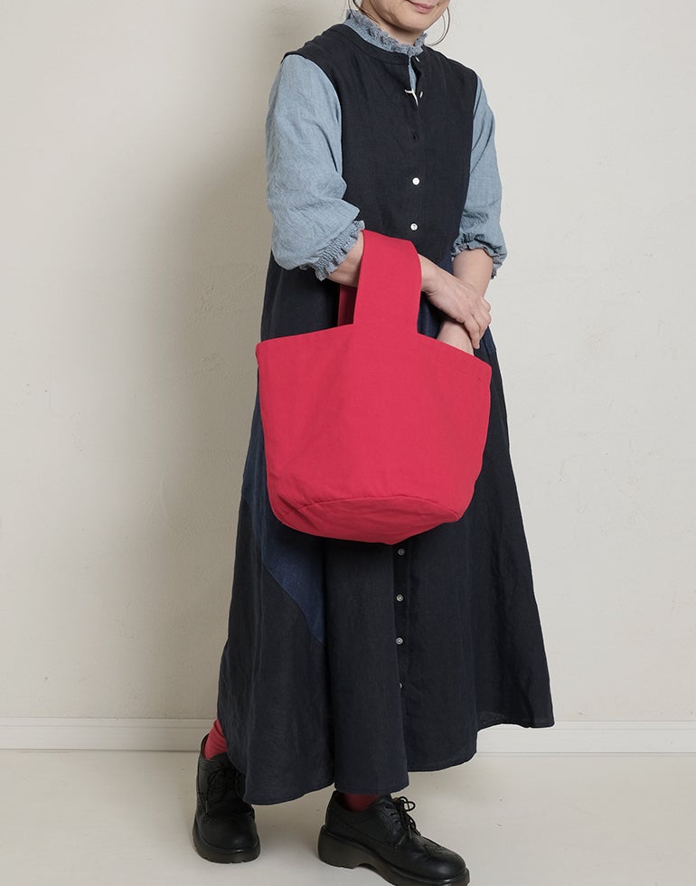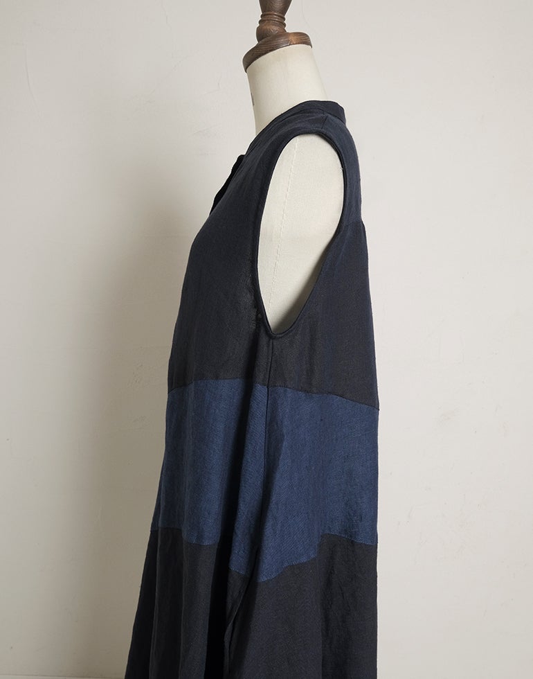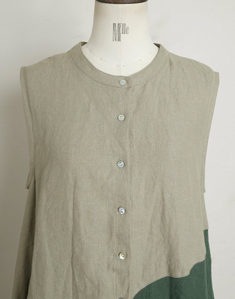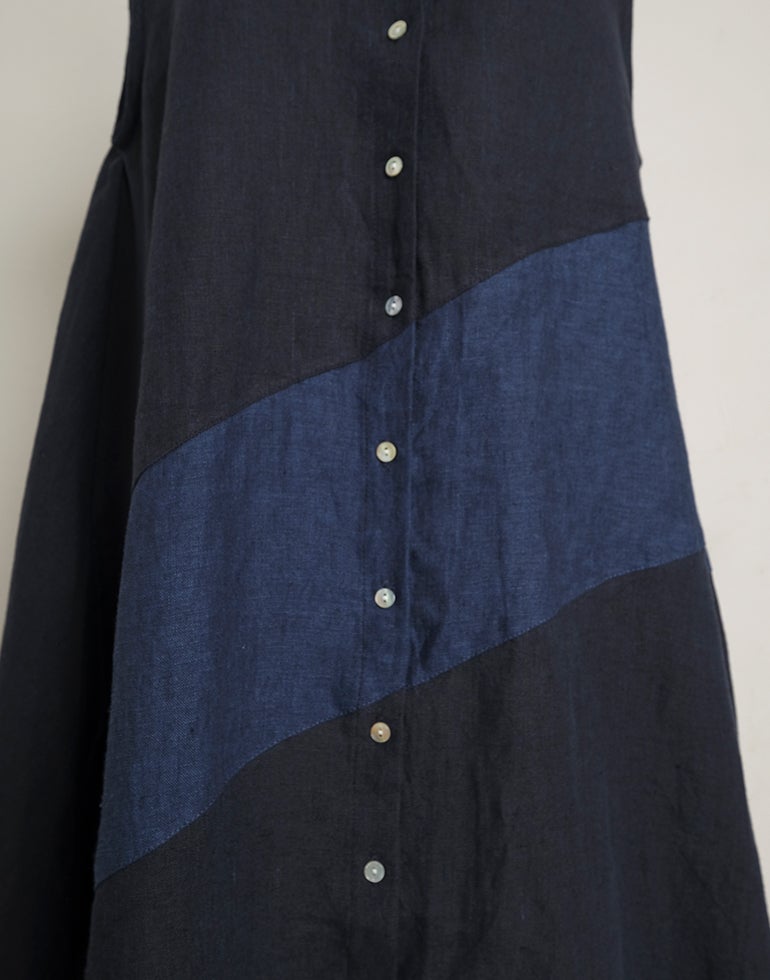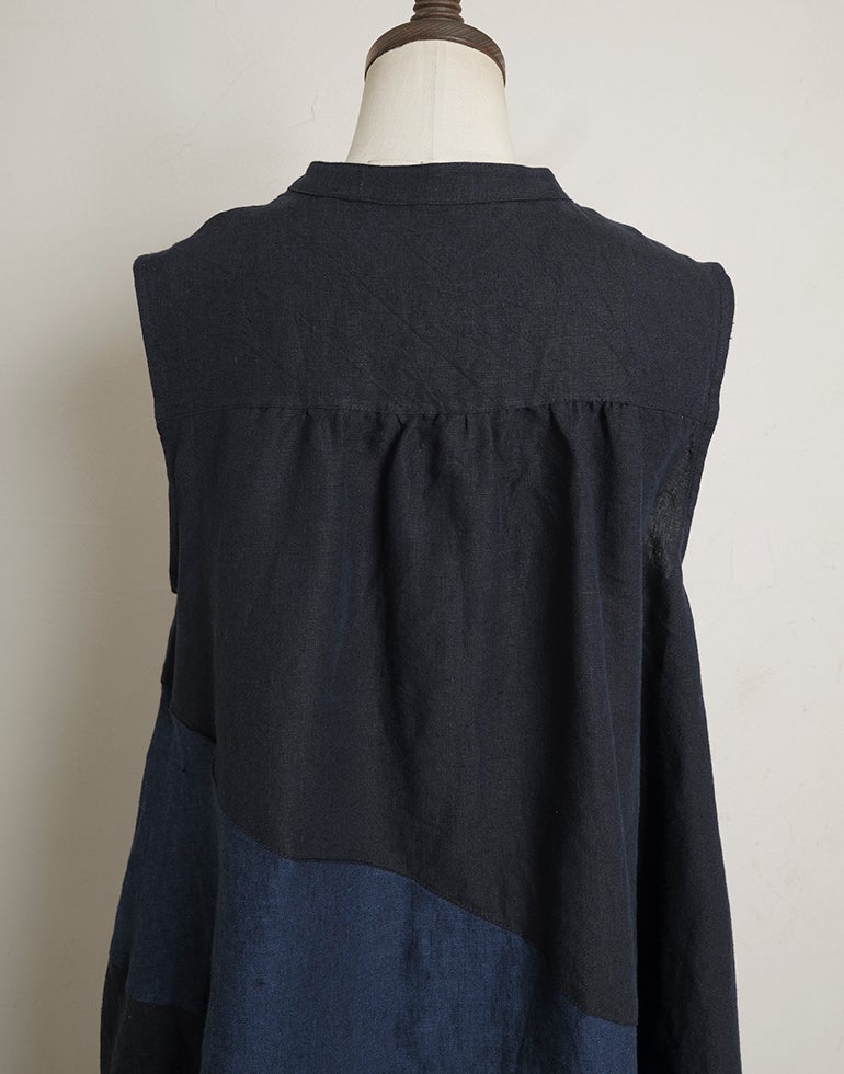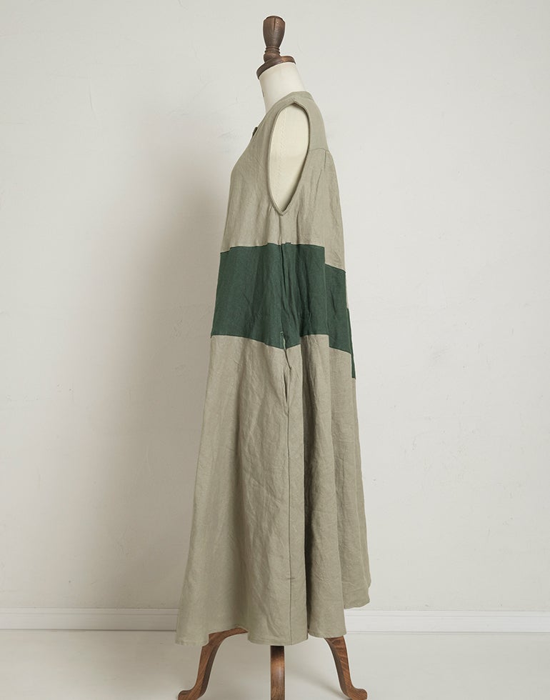 中厚の表情豊かな風合いのリネン素材。配色切替が個性的で存在感あり。背中はギャザー切替でふんわりしたシルエットでゆったりしたデザインでストレスを感じさせない着心地。Aラインのボリュームシルエットが可愛らしい印象に。