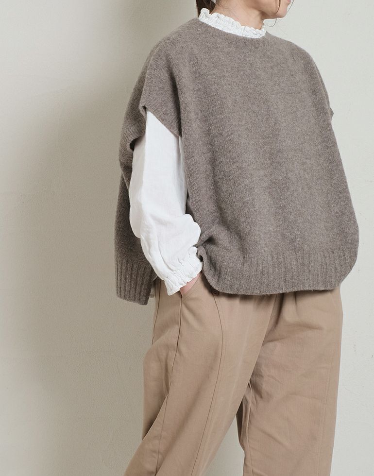 MADE IN JAPAN。国内で技術を生かし、湧き水の超軟水で加工し、肌あたりの良い風合いを「SO独自の加工レシピ」で実現されたウール100%の1枚です。そんな1枚をお試しください。脇に入れたガータ編みにワイドなシルエットにドロップショルダーでヌケ感のあるシルエットに。インナーを選ばず嵩張ることなくレイヤードが楽しめます。