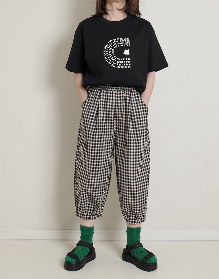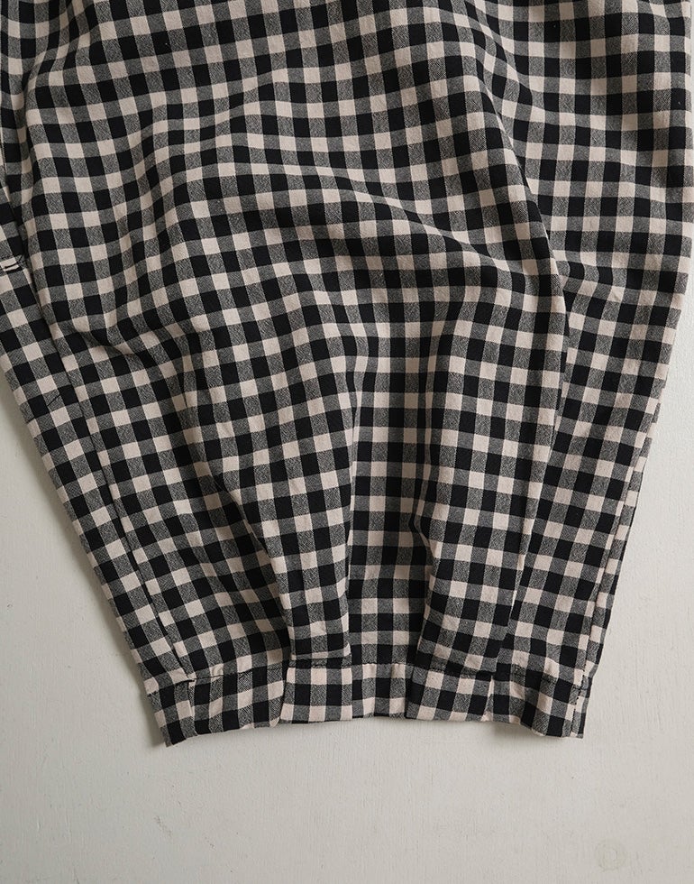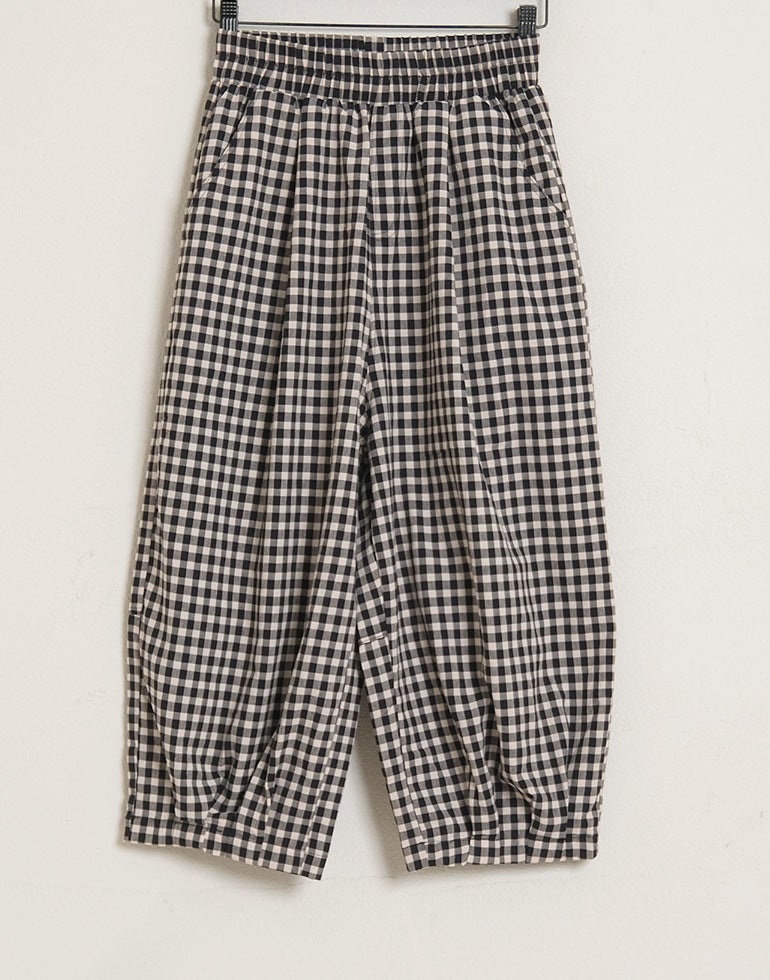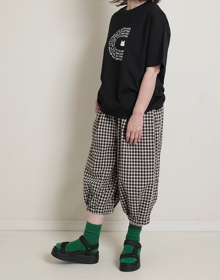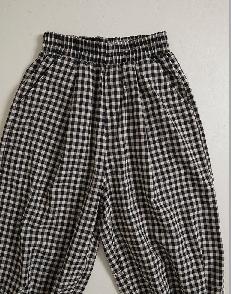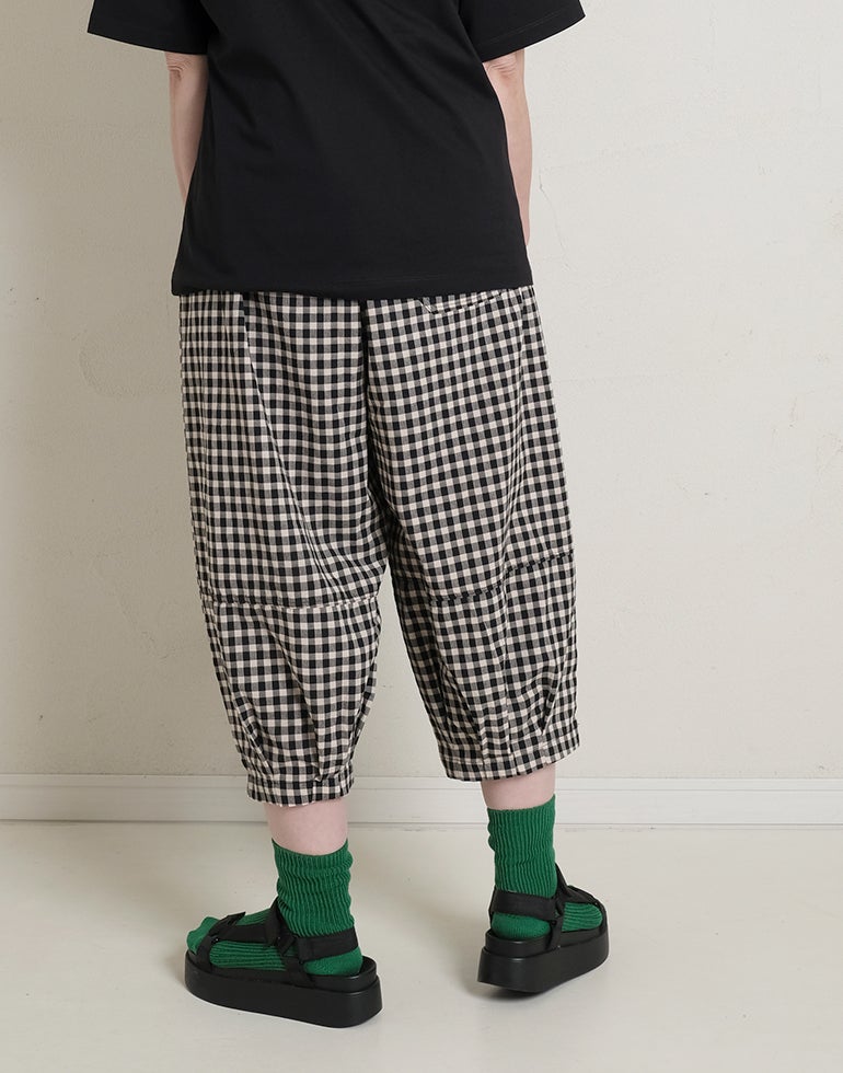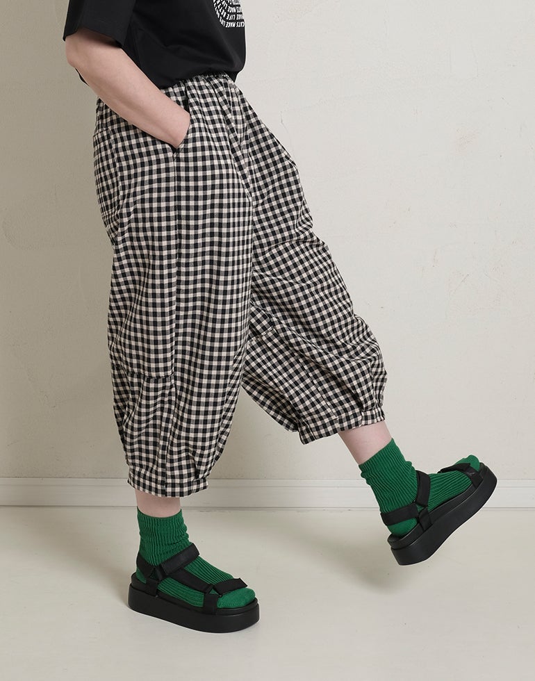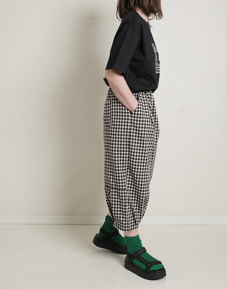 軽くてサラリとした肌触りの綿素材。ウエストは総ゴム仕様。股上深く、ヒップラインをカバーしてくれるゆるっとパンツ。リラックスな履き心地でいて落ち着いた配色のチェック柄でシーズンレスで着こなせるシックな雰囲気に。バックふくらはぎ部分に切替を施しアクセントに。足首が見える軽やかな丈感でワンピースのレイヤードにも役に立ちます。