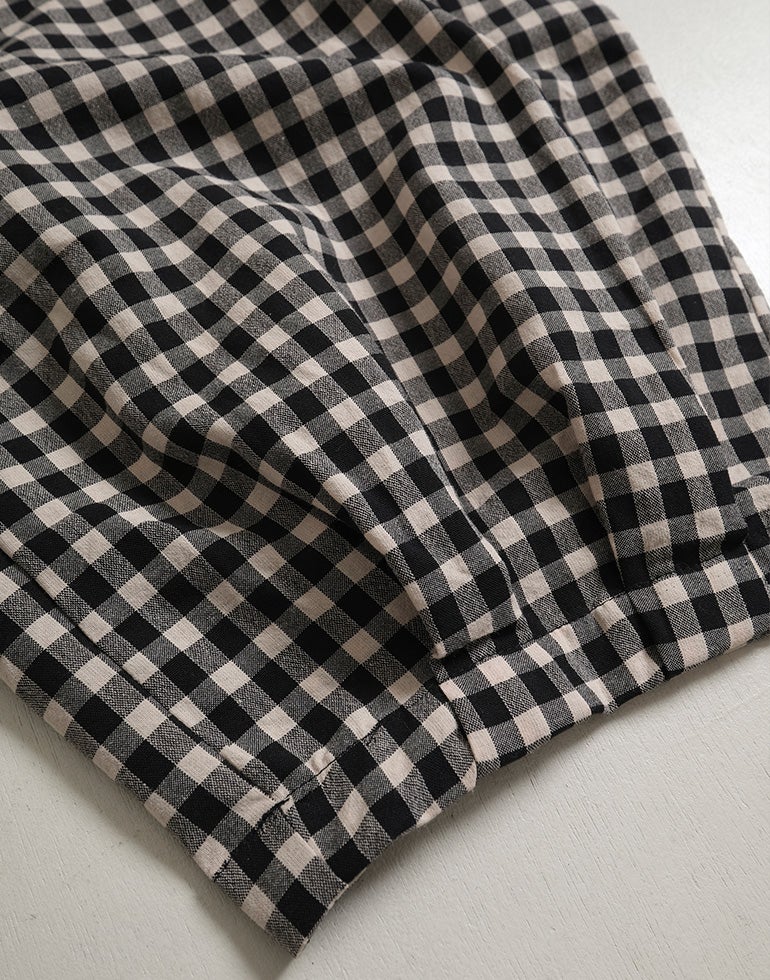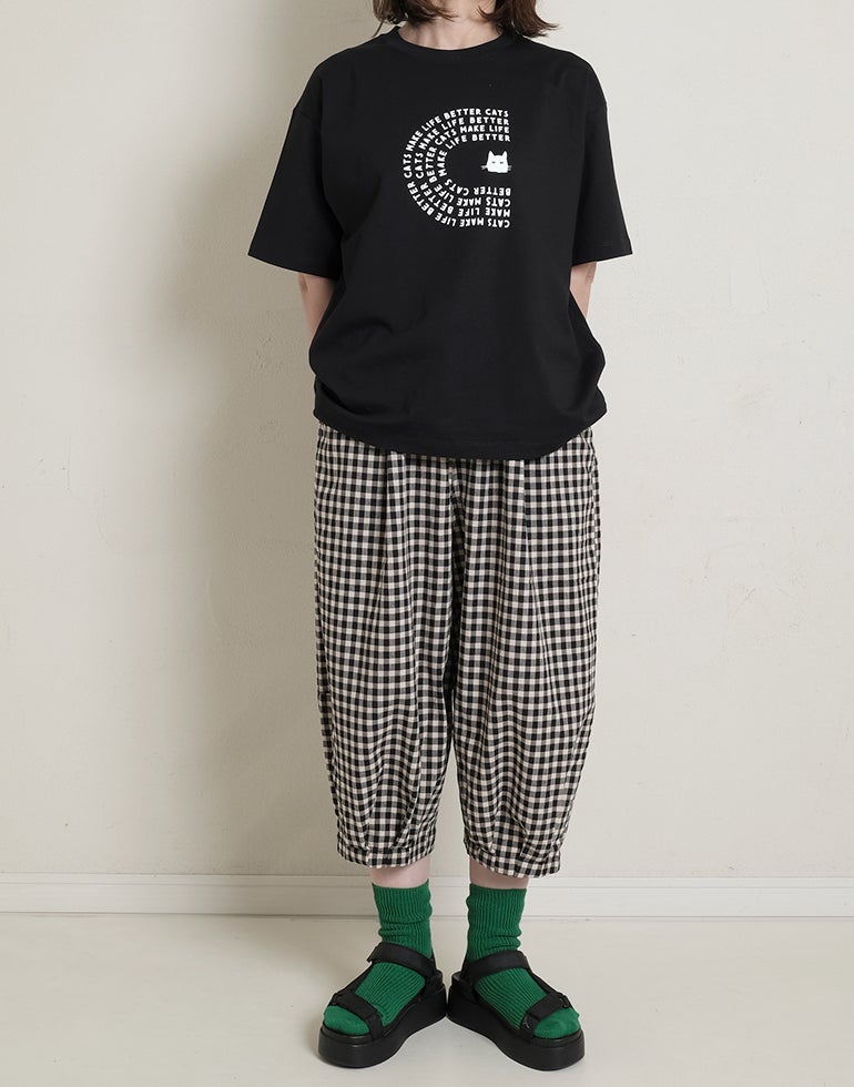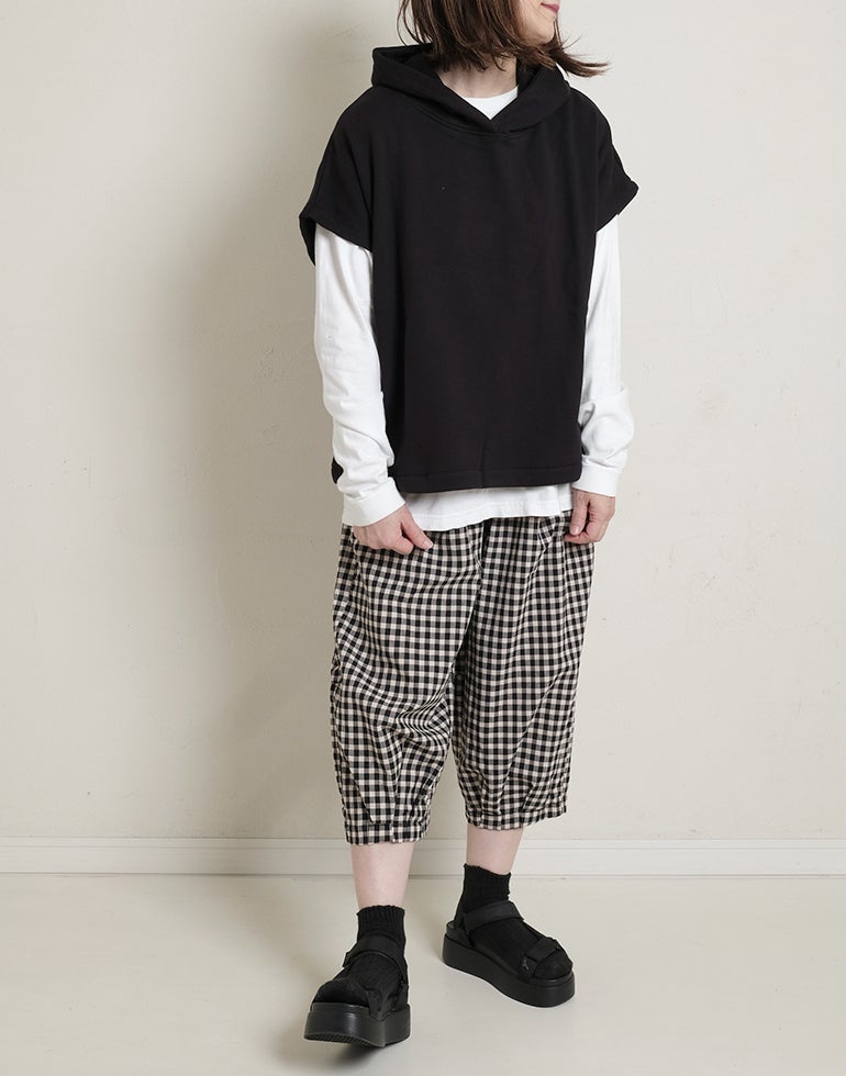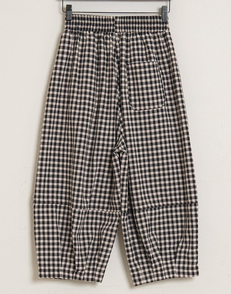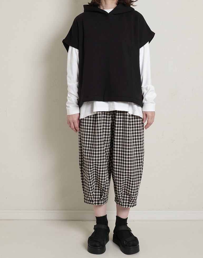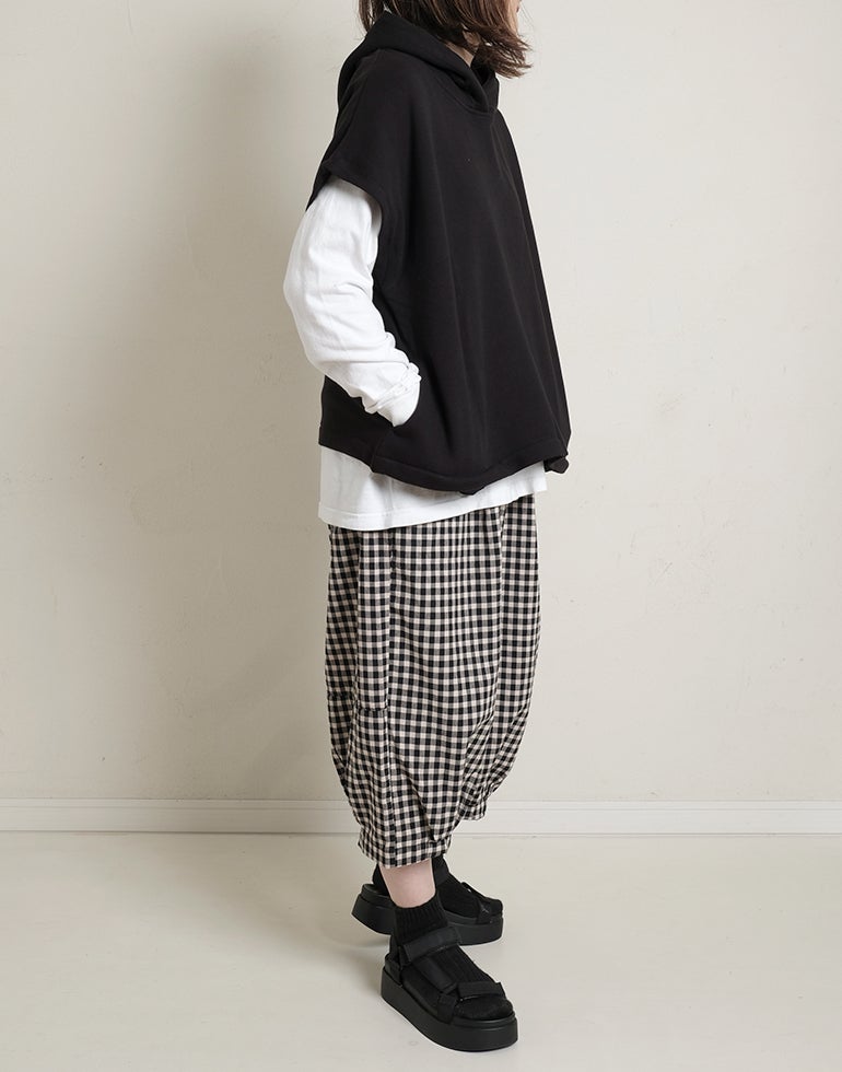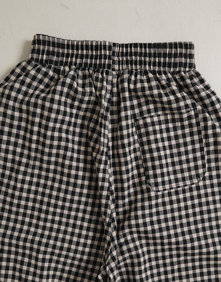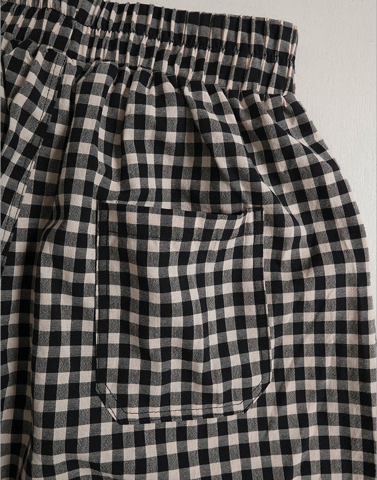 軽くてサラリとした肌触りの綿素材。ウエストは総ゴム仕様。股上深く、ヒップラインをカバーしてくれるゆるっとパンツ。リラックスな履き心地でいて落ち着いた配色のチェック柄でシーズンレスで着こなせるシックな雰囲気に。バックふくらはぎ部分に切替を施しアクセントに。足首が見える軽やかな丈感でワンピースのレイヤードにも役に立ちます。