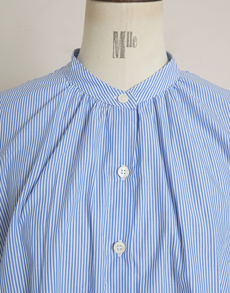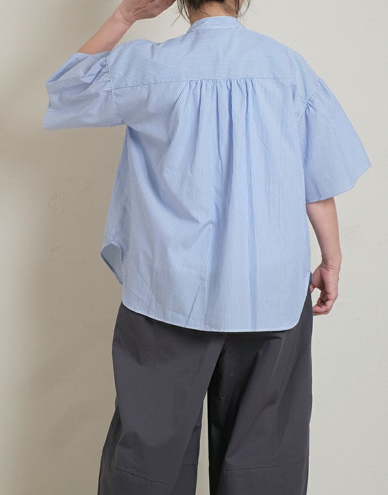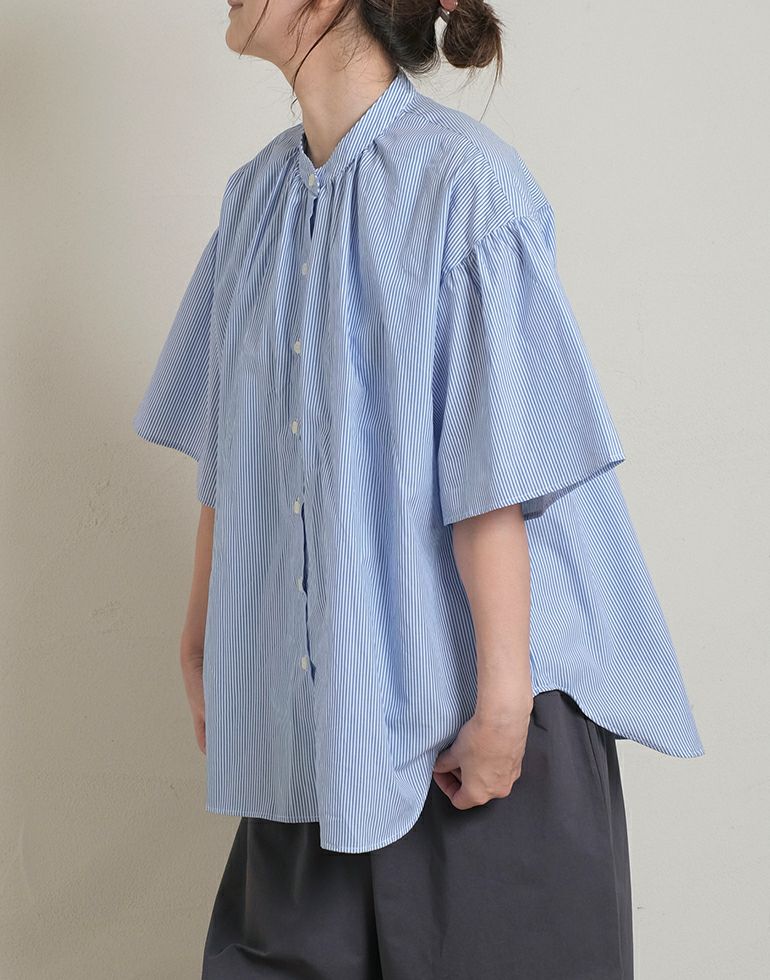 さらっとした肌触りに軽い着心地のコットン素材。肌に触れない程よいゆったりサイズが暑い時期も快適な着心地に。袖はフレアーシルエットで動くたびにふわりと揺れる動きのあるデザインが可愛いです。背中は切替を施し細かくギャザーを寄せ女性らしい印象に。